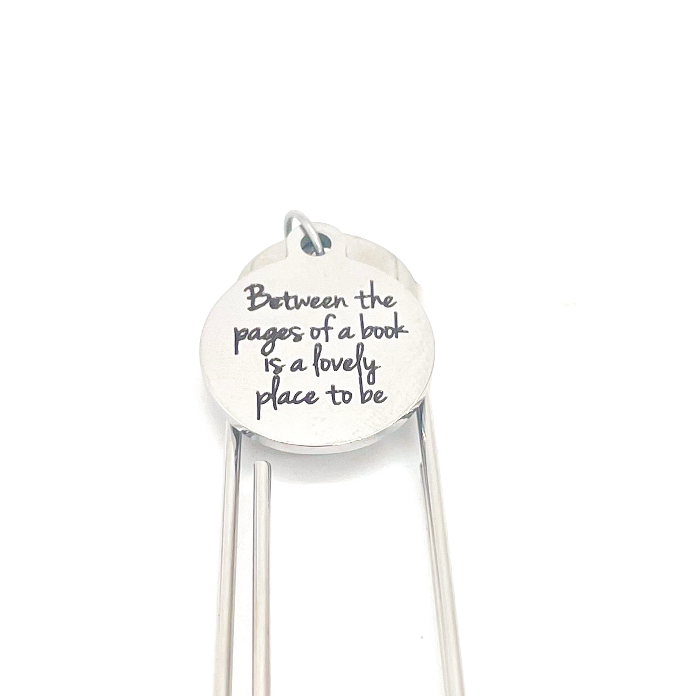 This bookmark would be a great gift for a reader. It has a stainless steel engraved charm with “Between the pages of a book is a lovely place to be”.
