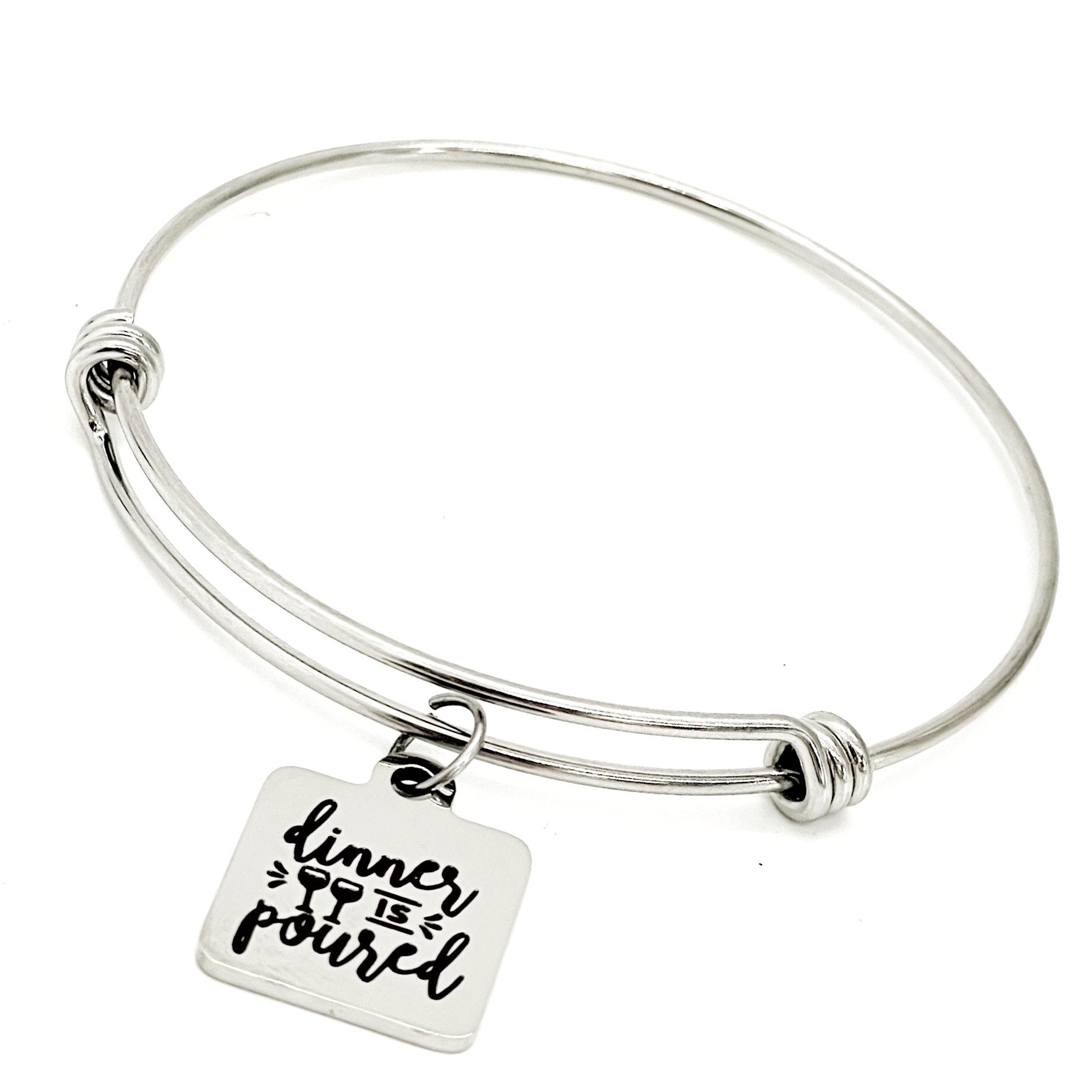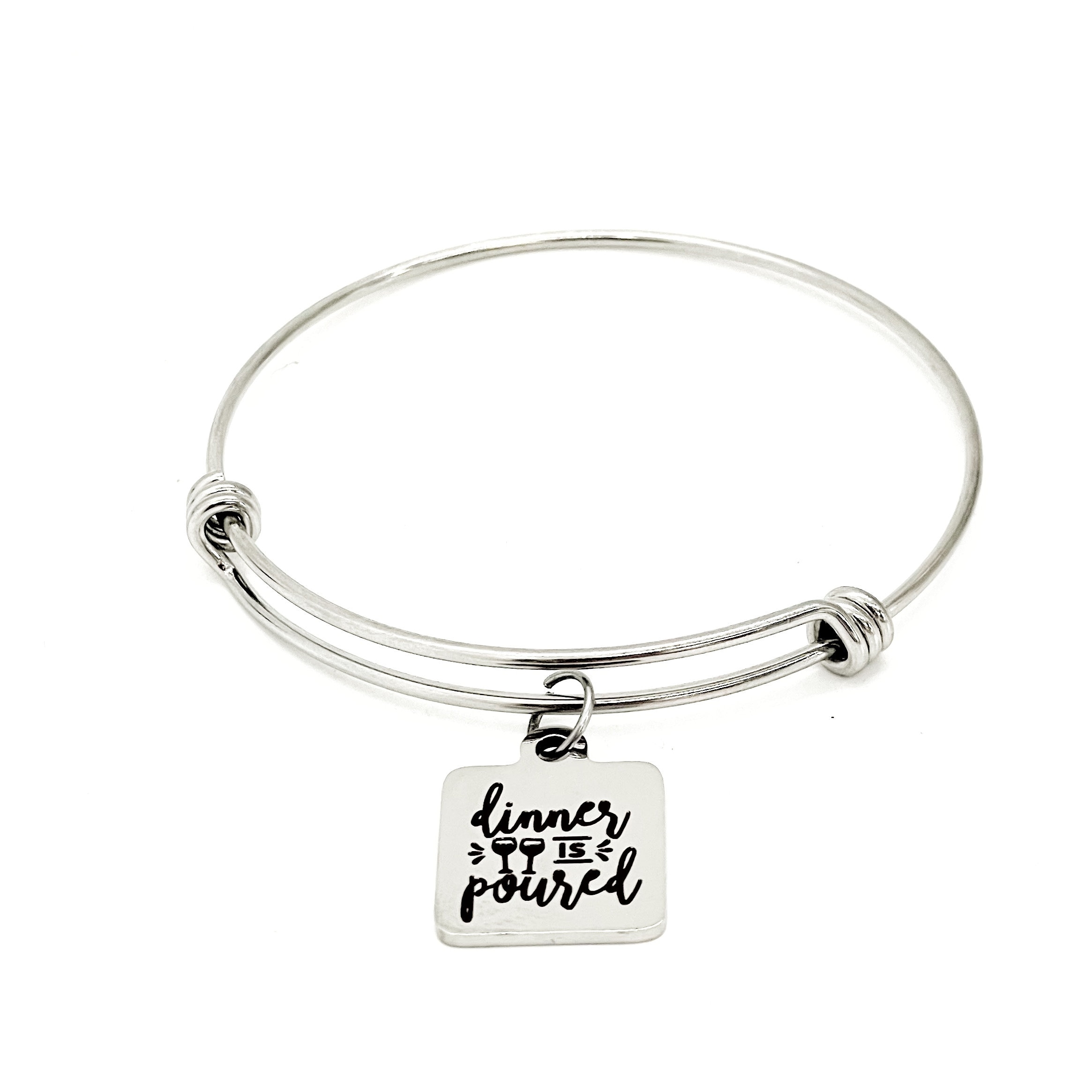 This is a beautiful bangle bracelet with a laser engraved stainless steel charm that has “Dinner is poured” on it.
