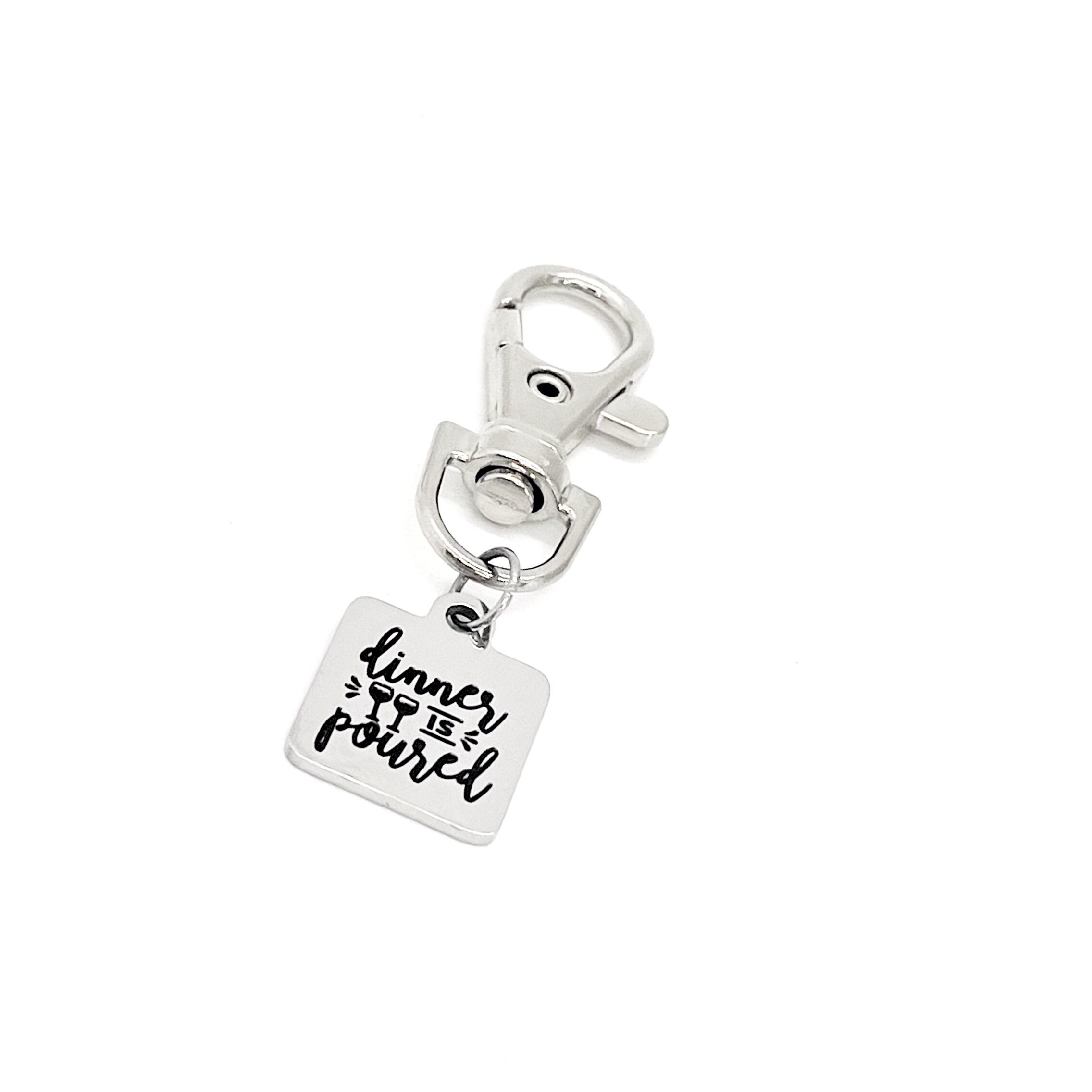 This is a great zipper pull or bag charm clip gift that would be a great gift. It would be a great charm to clip onto a tote, purse, sports bag, book bag or keychain. It has a engraved charm with “Dinner is poured” on it.