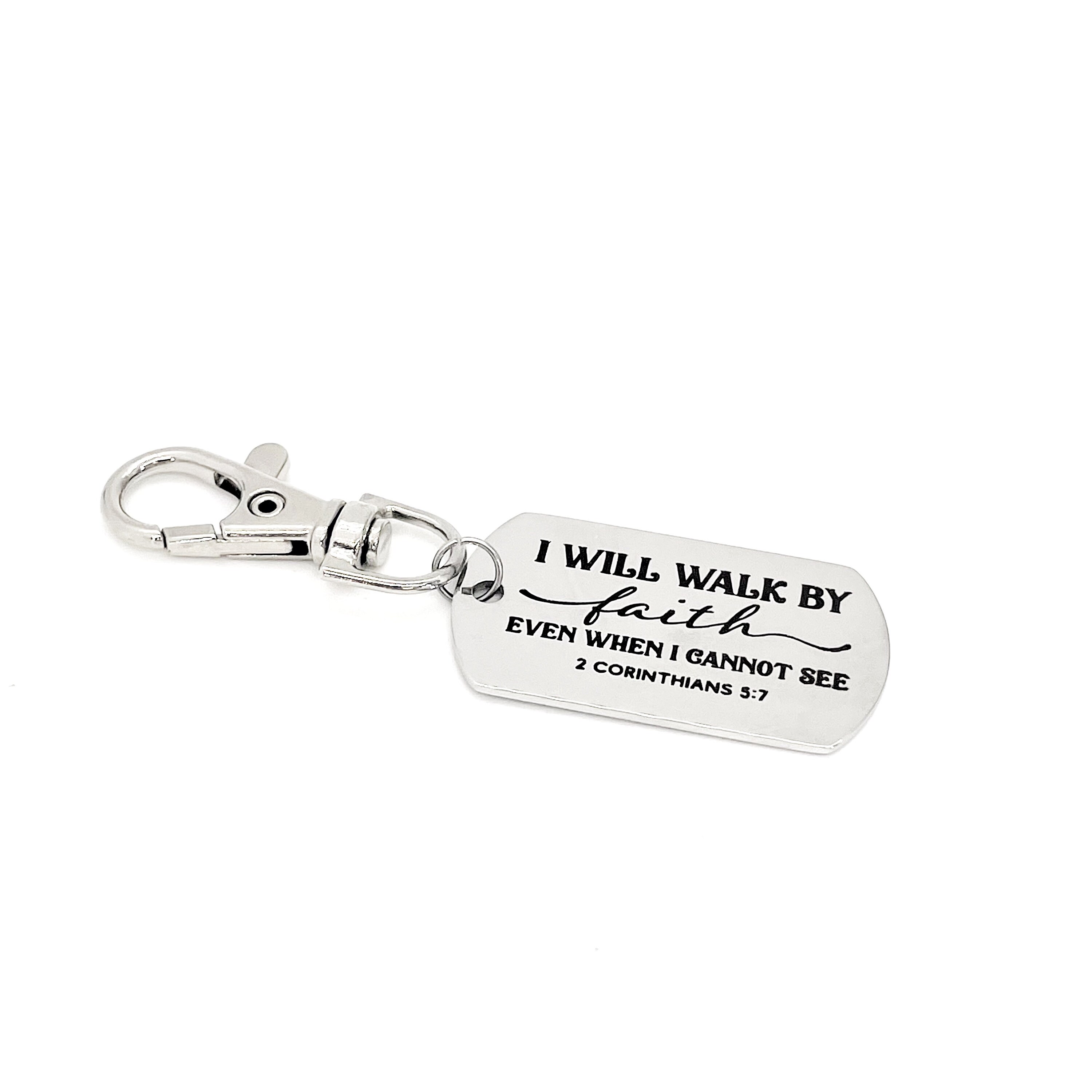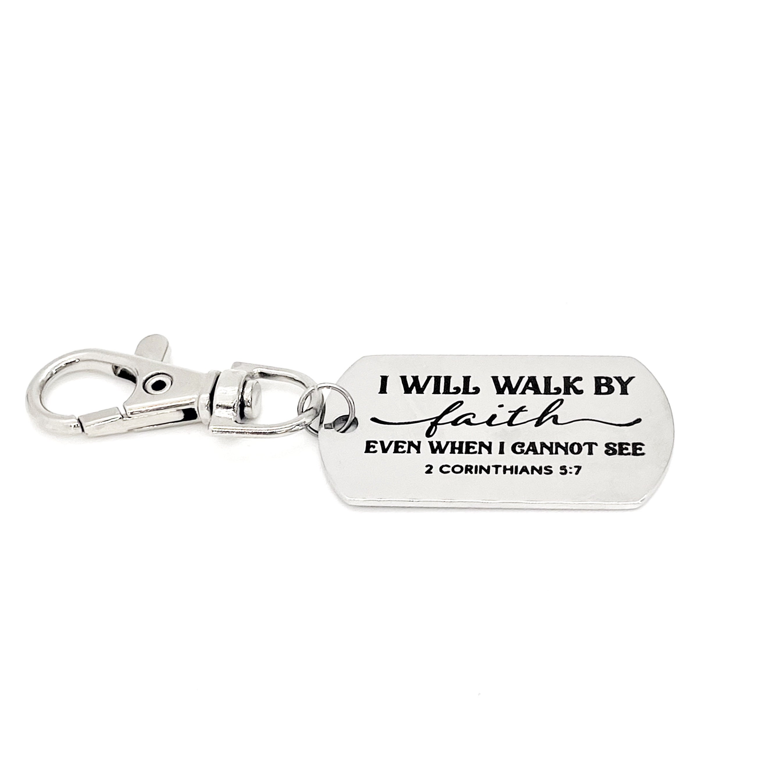 This is a great zipper pull or bag charm clip gift that would be a great gift. It would be a great charm to clip onto a tote, purse, sports bag, book bag or keychain. It has a engraved charm with “I will walk by faith even when I cannot see” from 2 Corinthians 5:7 on it.