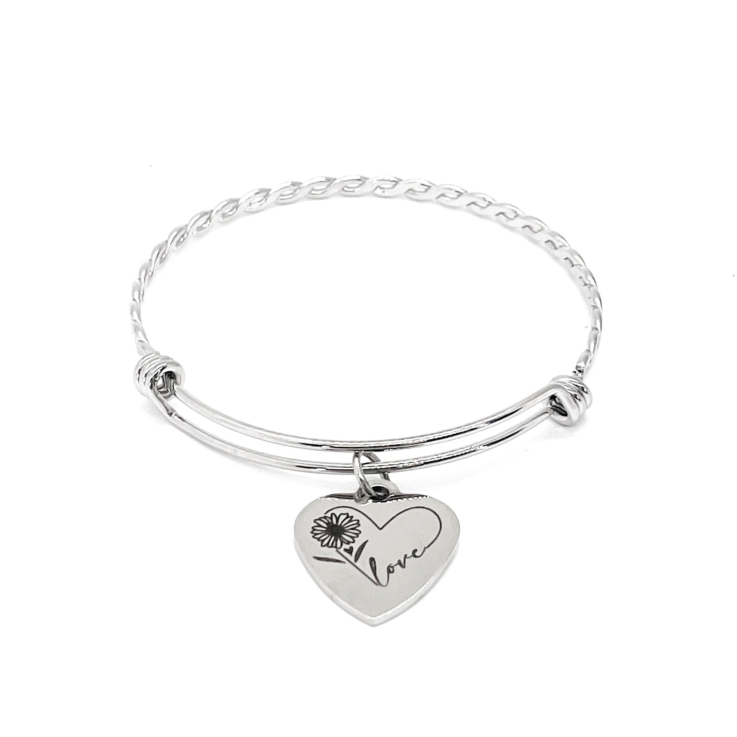 This is a beautiful stainless steel bracelet with an engraved charm with “Love” on it. The charm measures approx. 1/2 inch across