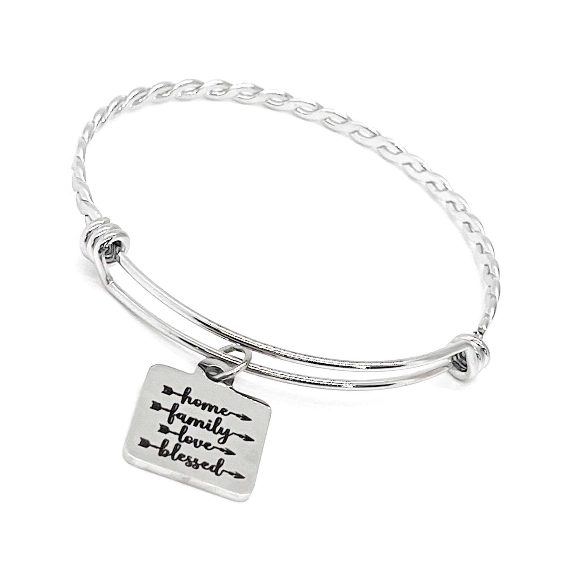 This is a beautiful stainless steel bracelet with an engraved charm with “home family love blessed” on it. The charm measures approx. 1/2 inch across