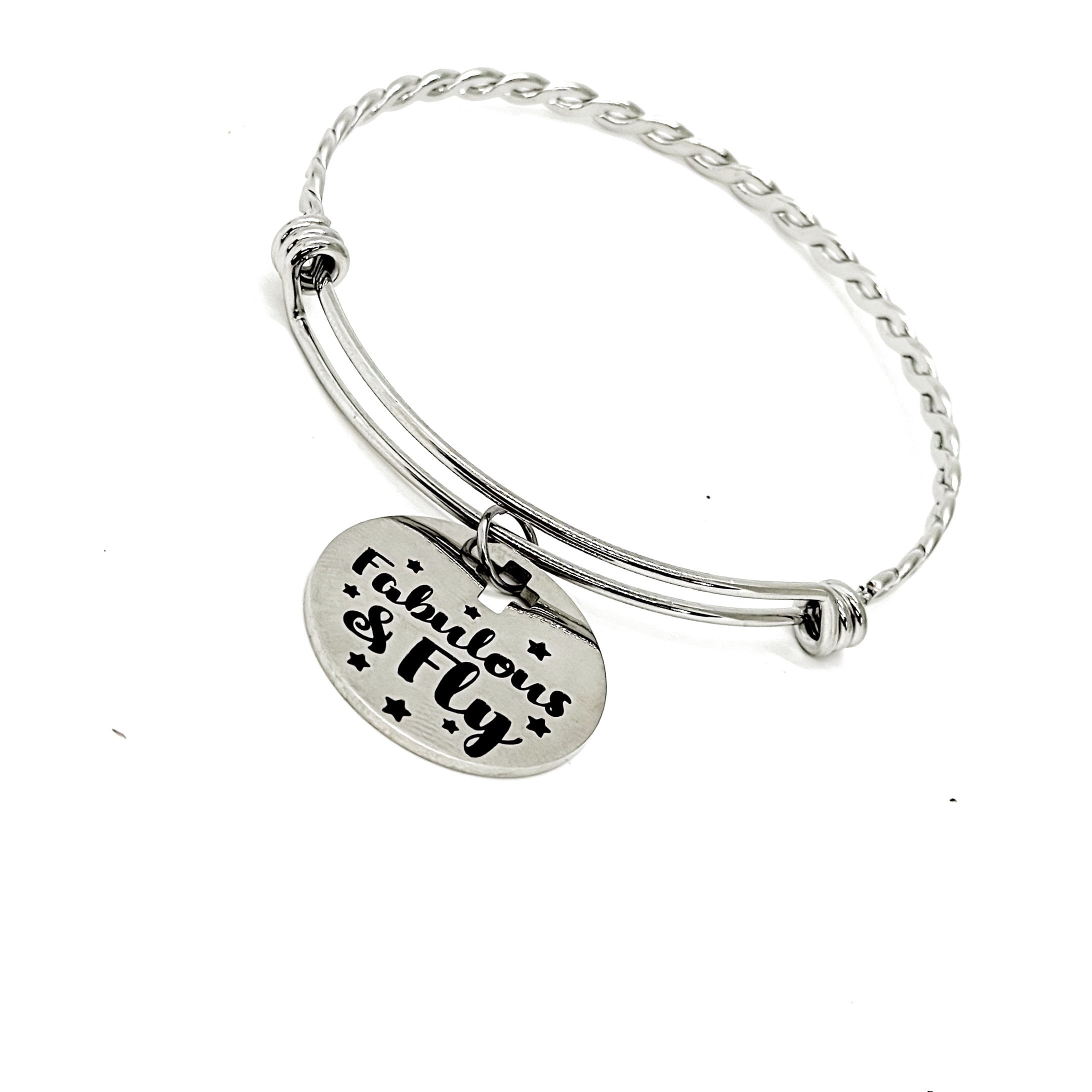 This is a beautiful stainless steel bracelet with an engraved charm with “Fabulous & Fly” on it. The charm measures approx. 1 inch across