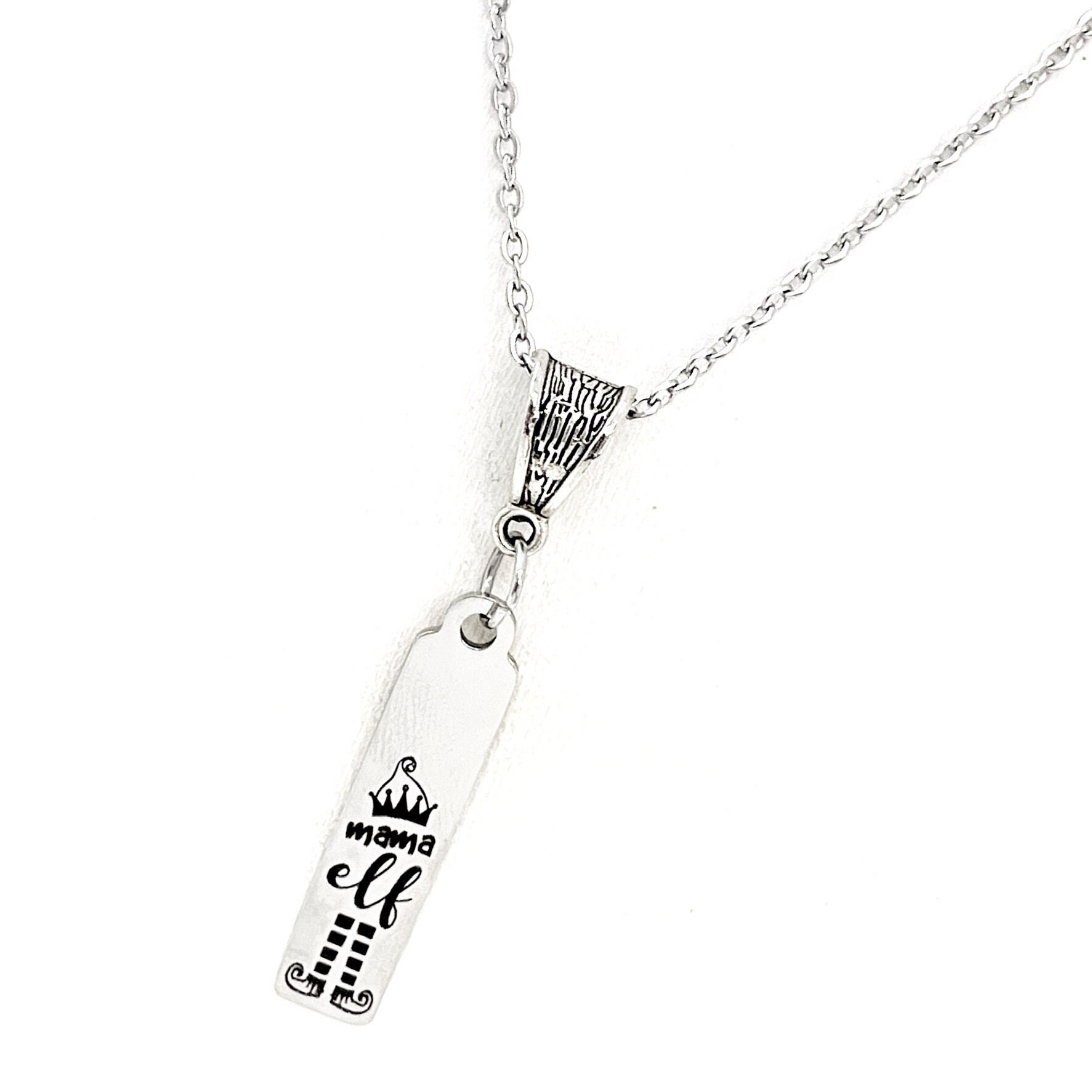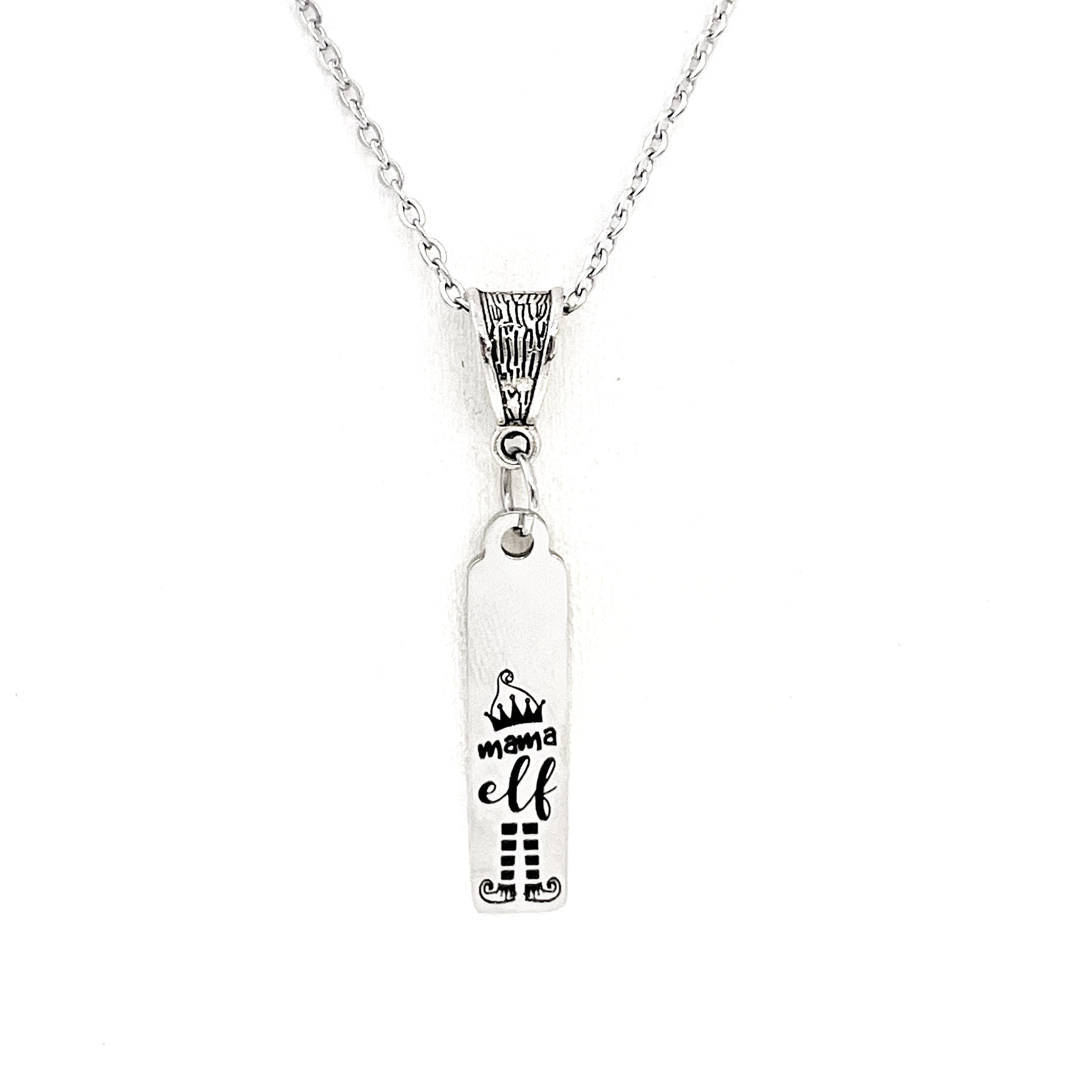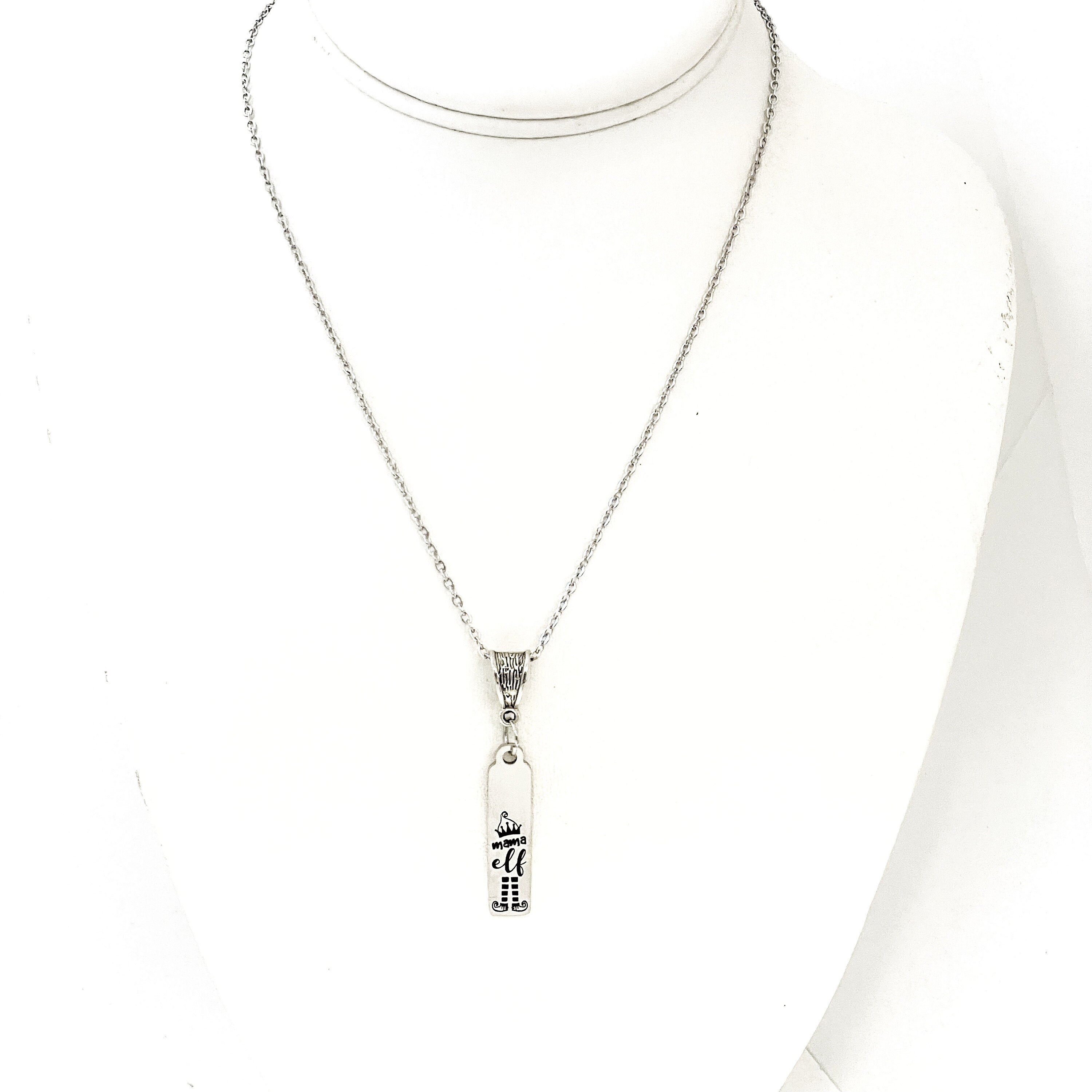 This is a stainless steel laser engraved pendant on a stainless steel chain and a silvertone bail. The pendant has “Mama Elf” on it.