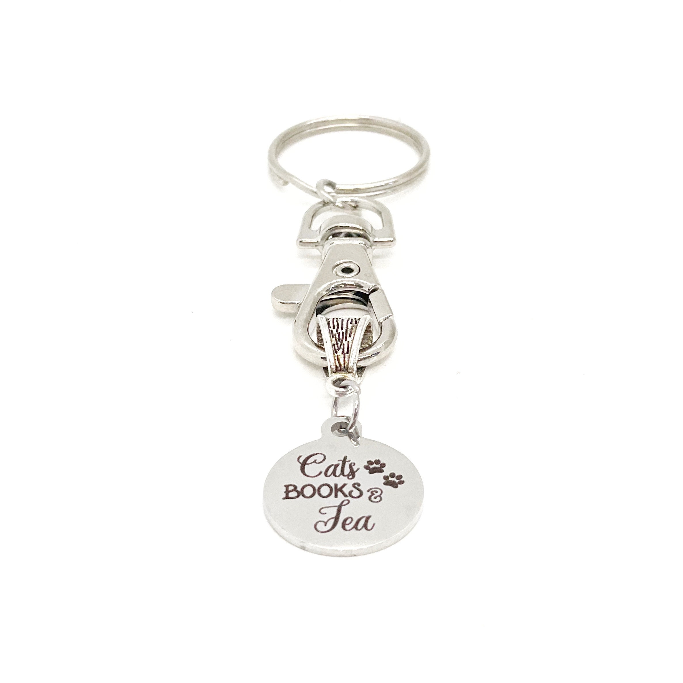 This is a great keychain that has a stainless steel laser engraved charm which says, "Cats Books Tea”.