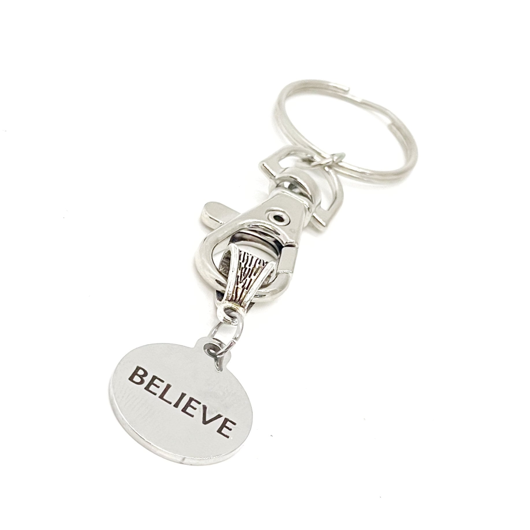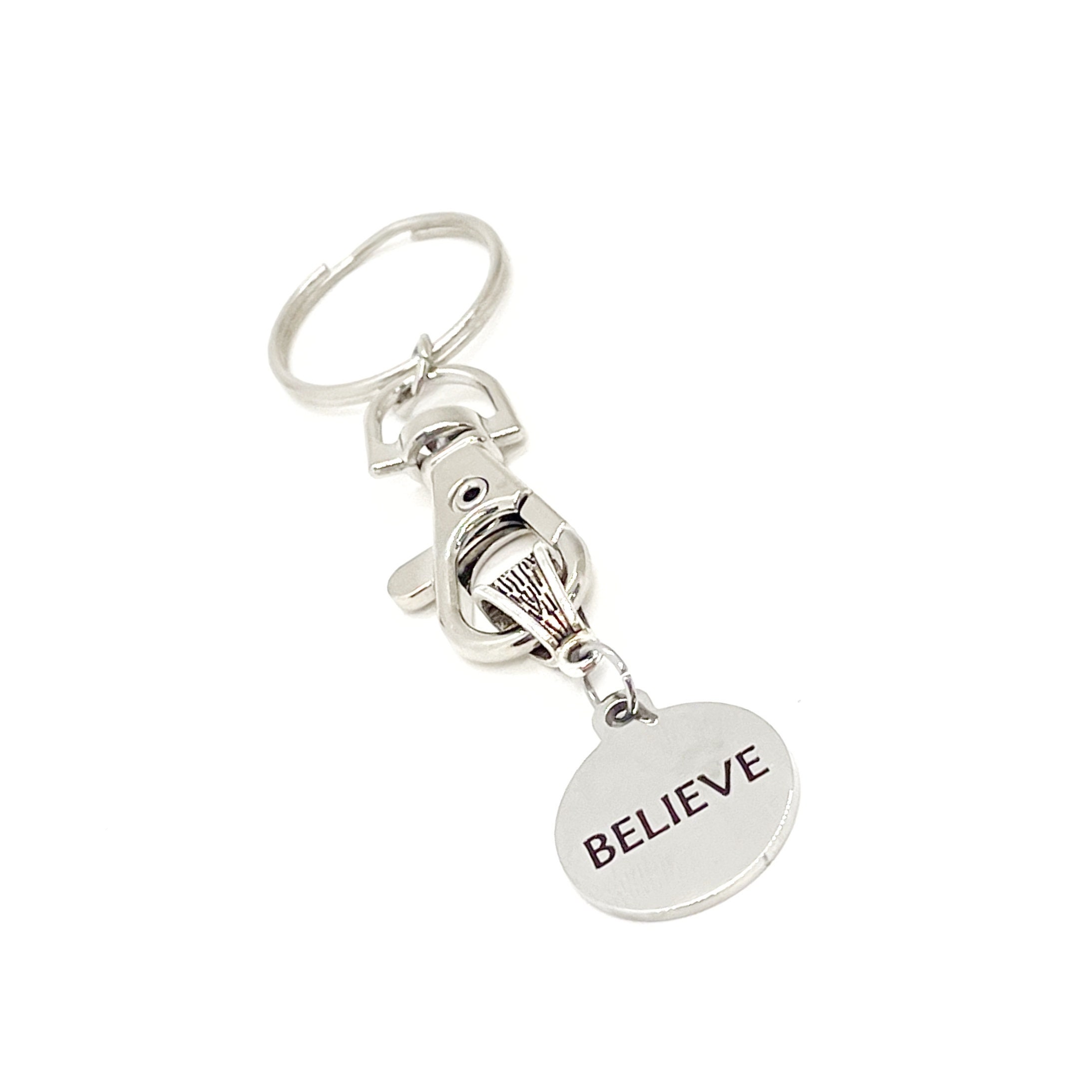 This is a great keychain that has a stainless steel laser engraved charm which says, "Believe”.