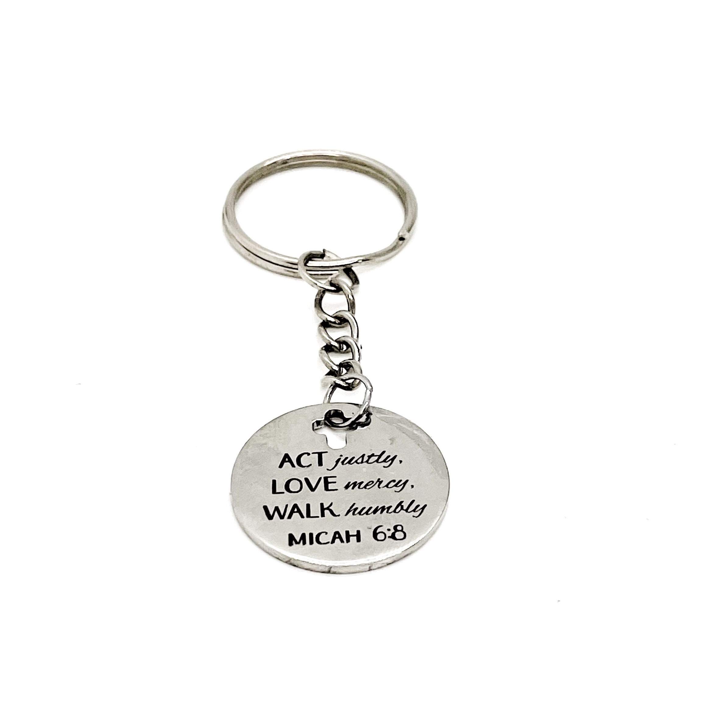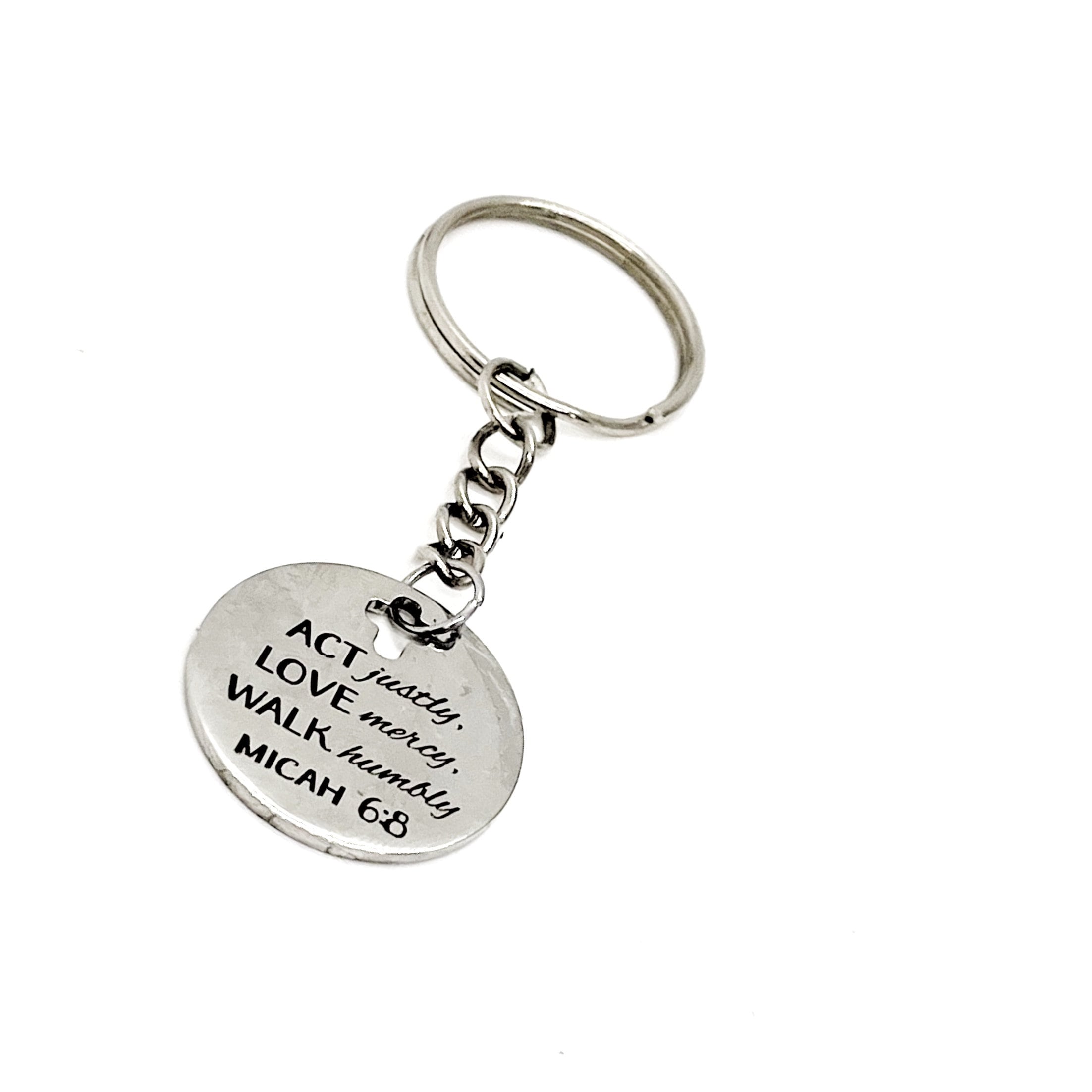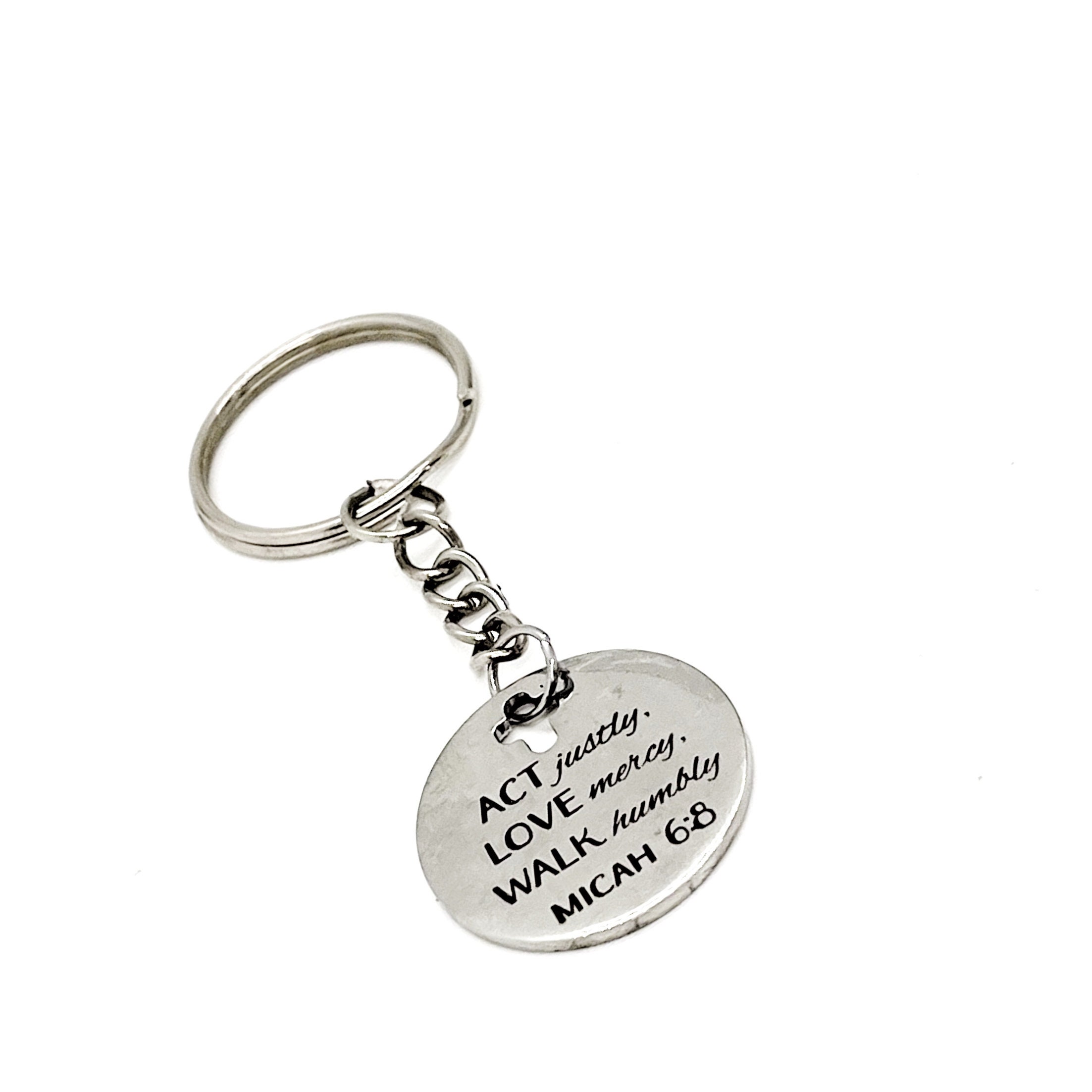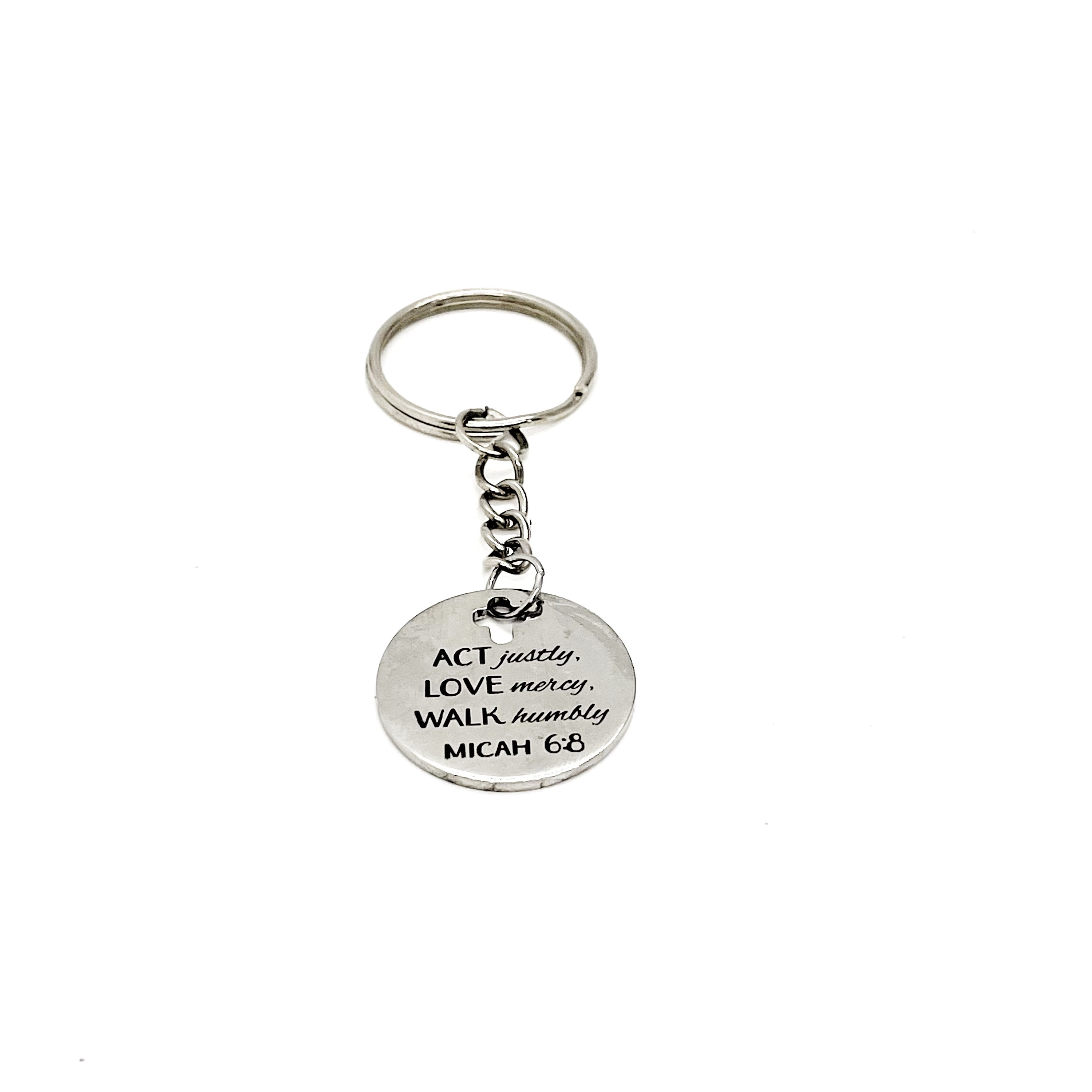 This is a great keychain gift. It has a stainless steel laser engraved charm with “Act justly, love mercy, walk humbly” from Micah 6:8 on it. The charm measures approx. 1 inch across.