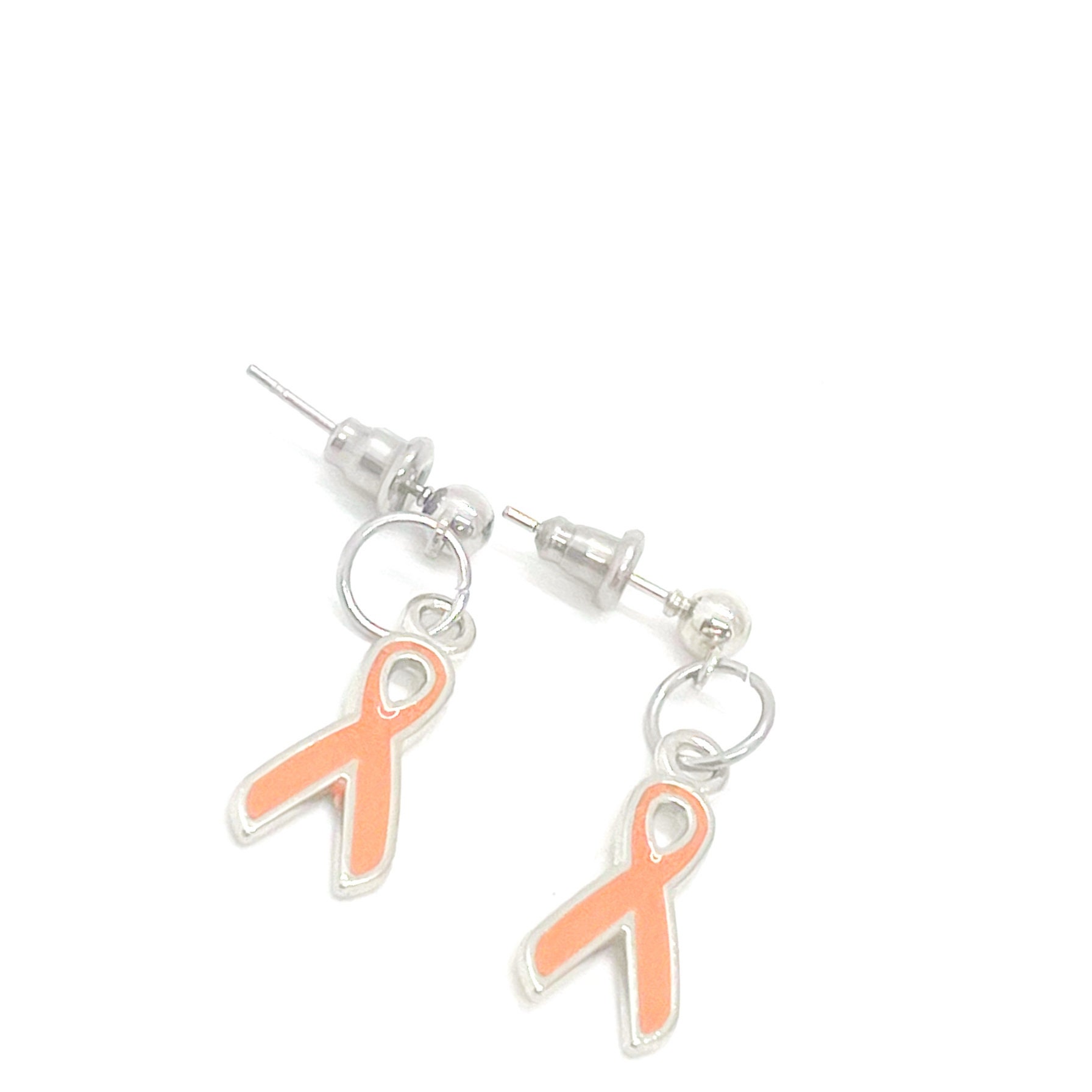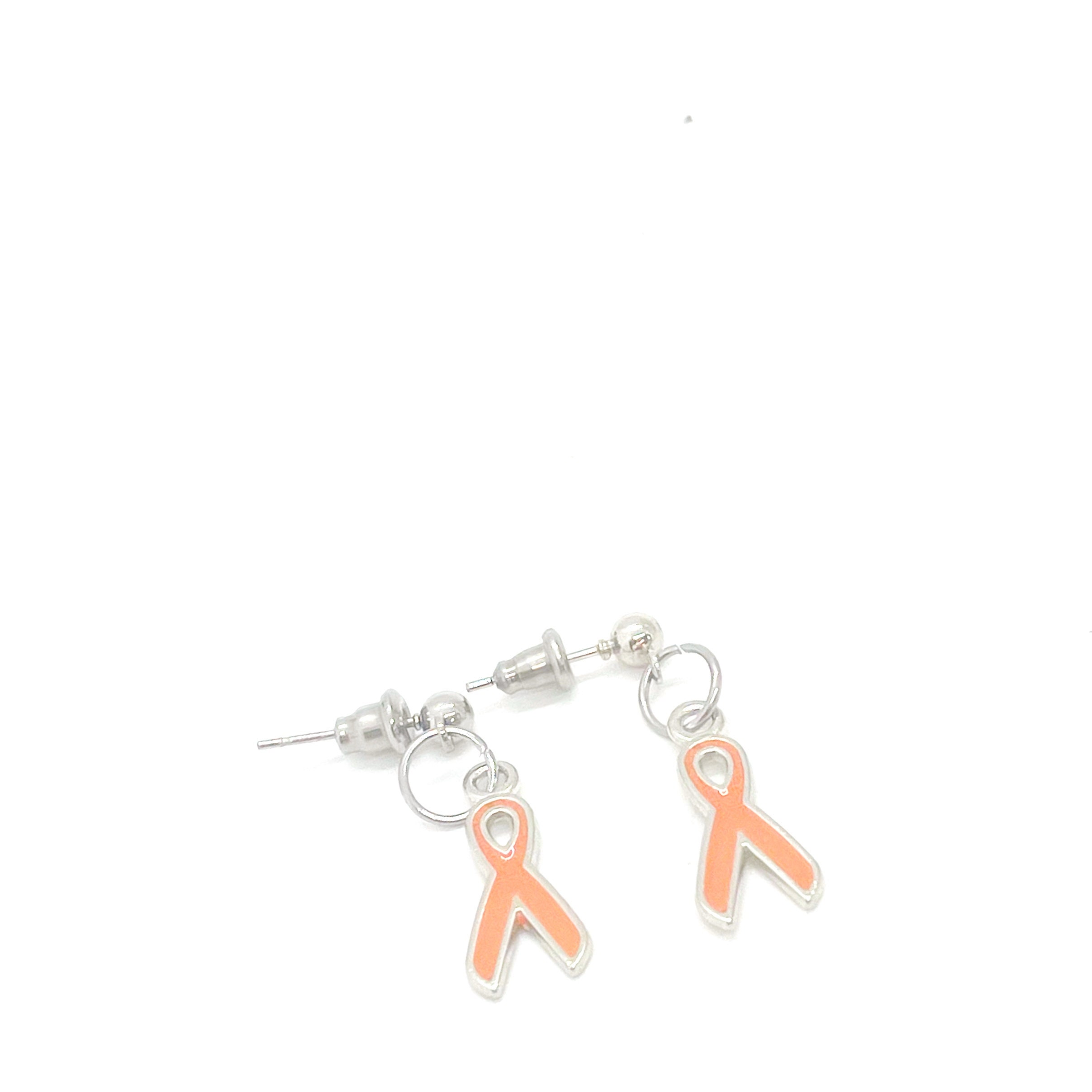 This is a great set of silvertone orange ribbon charm earring charms on stainless steel posts. The charms measure approx. 3/4 inch.