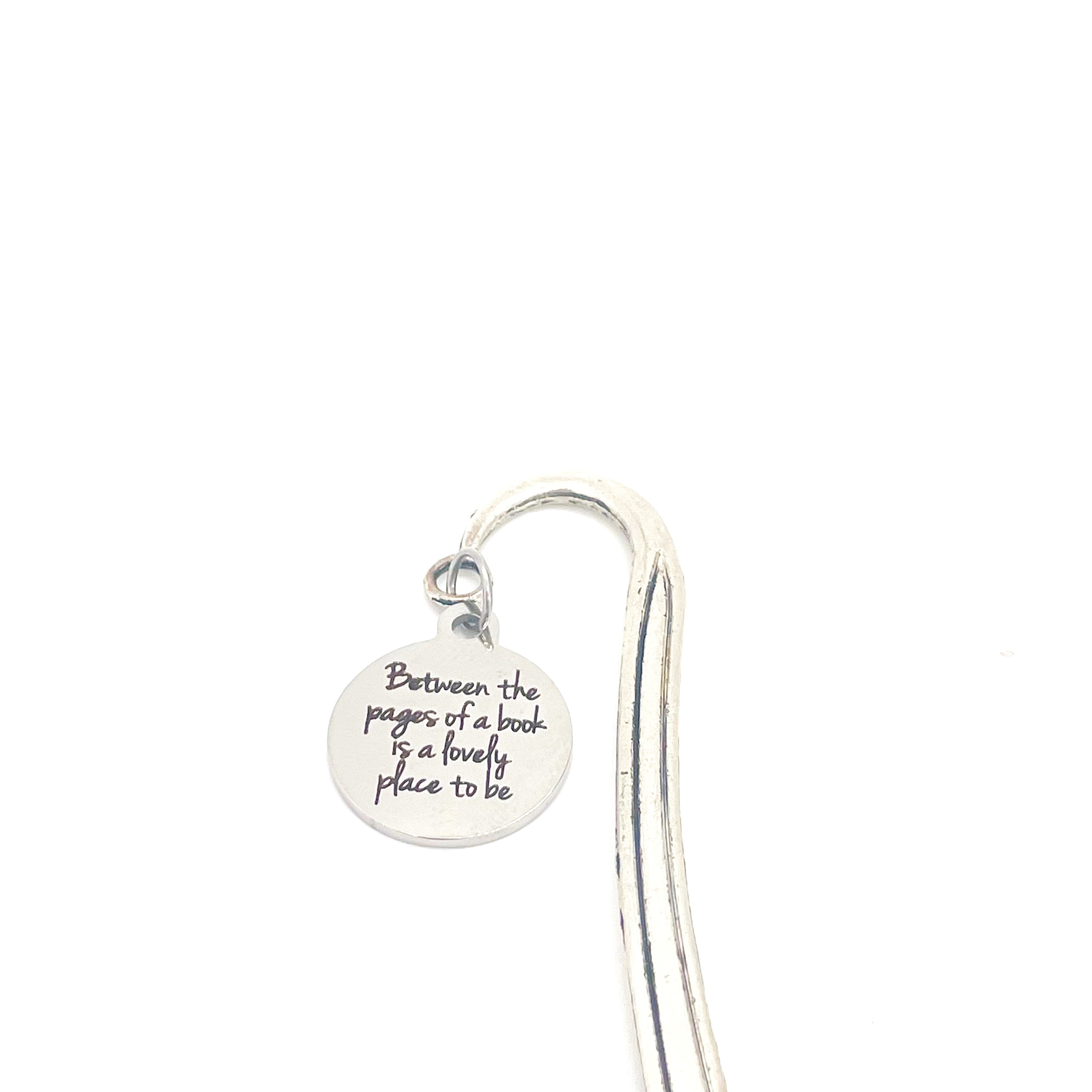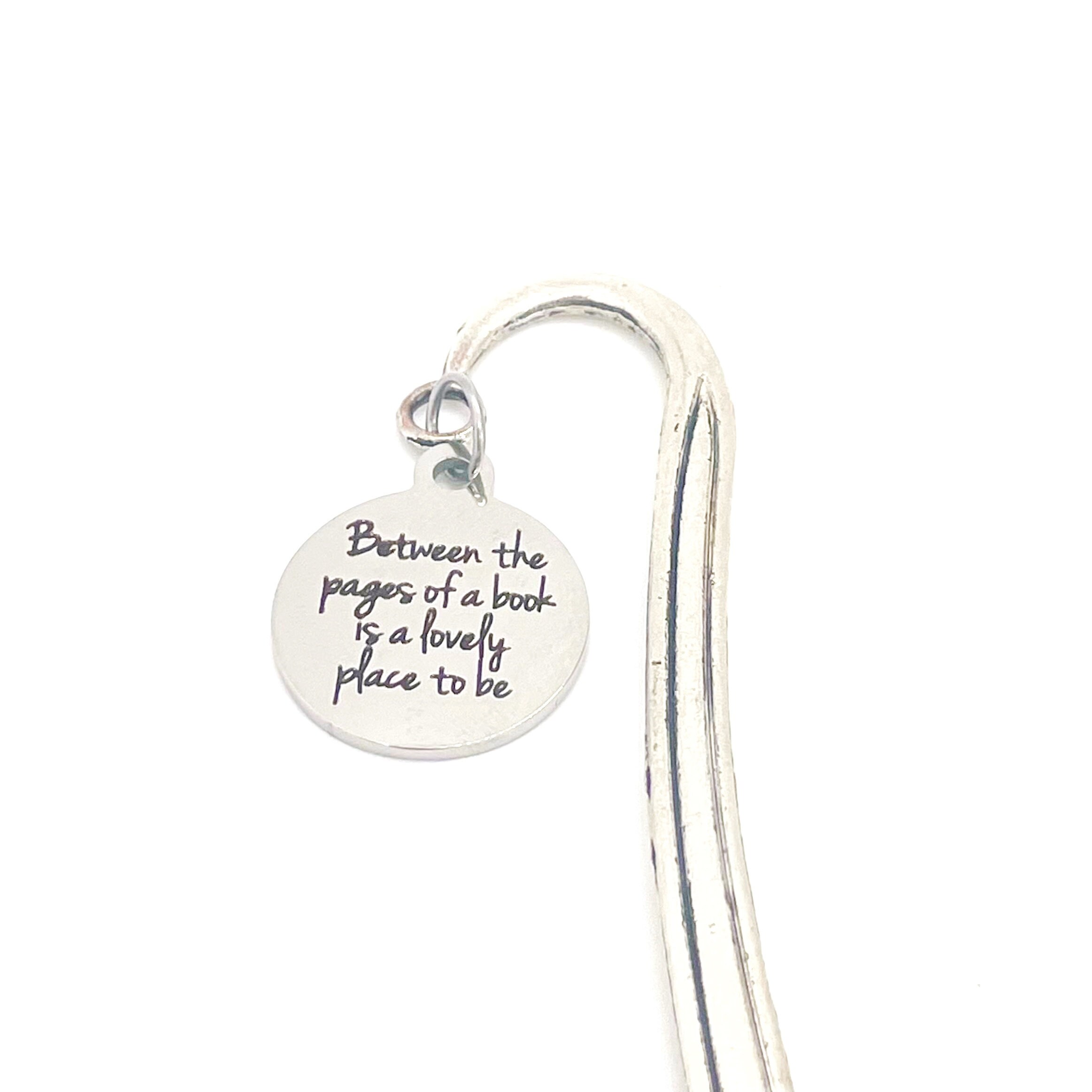 This bookmark would be a great planner charm or reader gift, Bible bookmark or planner bookmark. It has a stainless steel laser engraved charm with “Between the pages of a book is a lovely place to be” on it.