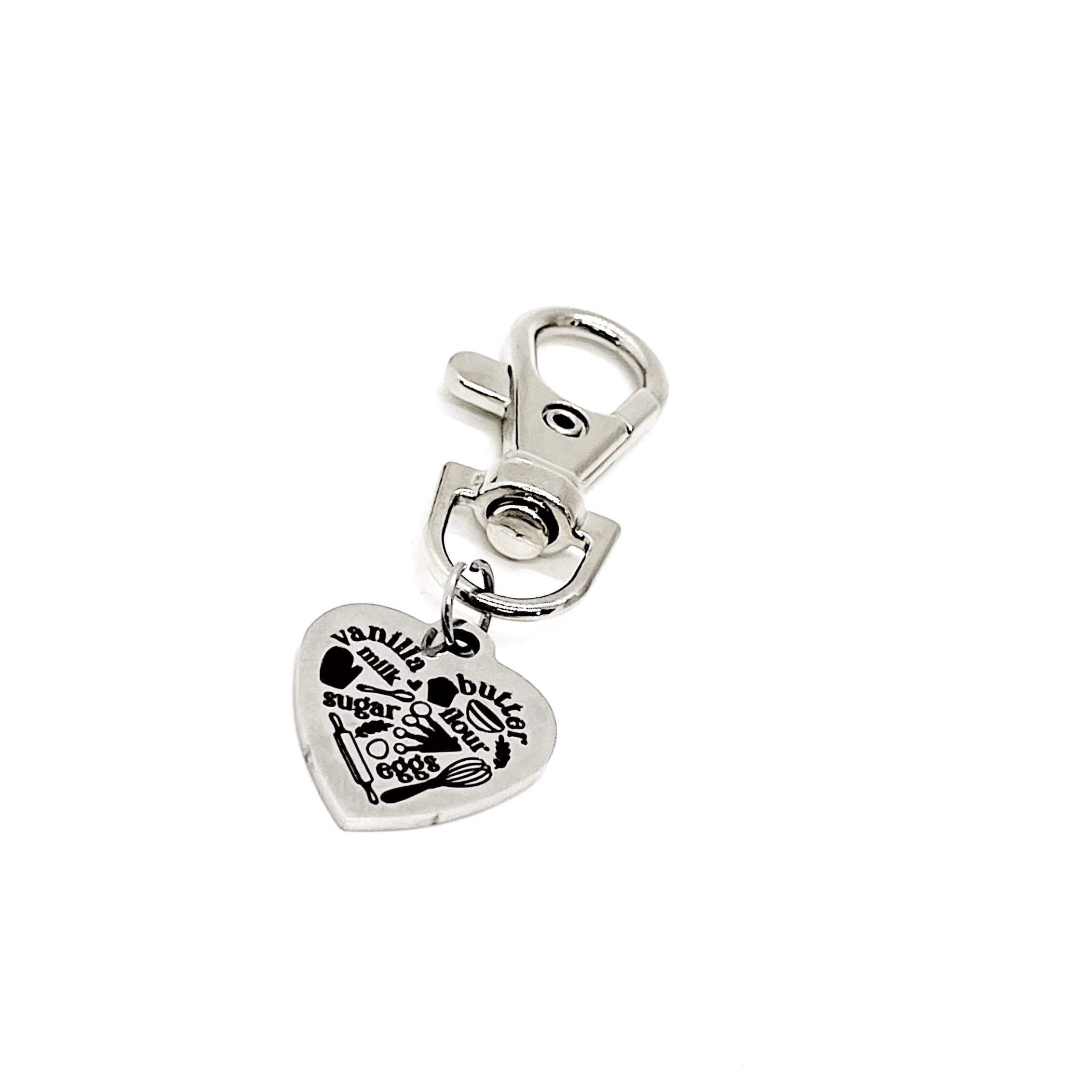 This is a great zipper pull or bag charm or keychain clip-on charm with baking words - vanilla, butter, milk, flour, sugar, and eggs - on it. The charm measures approx. 1/2 inch across.