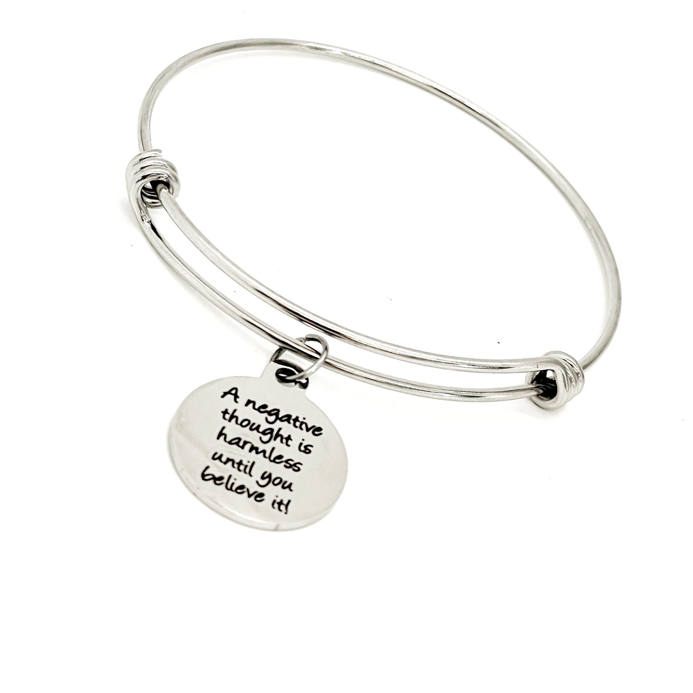 This is a beautiful bangle bracelet with a laser engraved stainless steel charm that has “A negative thought is harmless until you believe it” on it.