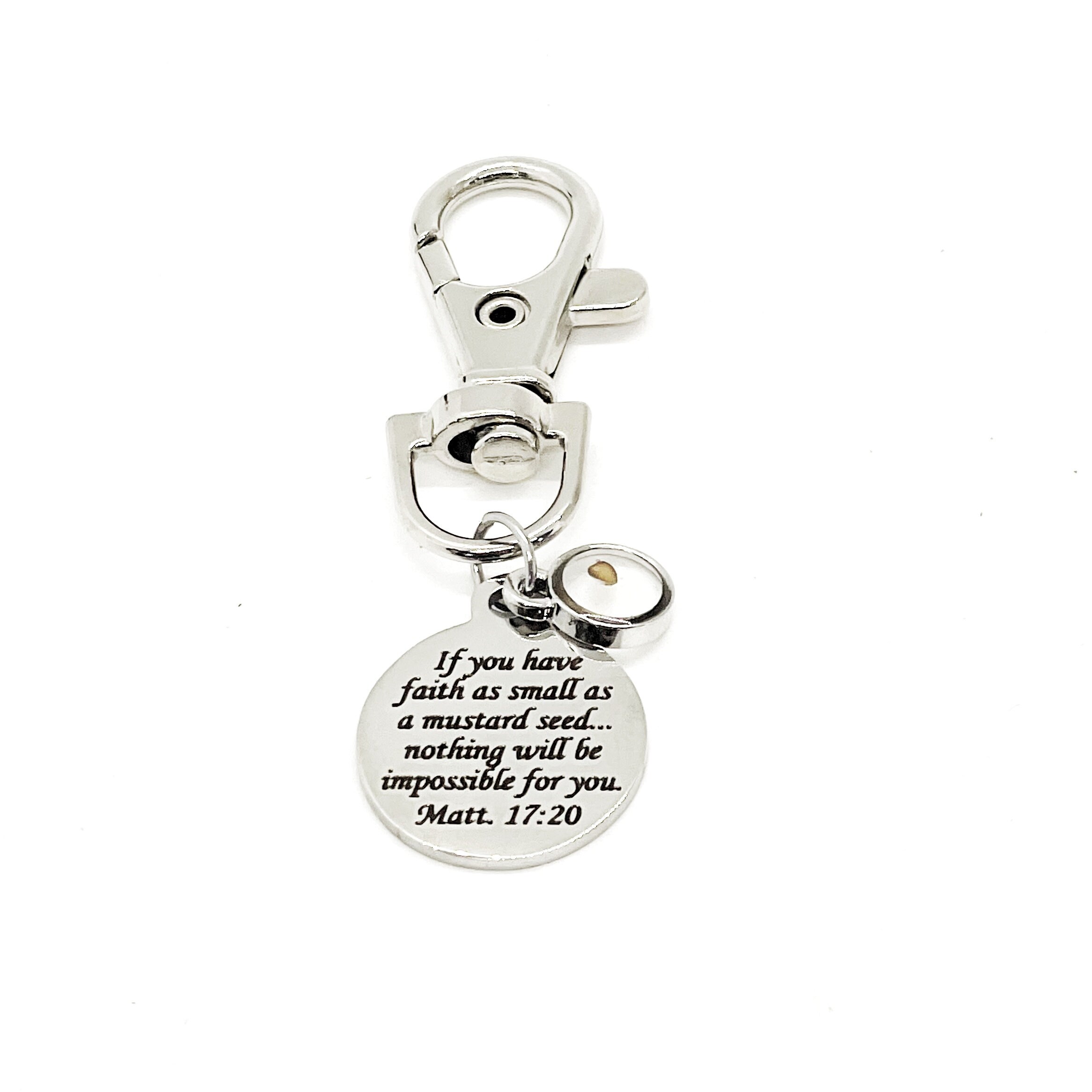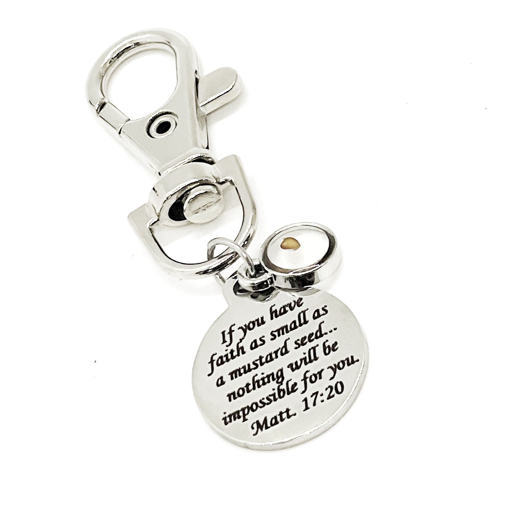This is a great zipper pull or bag charm clip gift that would be a great faith gift. It would be a great charm to clip onto a tote, purse, sports bag, book bag or keychain. It has a stainless steel engraved charm with “If you have faith as small as a mustard seed… nothing will be impossible for you” from Matthew 17:20 on it. The charm measures approx. 3/4 inch.