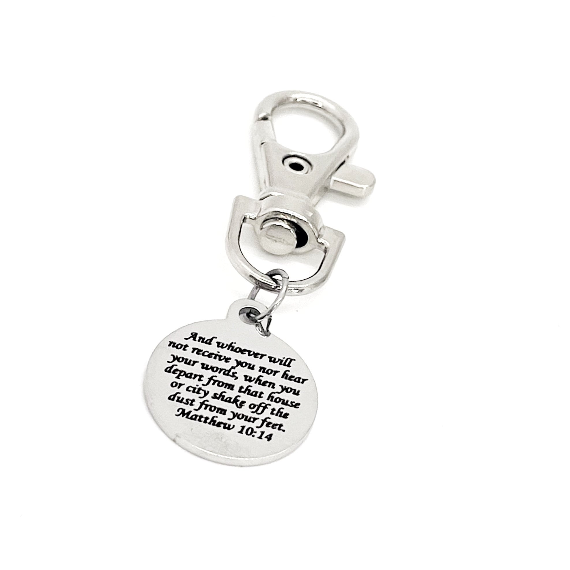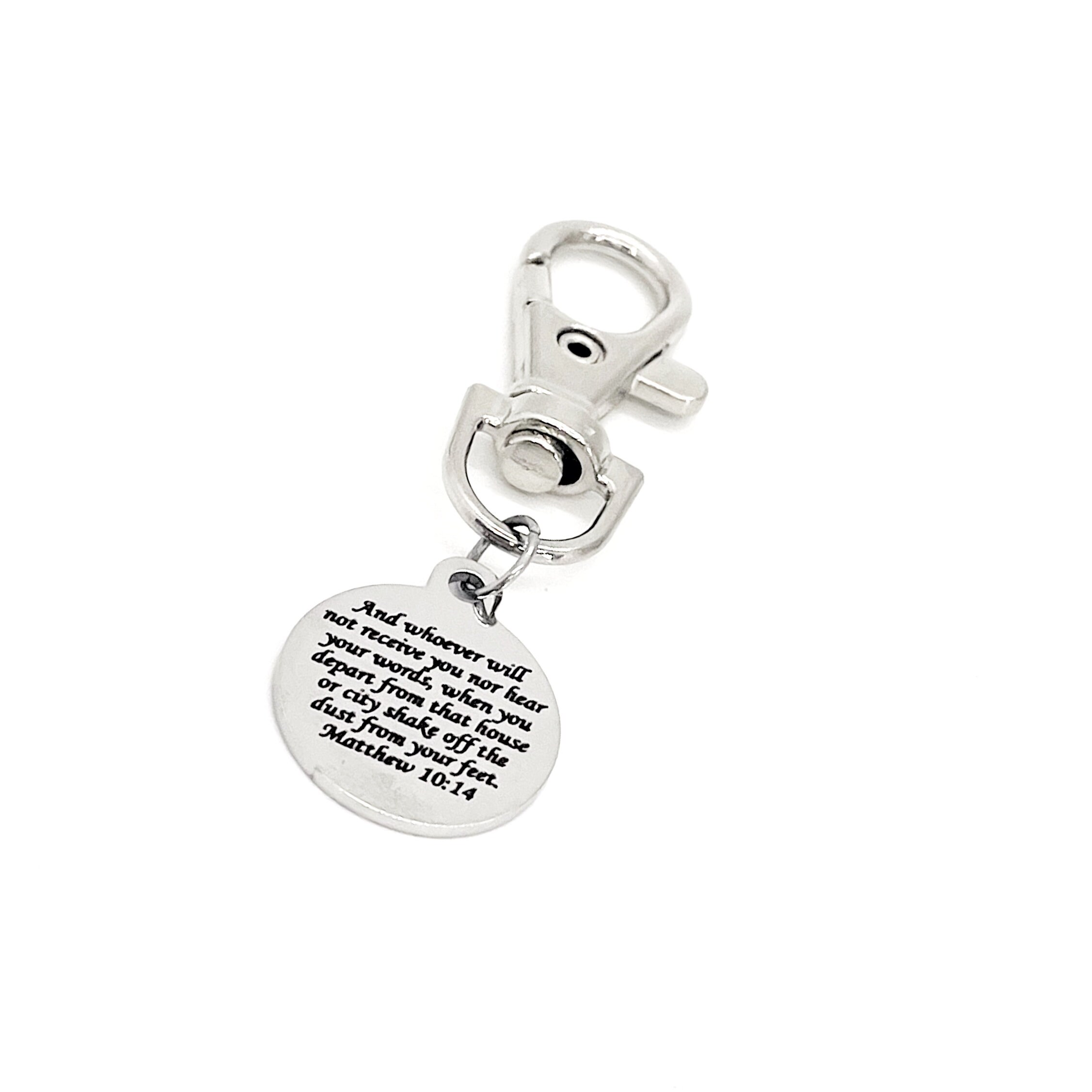 This is a great zipper pull or bag charm clip gift that would be a great gift. It would be a great charm to clip onto a tote, purse, sports bag, book bag or keychain. It has a engraved charm with “And whoever will not receive you nor hear your words, when you depart form that house or city shake off the dust from your feet” from Matthew 10:14 on it.