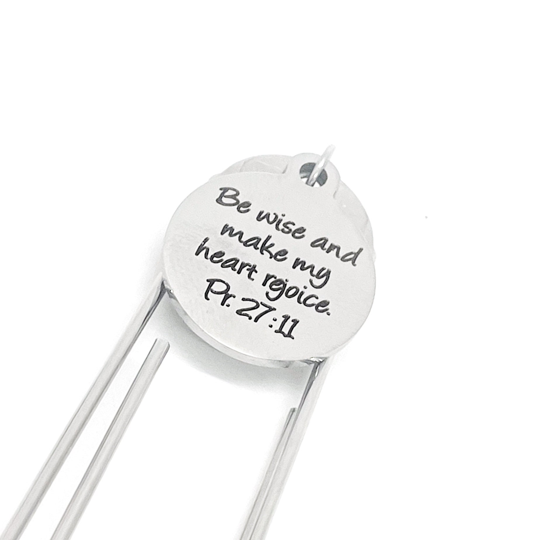 This bookmark has stainless steel laser engraved charm that says, “Be wise and make my heart rejoice” from Proverbs 27:11 on it. This would be a great gift.