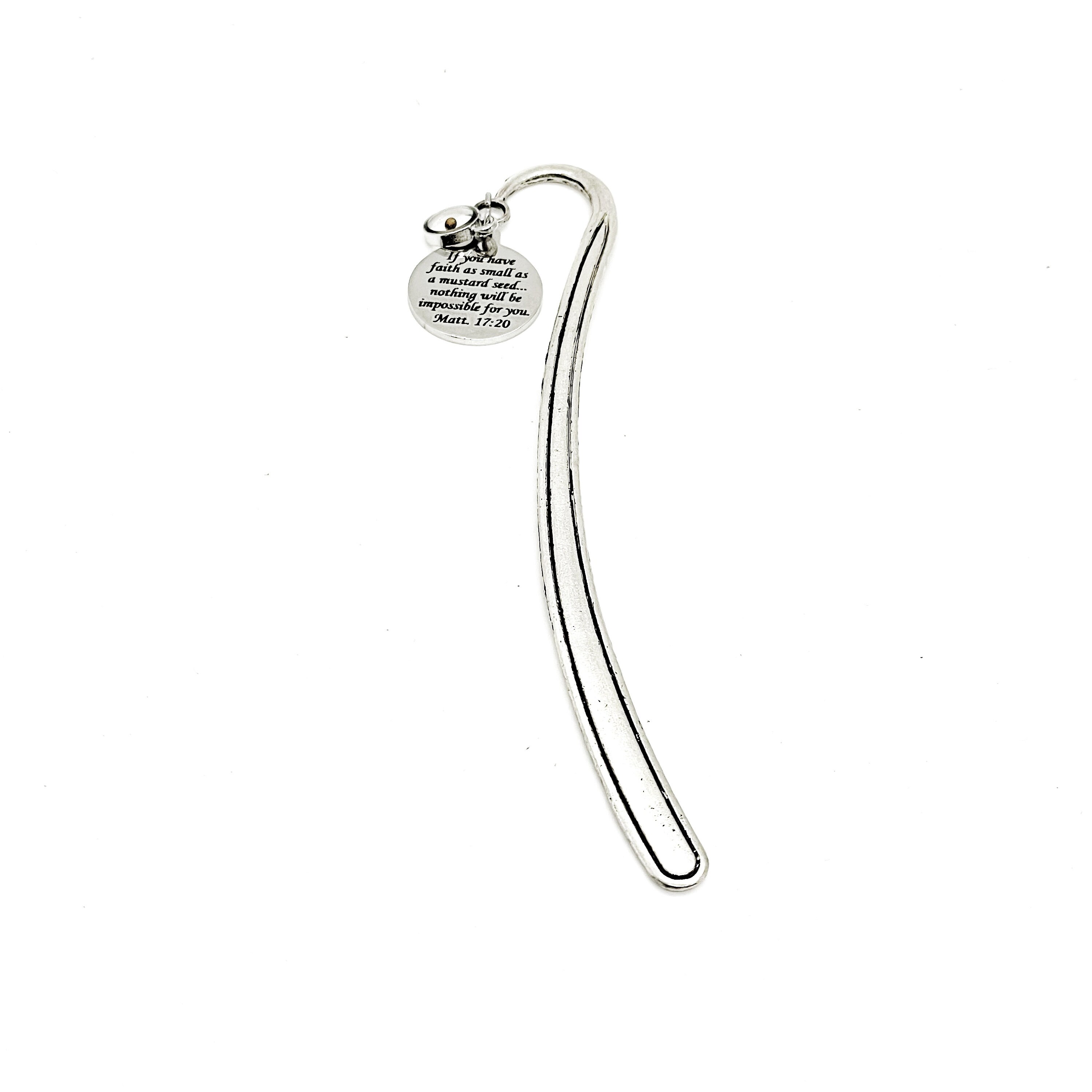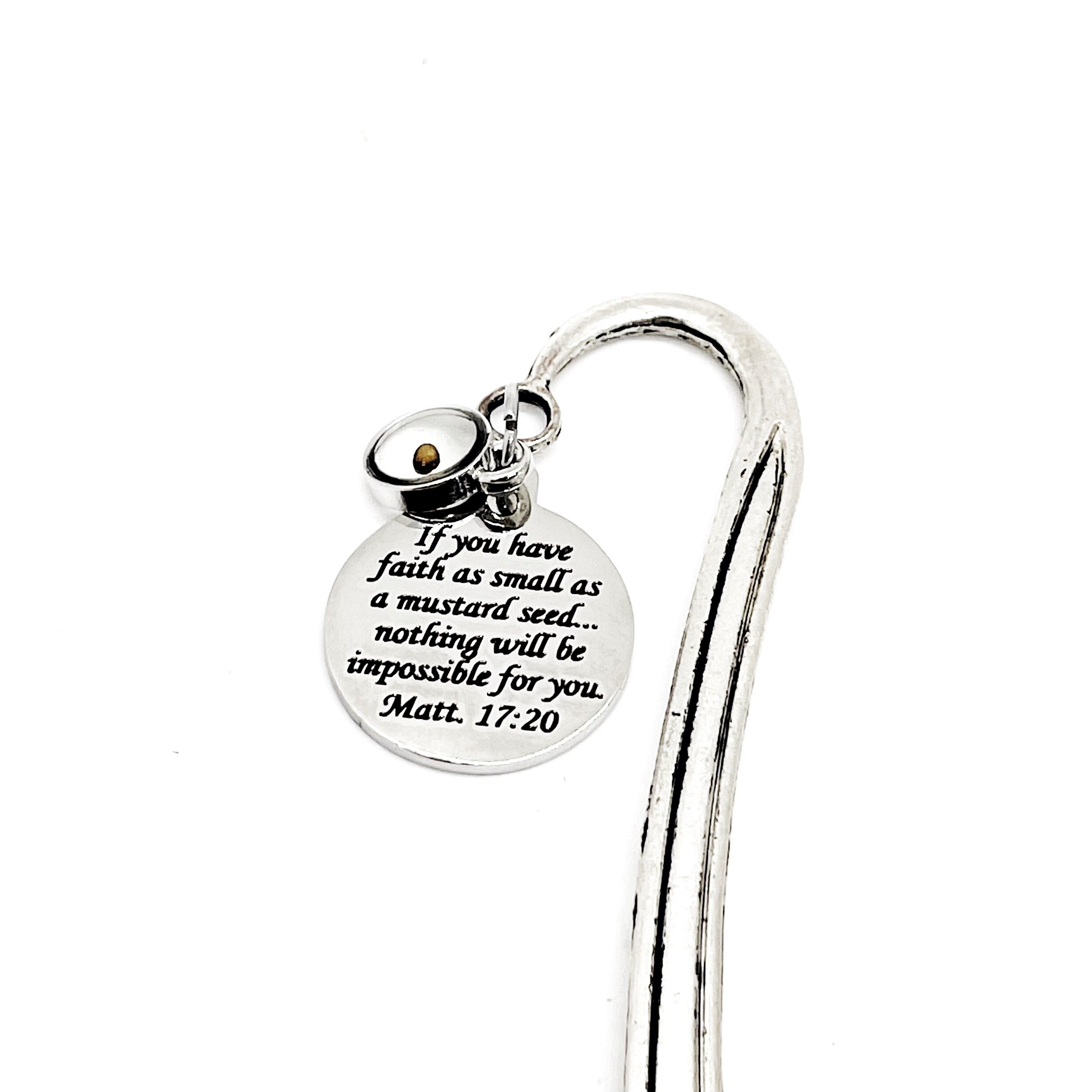 This bookmark would make a great reader gift, Bible bookmark or planner bookmark. It has a stainless steel laser engraved charm with the scripture verse of Matthew 17:20 on it along with a single mustard seed charm.