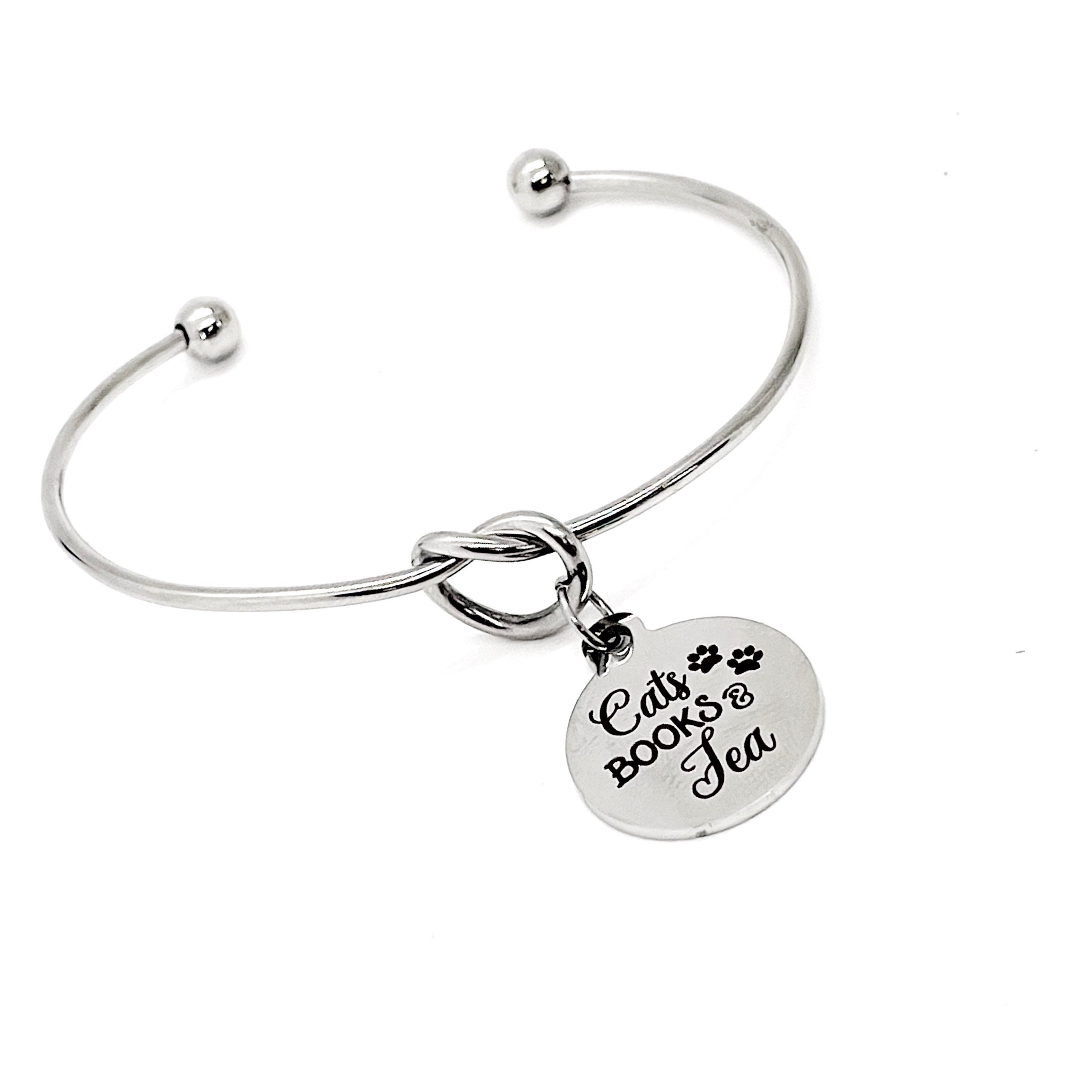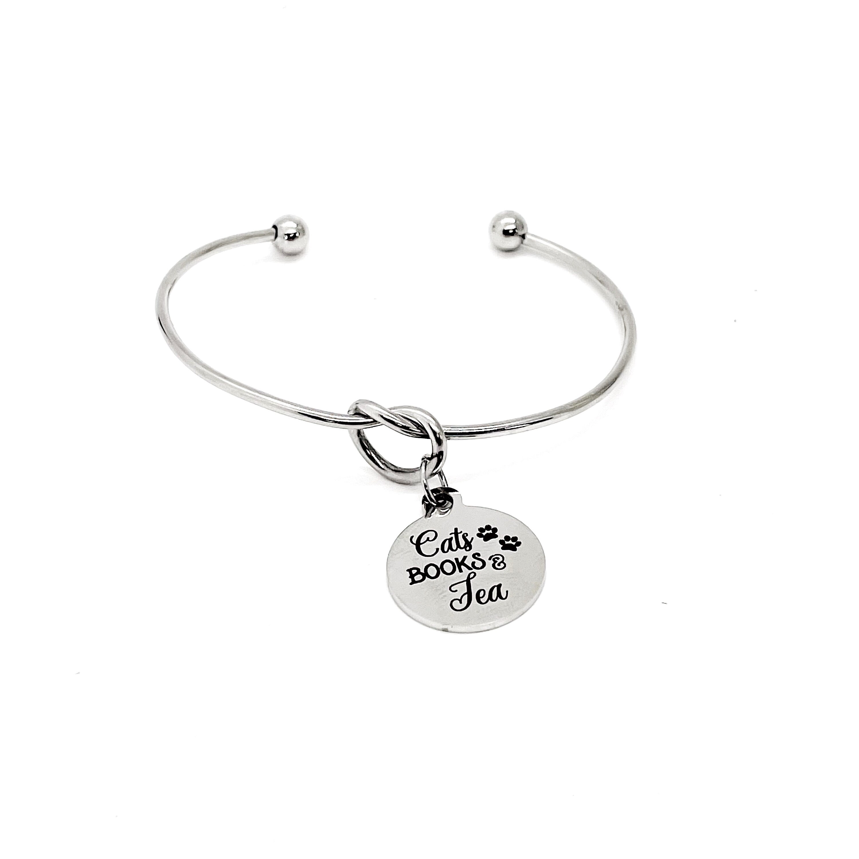 This is a beautiful knotted stainless steel cuff bracelet with an engraved charm with “Cats, Books & Tea” on it