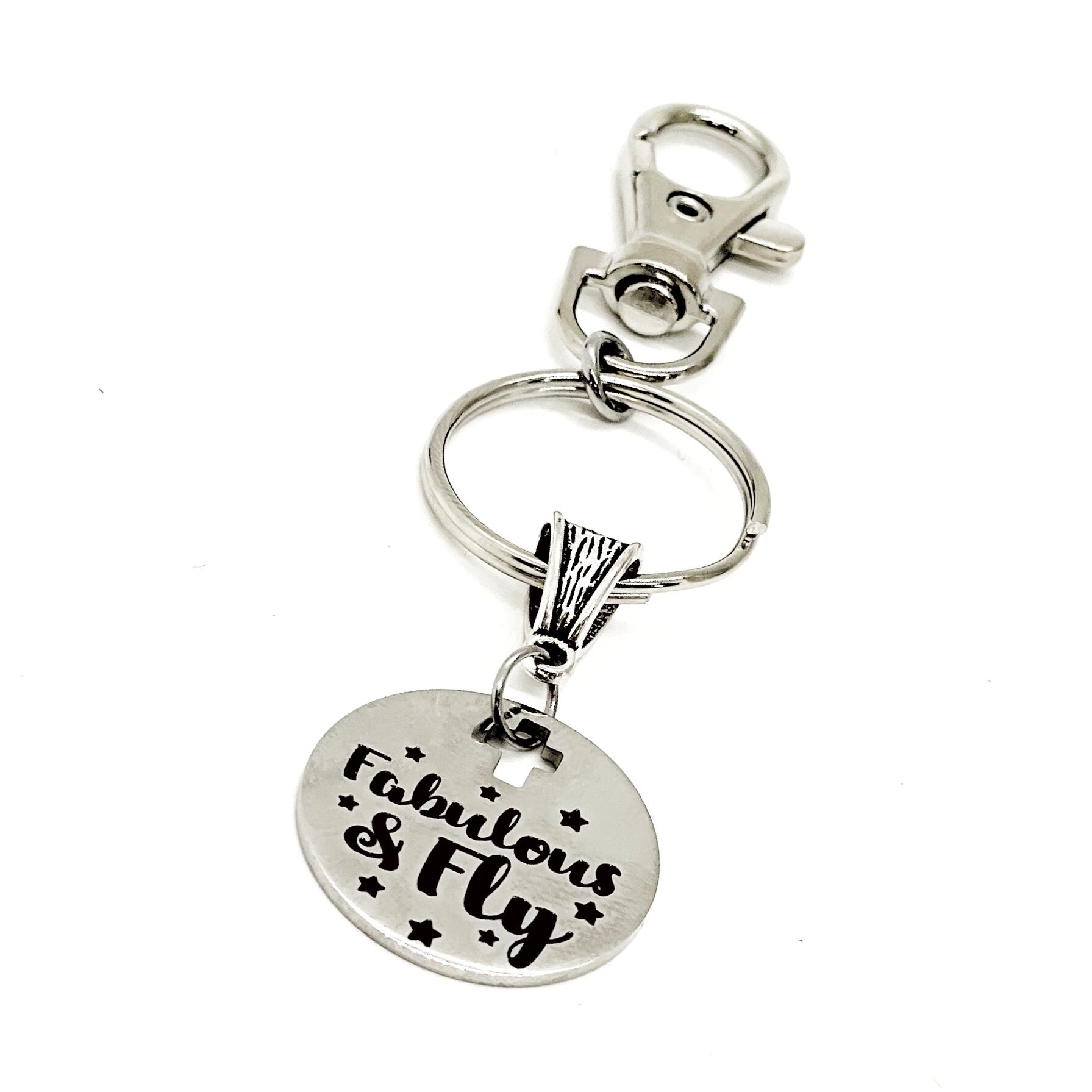This is a great keychain gift . The keyring can be clipped onto your bag to make it easy to access without digging to the bottom of the bag. It has a stainless steel laser engraved charm with “Fabulous & Fly” on it. The charm measures approx. 1 inch across.
