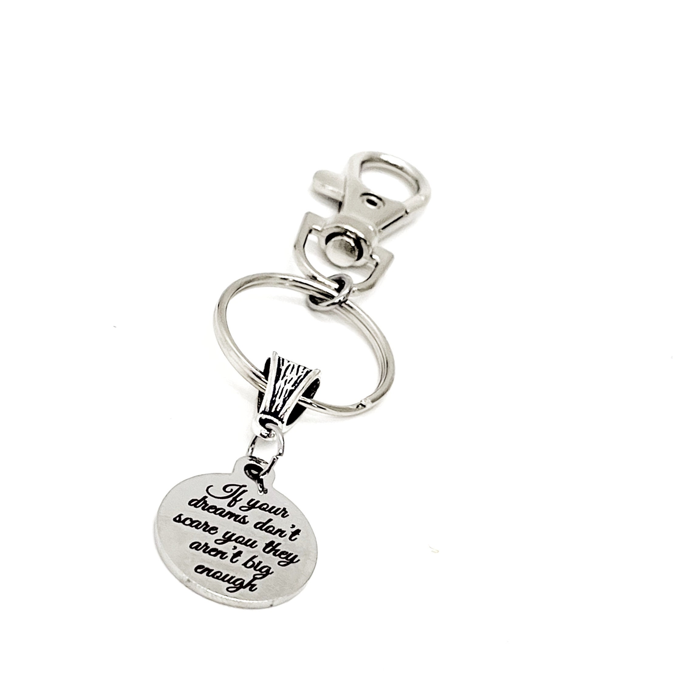 This is a great keychain gift . The keyring can be clipped onto your bag to make it easy to access without digging to the bottom of the bag. It has a stainless steel laser engraved charm with “If your dreams don’t scare you, you aren’t big enough” on it. The charm measures approx. 3/4 inch across.