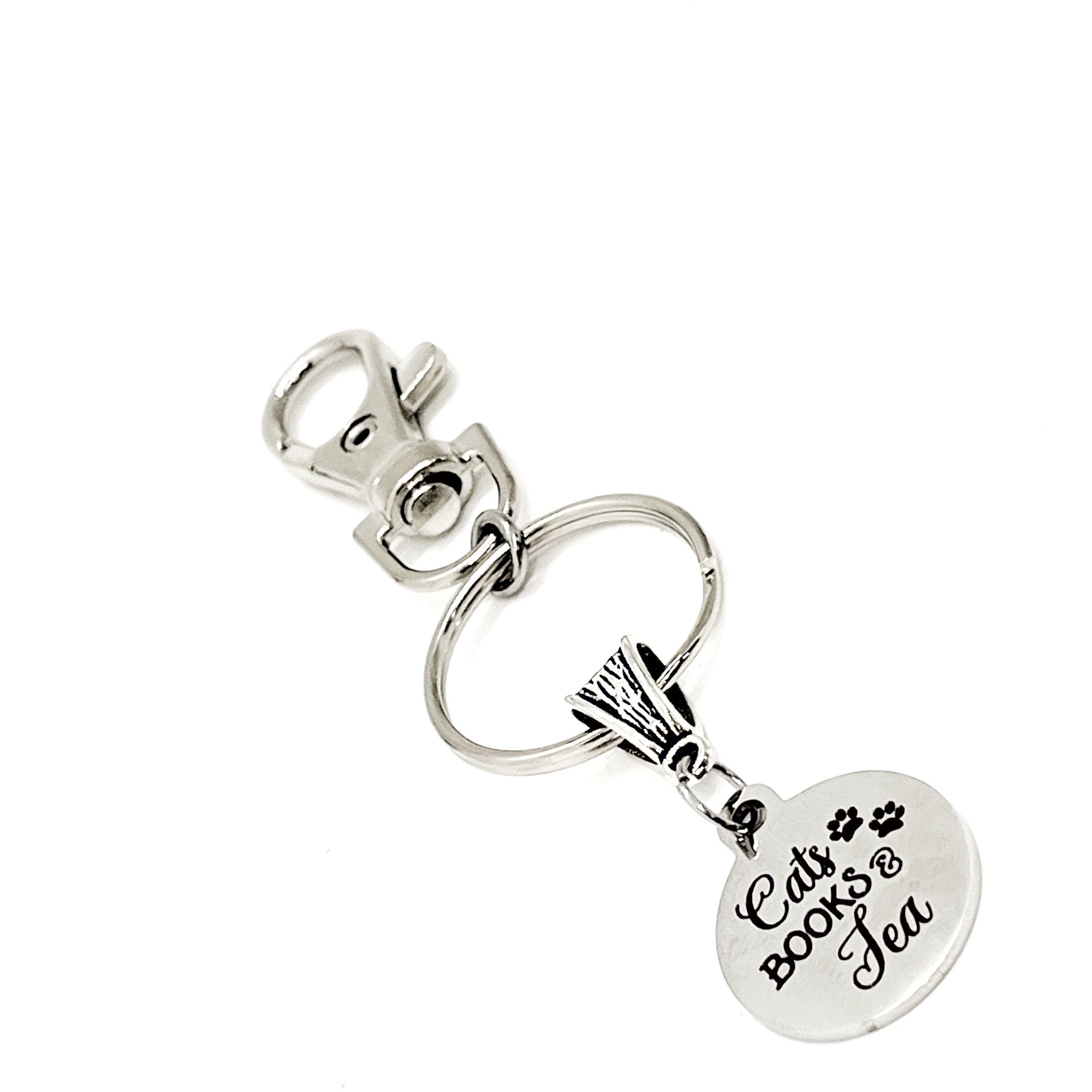 This is a great keychain gift . The keyring can be clipped onto your bag to make it easy to access without digging to the bottom of the bag. It has a stainless steel laser engraved charm with “Cats, Books, & Tea” on it. The charm measures approx. 3/4 inch across.