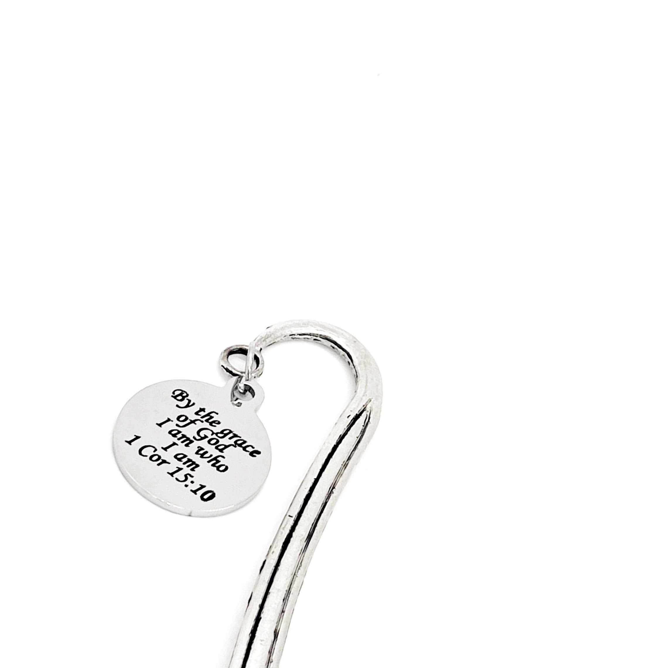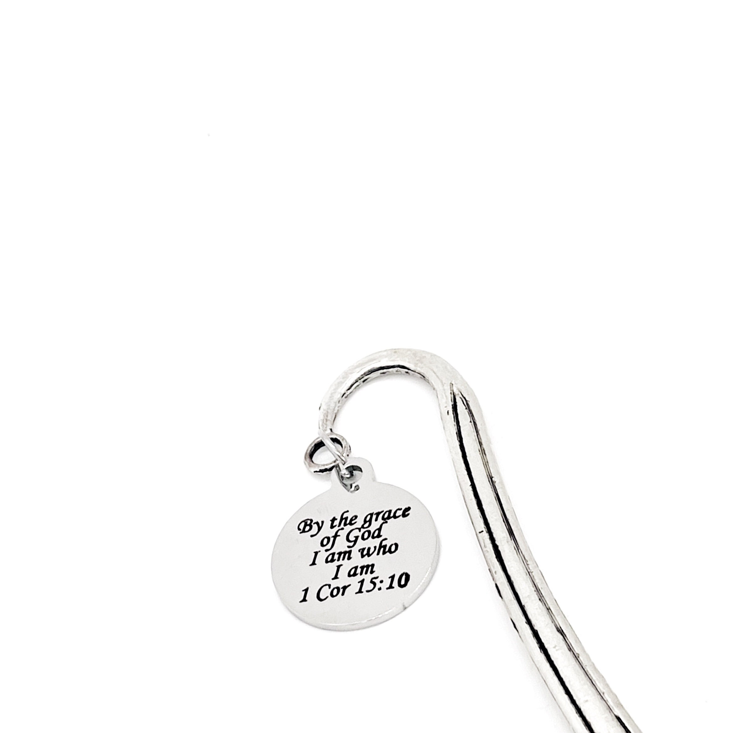 This is a great reader gift! It is a metal bookmark that has a stainless steel laser engraved charm that has "By the grace of God I am who I am" from 1 Corinthians 15:10 on it. The bookmark measures approx. 4.9 Inches in length.