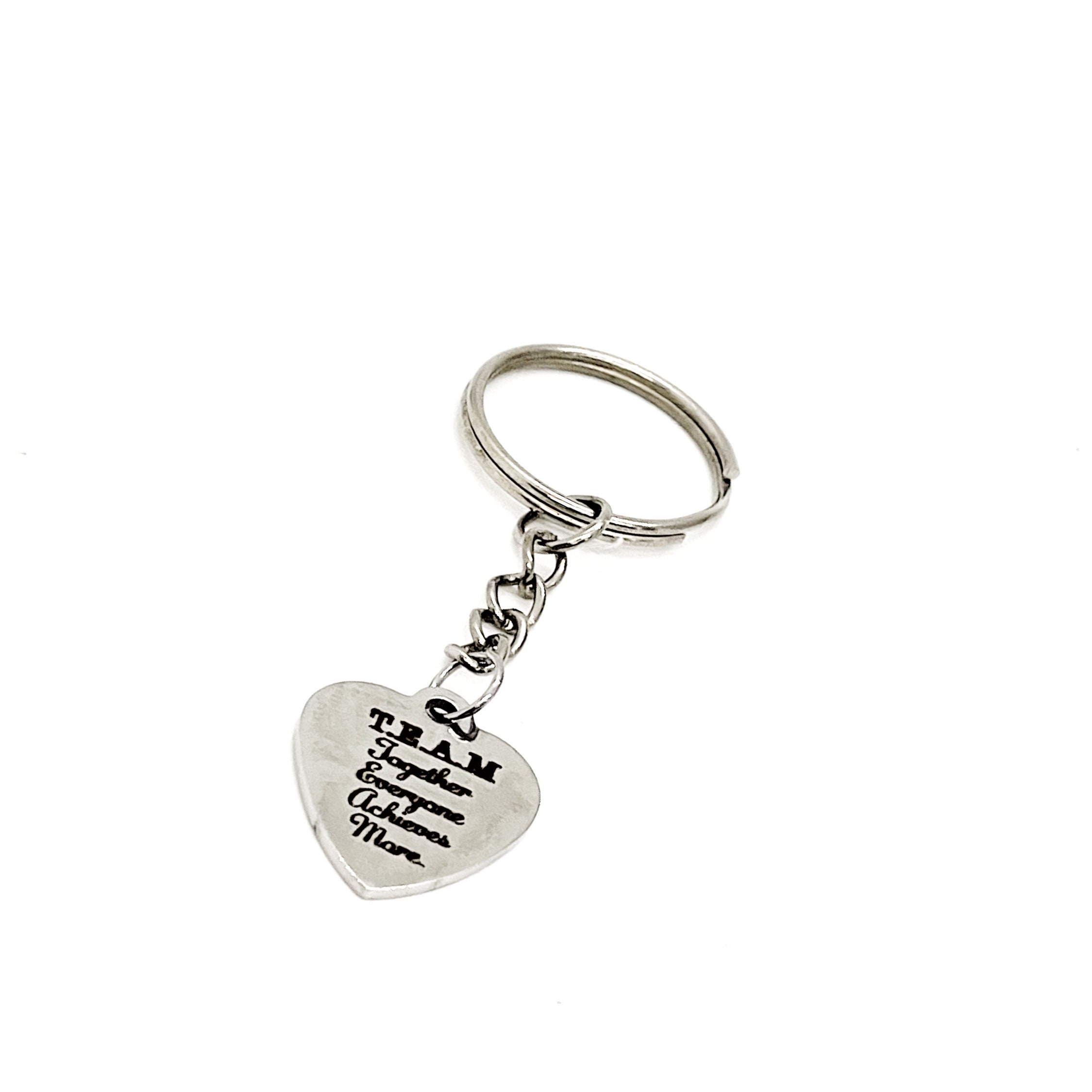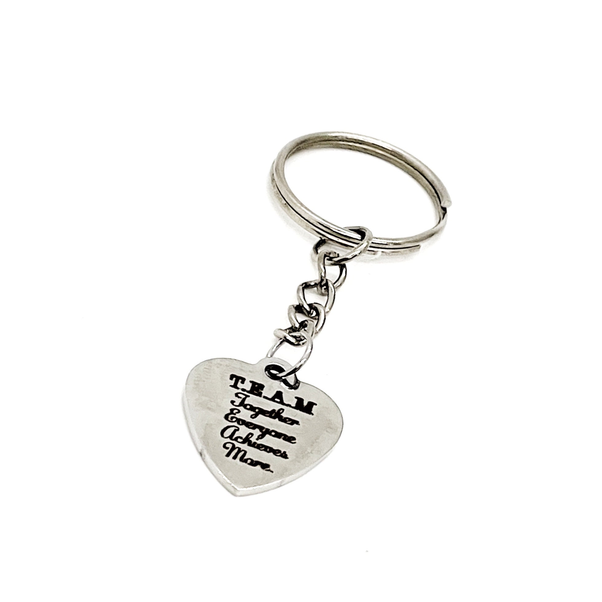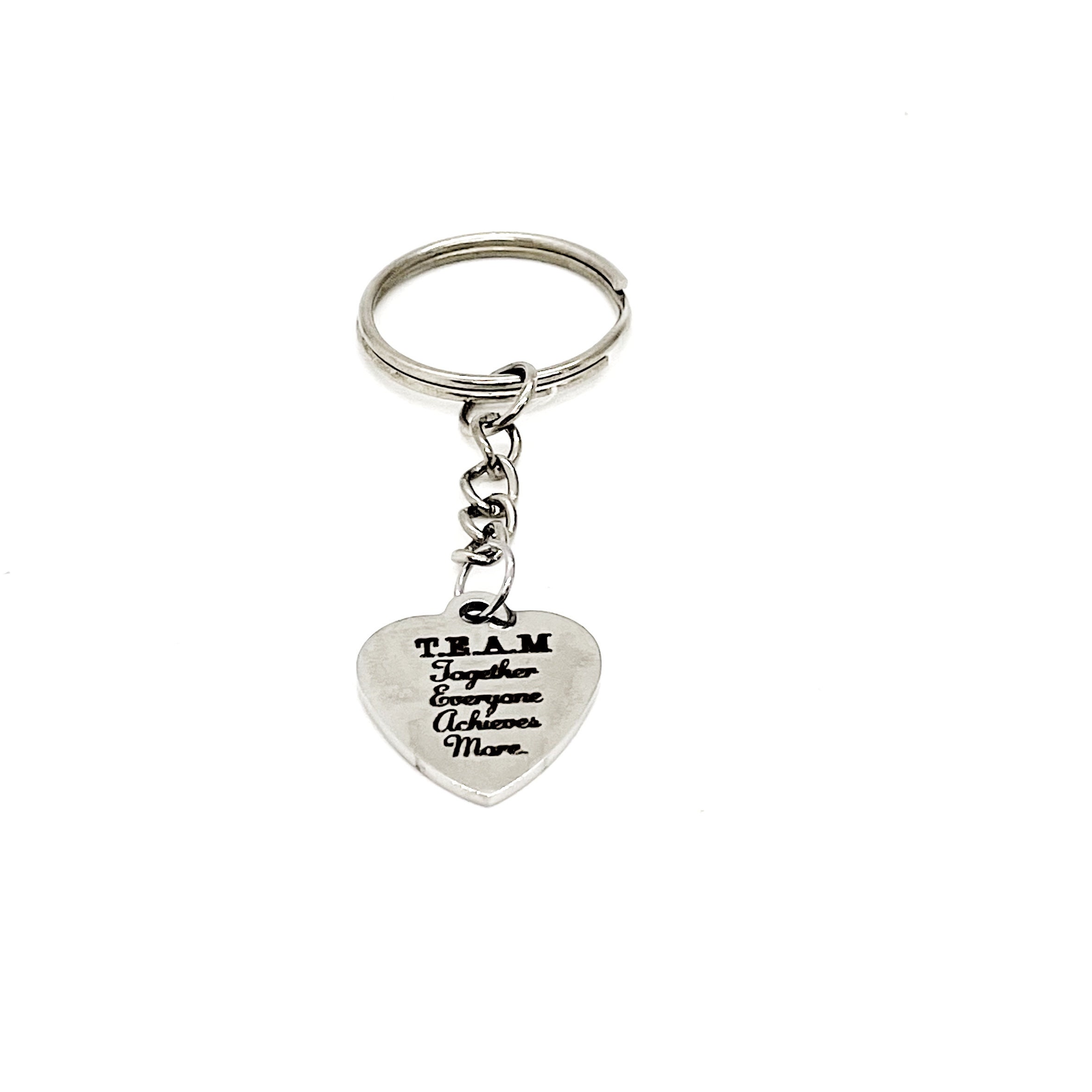 This is a great keychain gift. It has a stainless steel laser engraved charm with “TEAM Together Everyone Achieves More” on it. The charm measures approx. 1/2 inch across.