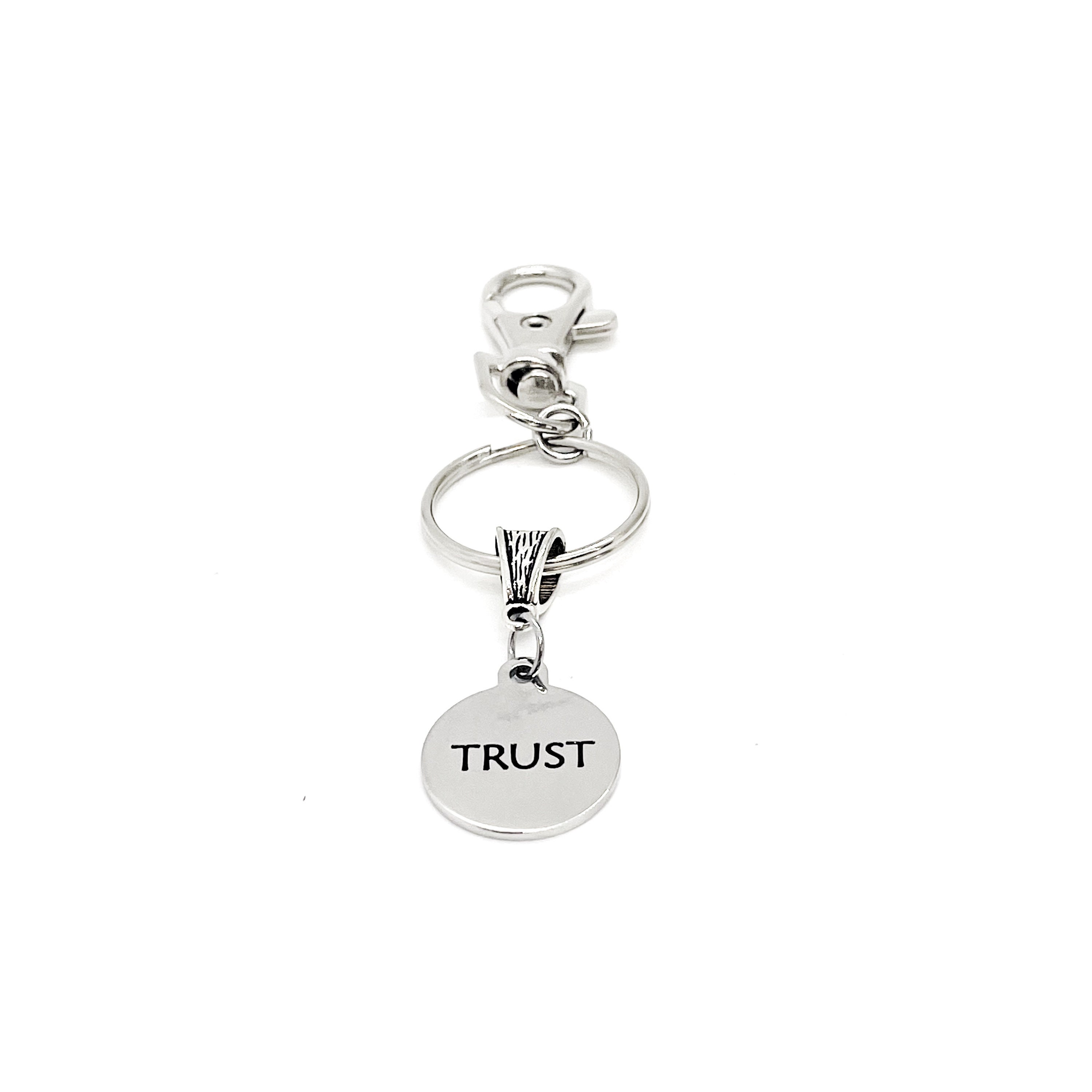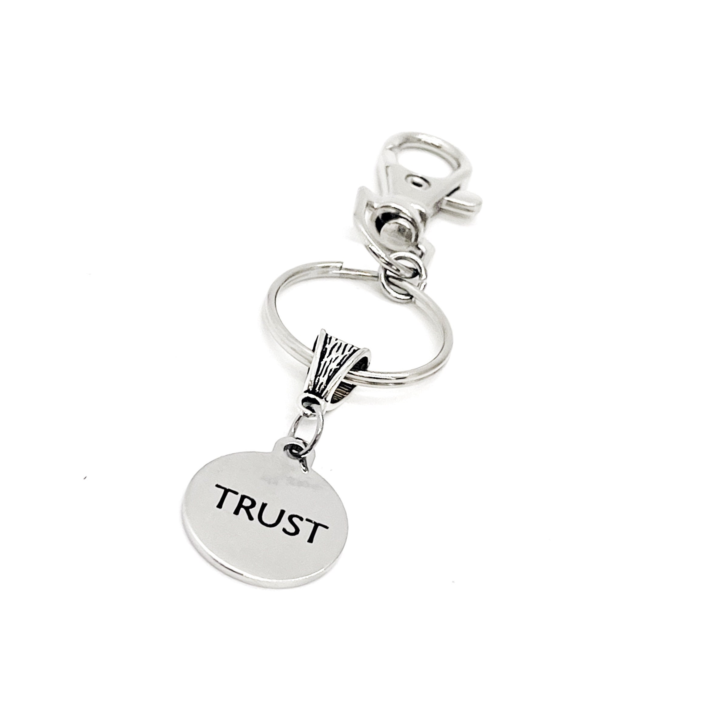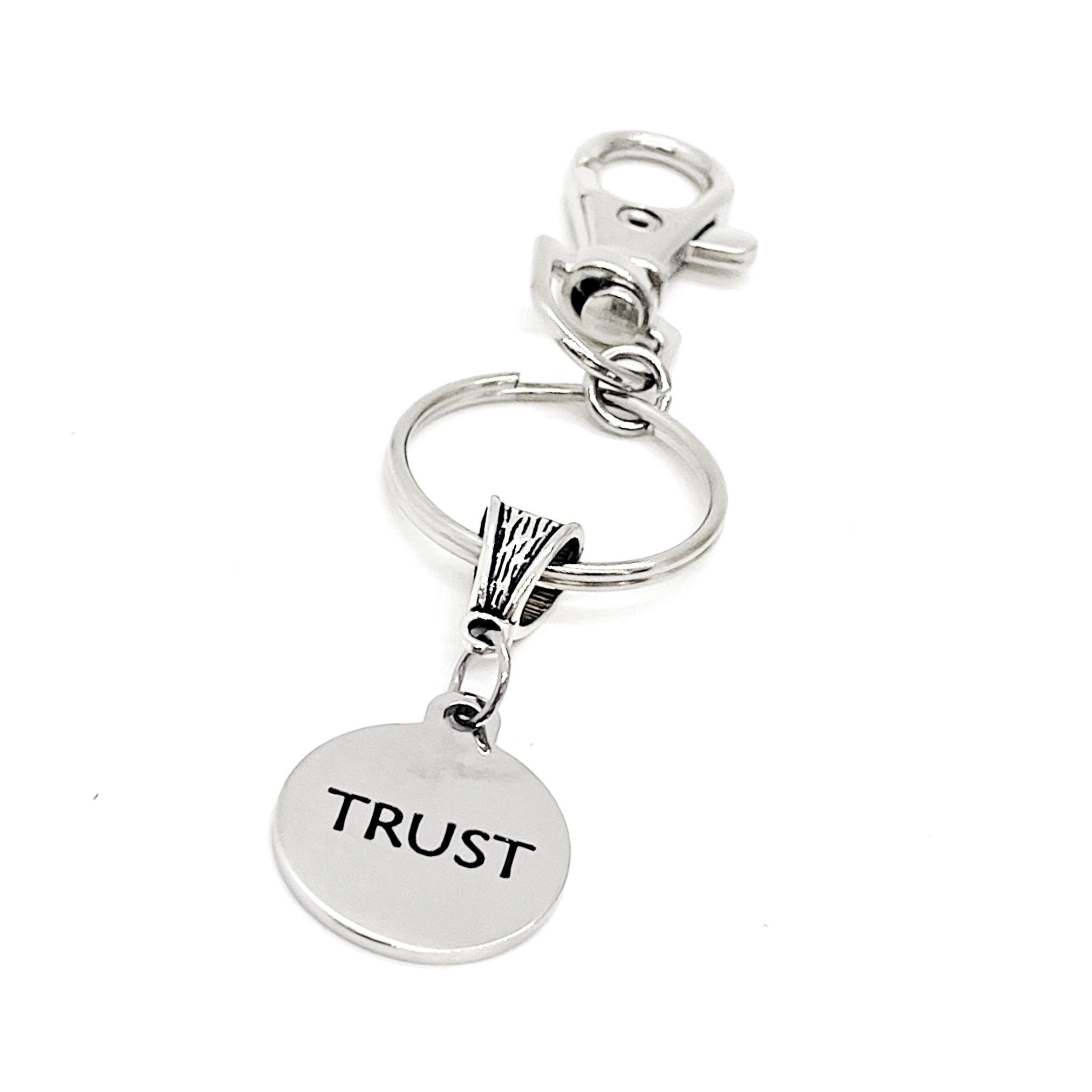 This is a great keychain gift . The keyring can be clipped onto your bag to make it easy to access without digging to the bottom of the bag. It has a stainless steel laser engraved charm with “TRUST” on it. The charm measures approx. 3/4 inch across.
