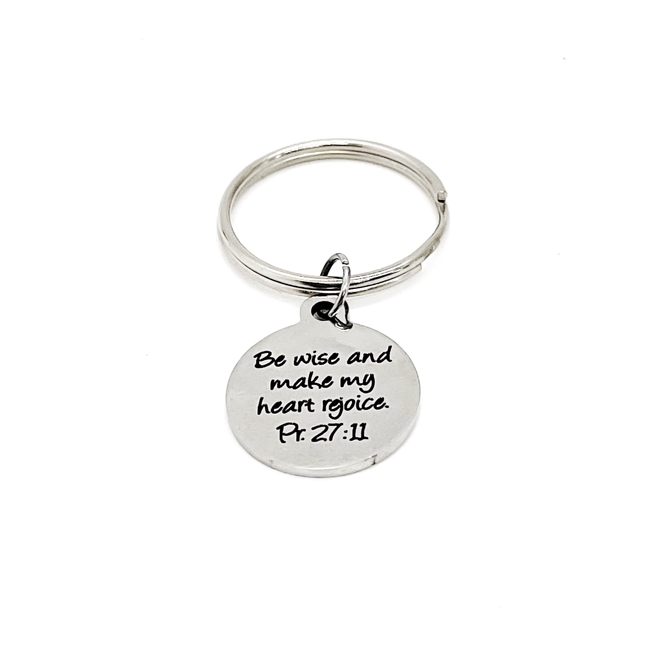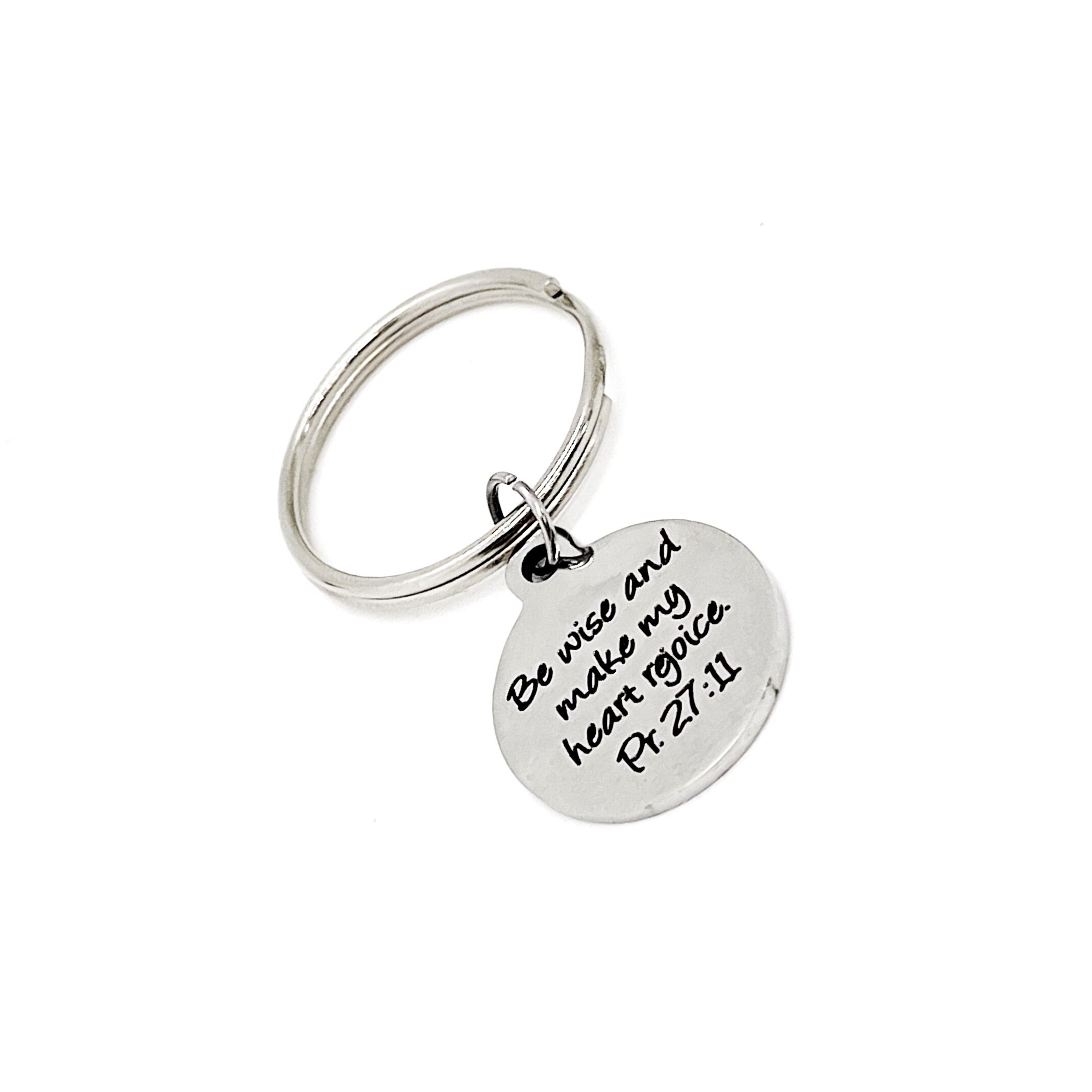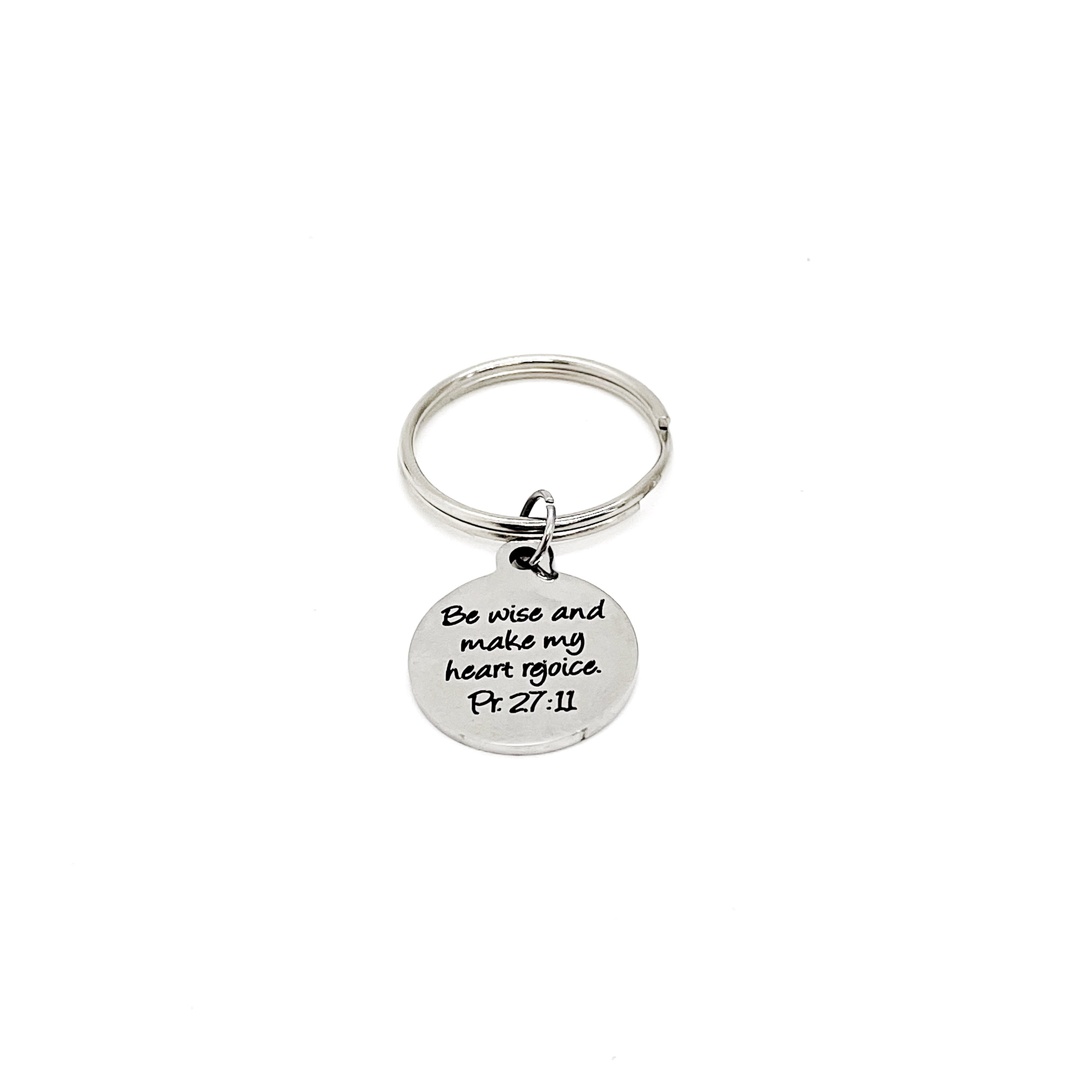 This is a wonderful keychain gift! It has stainless steel engraved charm with “Be wise and make my heart rejoice” from Proverbs 27:11 on it. The charm measures approx. 3/4 inch across.