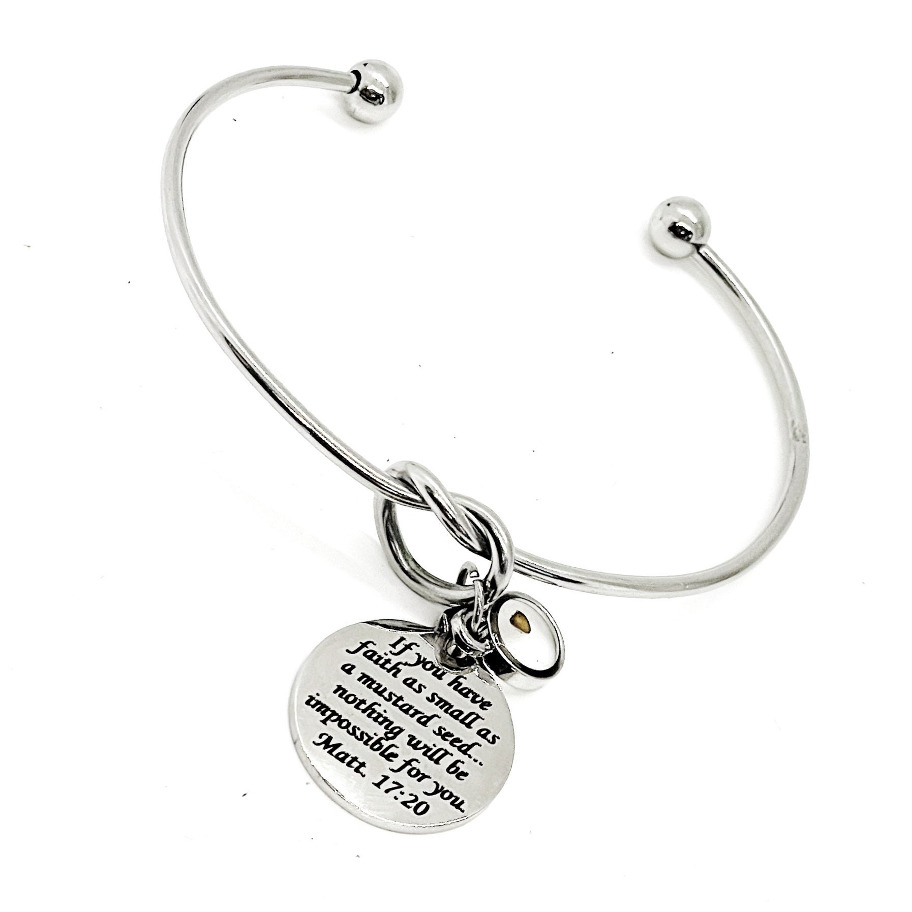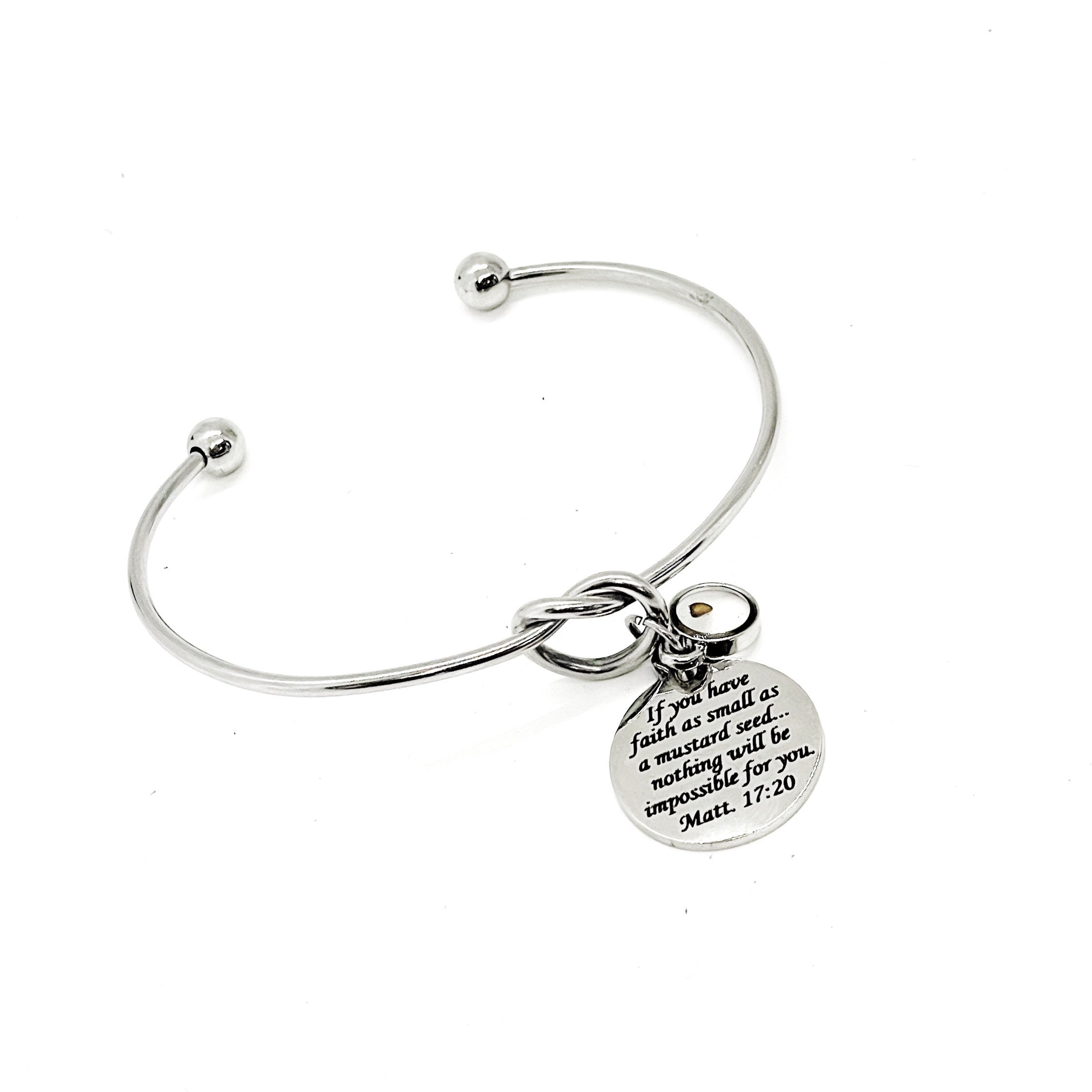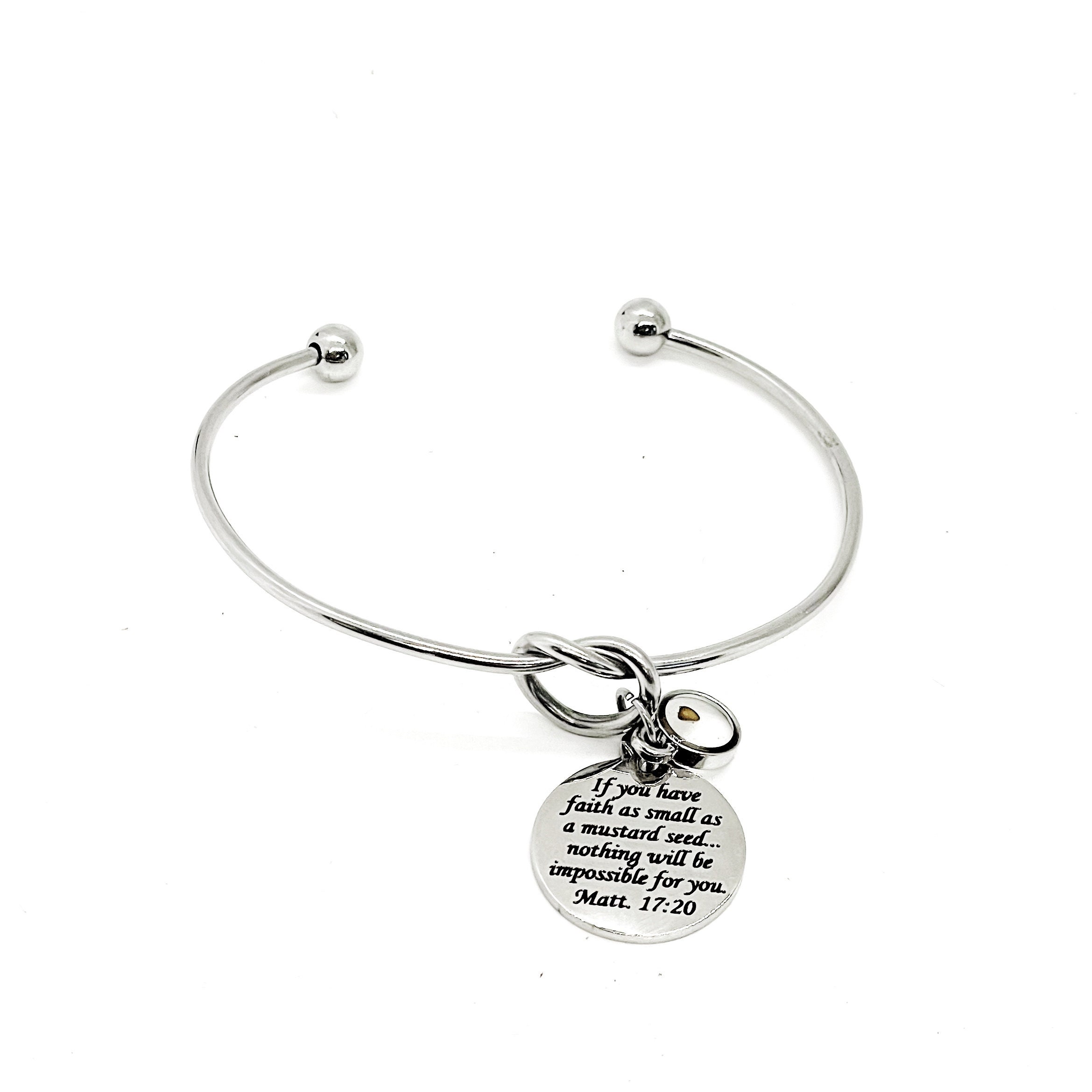 This is a beautiful knotted cuff bracelet with an engraved charm with the verse of Matthew 17:20 and a small mustard seed charm to remind us that with the faith of a mustard seed we can move mountains.