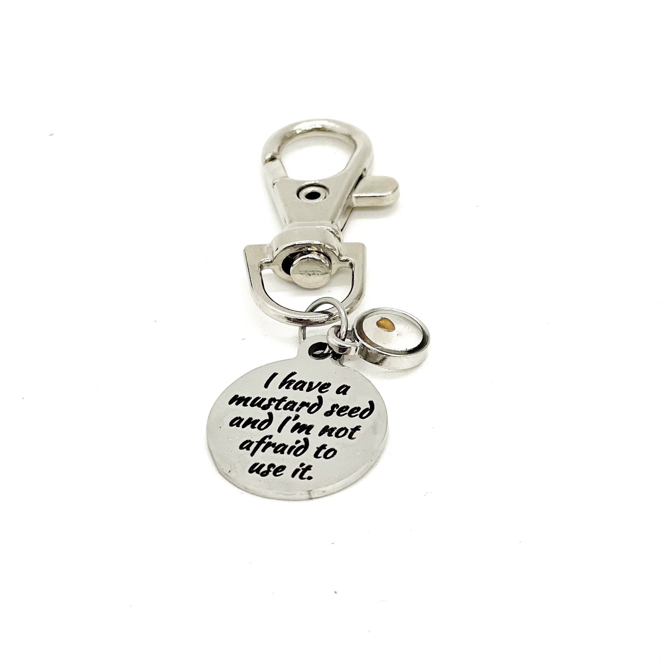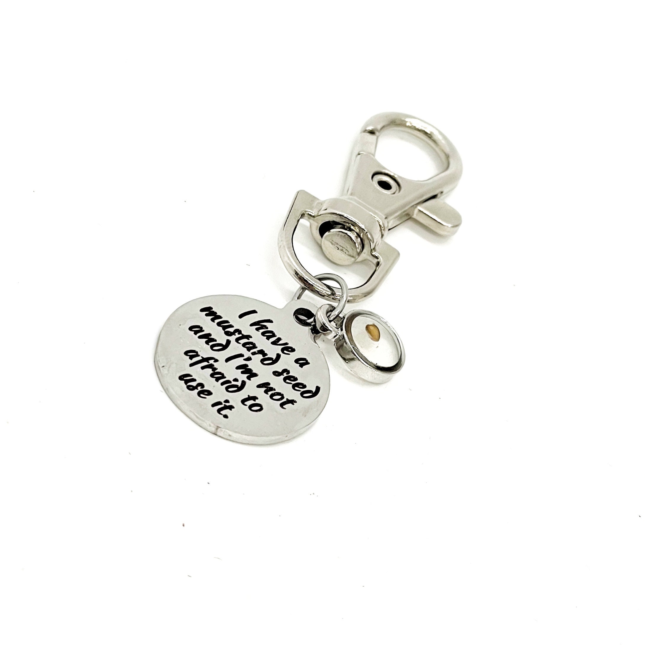 This is a great zipper pull or bag charm clip gift that would be a great faith gift. It would be a great charm to clip onto a tote, purse, sports bag, book bag or keychain. It has a stainless steel engraved charm with “I have a mustard seed and I’m not afraid to use it” with a single mustard seed.