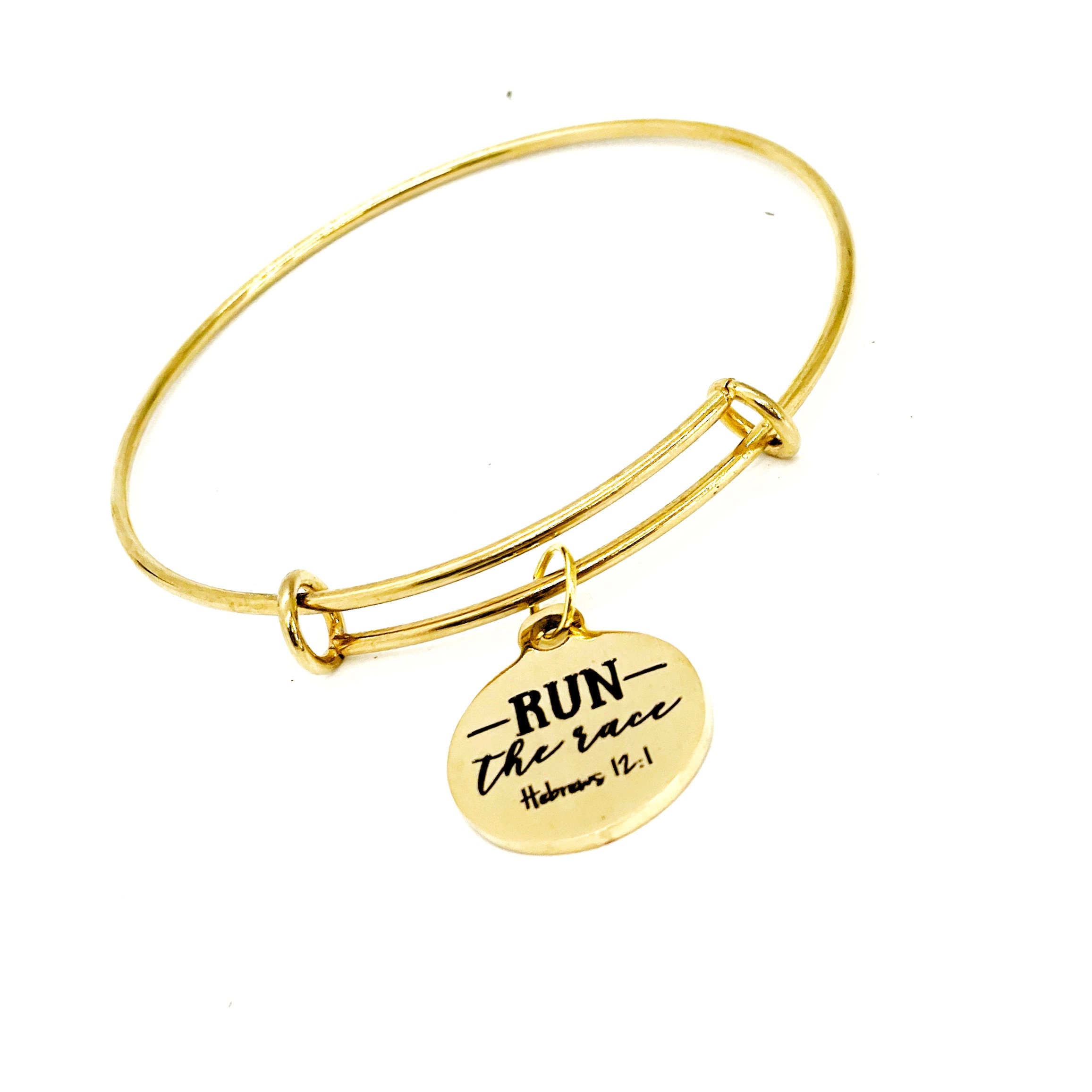 This beautiful expanding bangle has a gold-plated stainless steel laser engraved charm that has "Run the race" from Hebrews 12:1 on it. The bracelet expands to fit over your hand easily and returns to its shape after put on or taken off.