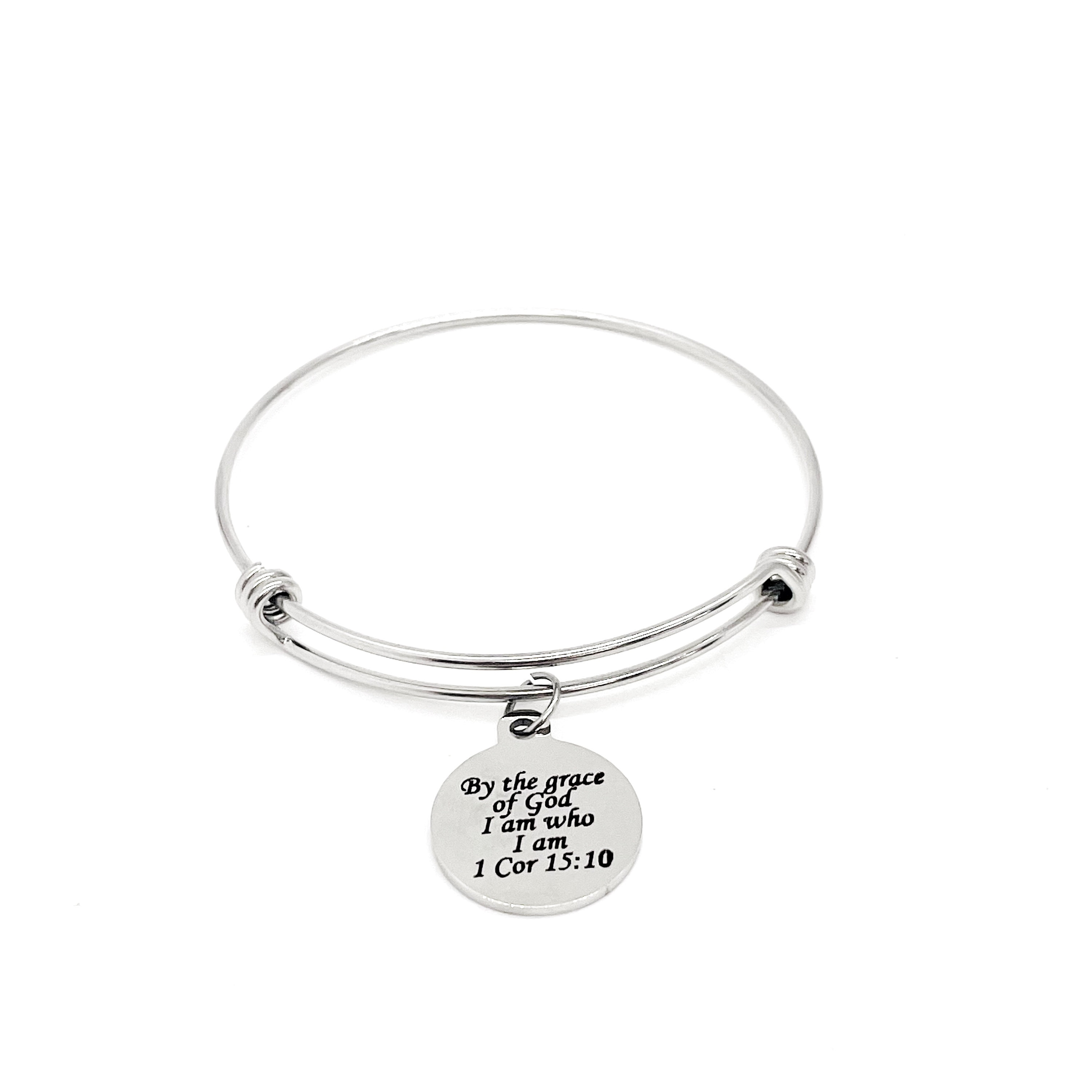 This is a beautiful bangle charm bracelet with a laser engraved stainless steel charm that has “By the grace of God I am who I am” 2 Corinthians 15 10 on it.
