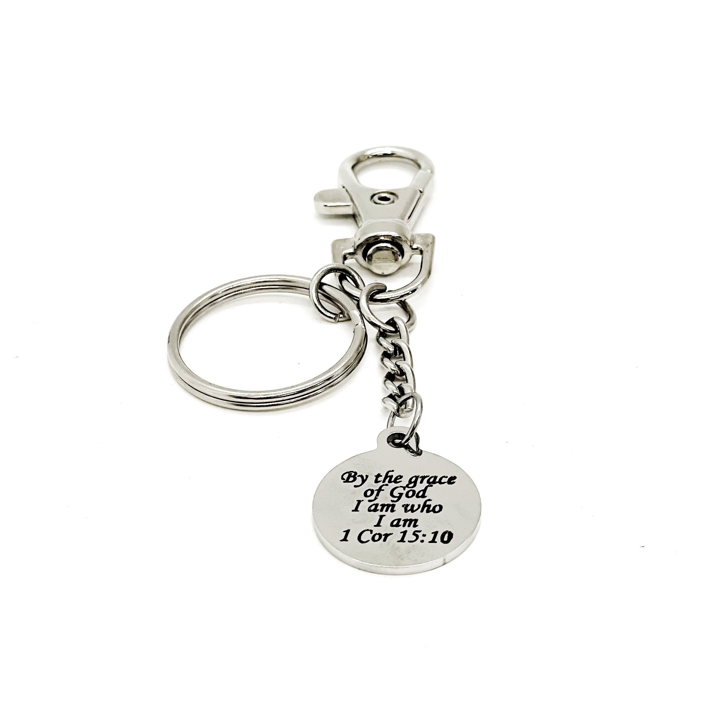 This is a great bible verse keychain gift . The keyring can be clipped onto your bag to make it easy to access without digging to the bottom of the bag. It has a stainless steel laser engraved charm with “By the grade of God I am who I am” from 1 Corinthians 15:10 from on it.