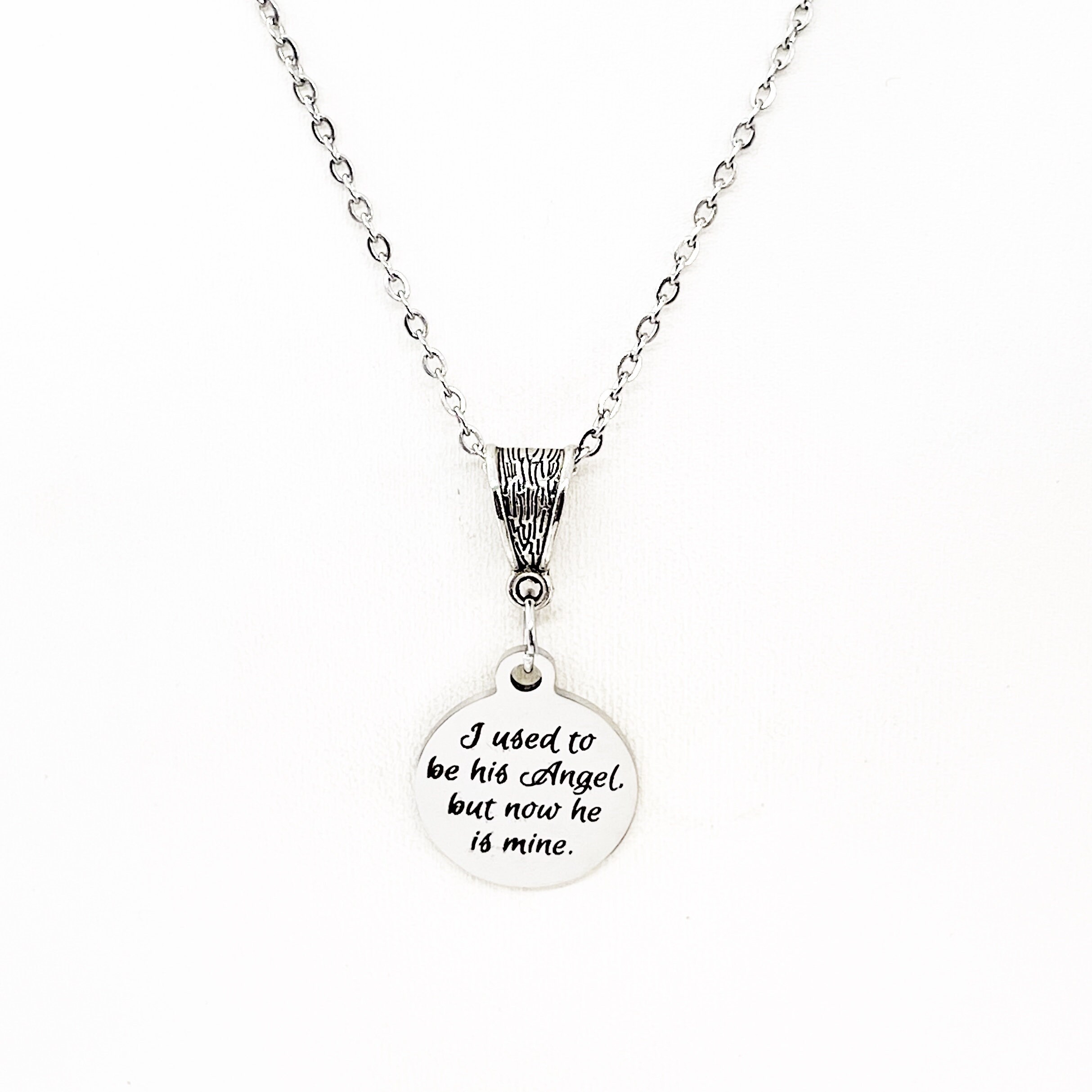 This beautiful necklace would make a great memorial jewelry piece to remember a loved one that is no longer with you. The pendant is a stainless steel laser engraved charm with “I used to be his Angel but now he is mine” on it with a silver-tone bail.