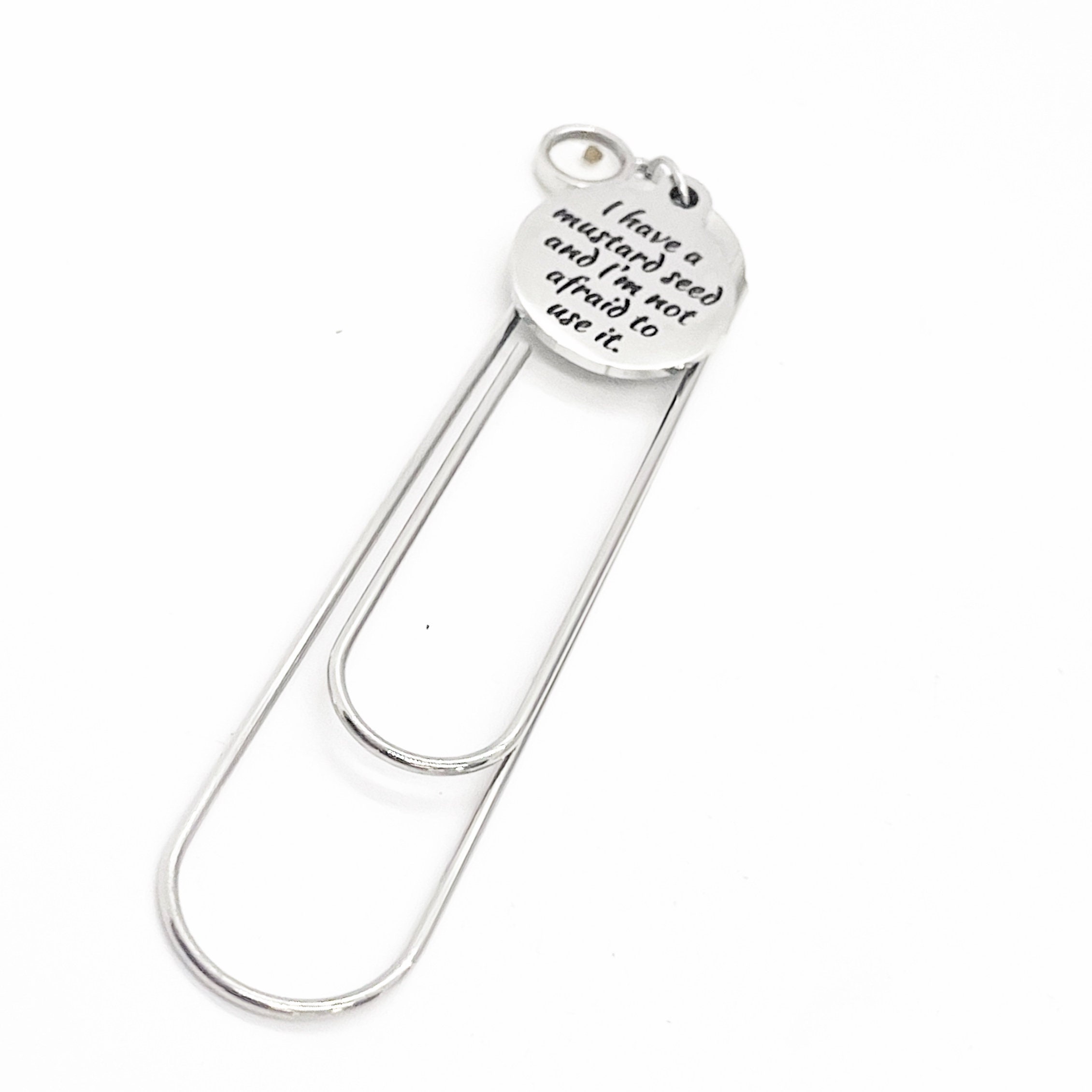 This bookmark has a stainless steel laser engraved charm with “I have a mustard seed and I’m not afraid to use it” on it along with a single mustard seed charm. It can be used as a bookmark, page marker, or planner book mark.