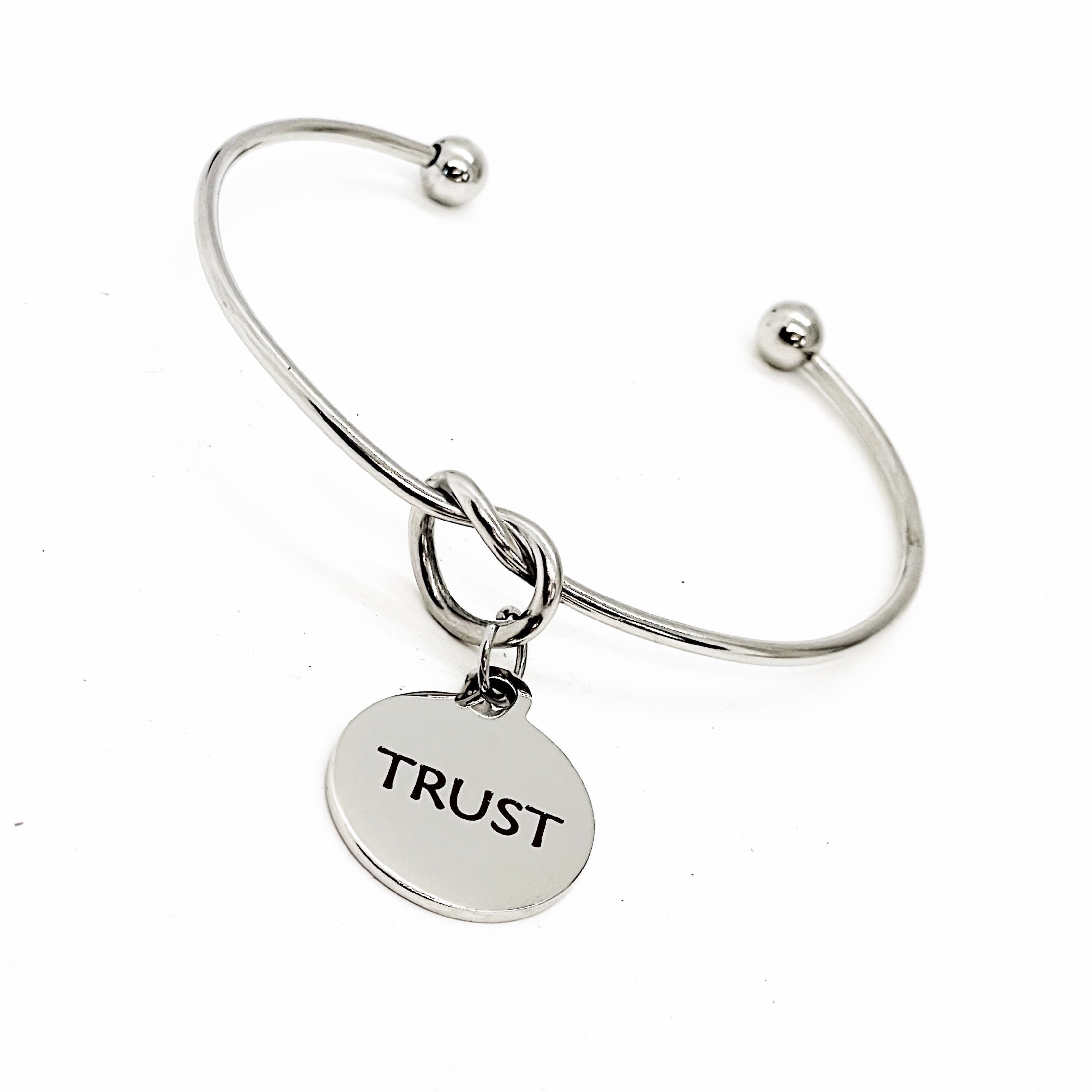 This is a beautiful knotted cuff bracelet with an engraved charm with “TRUST” on it.