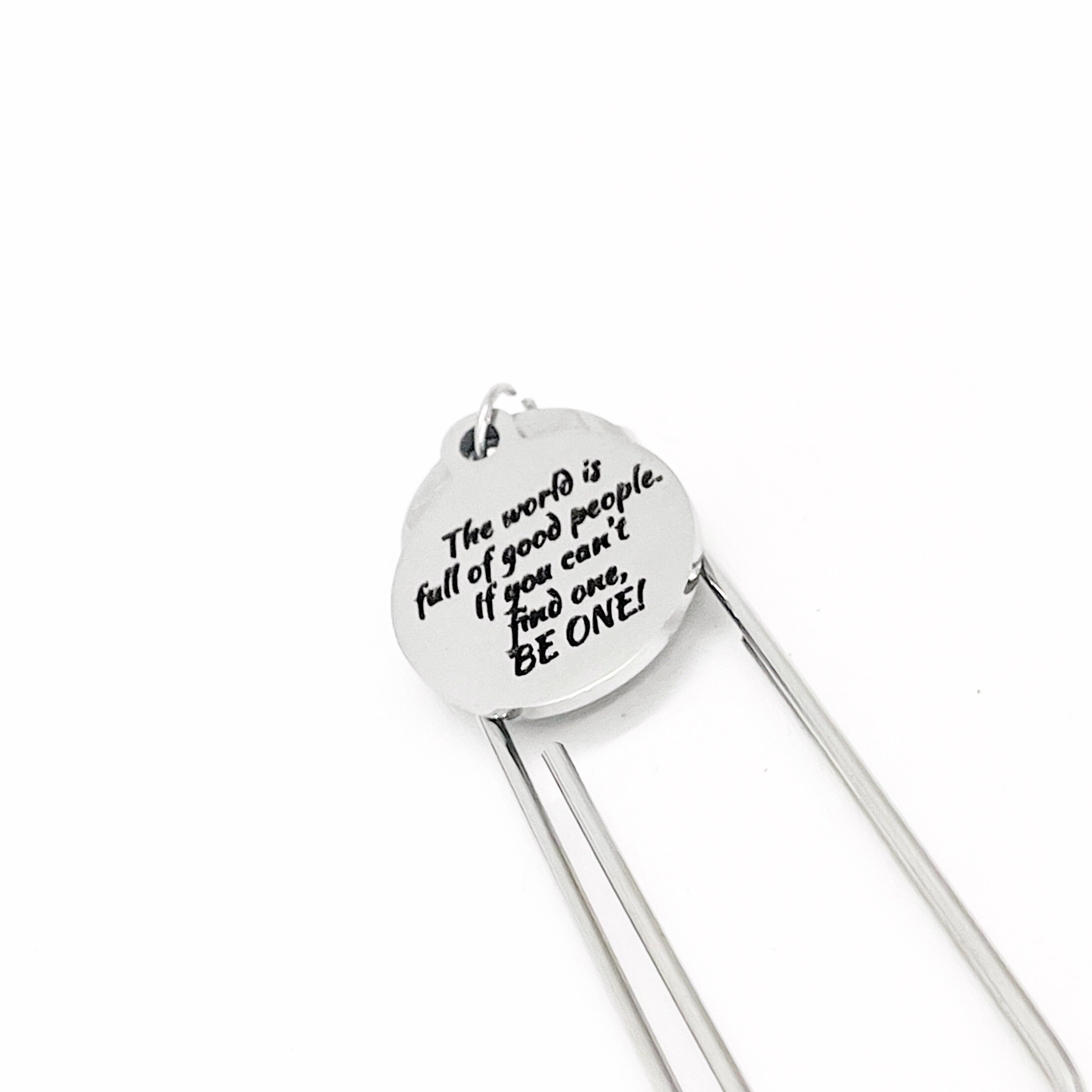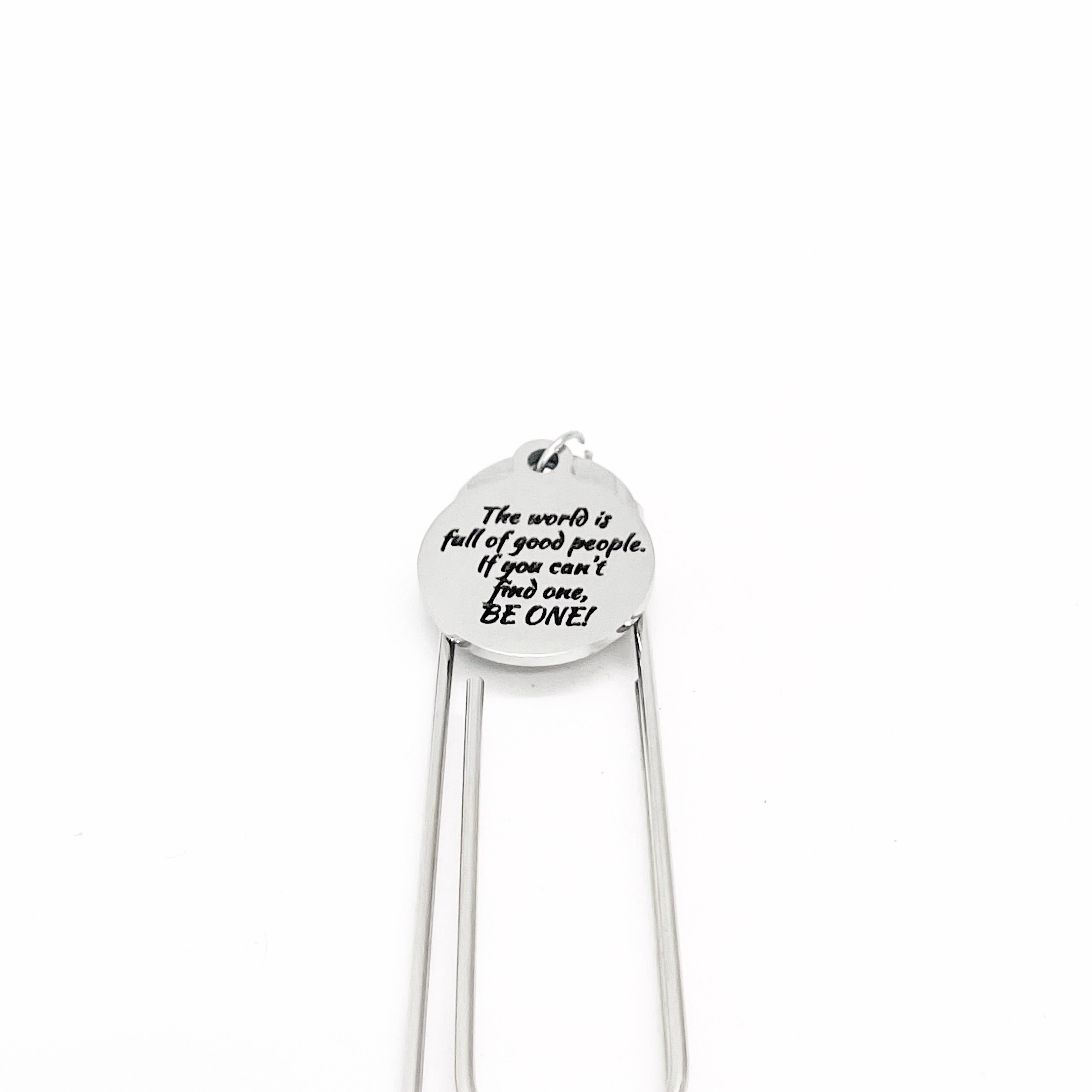 This is a great motivating gift bookmark. This paper clip bookmark has a stainless steel laser engraved charm with "The world if full of good people. If you can’t find one, but one" on it. It can be used as a Bible bookmark, page marker, or planner book mark.