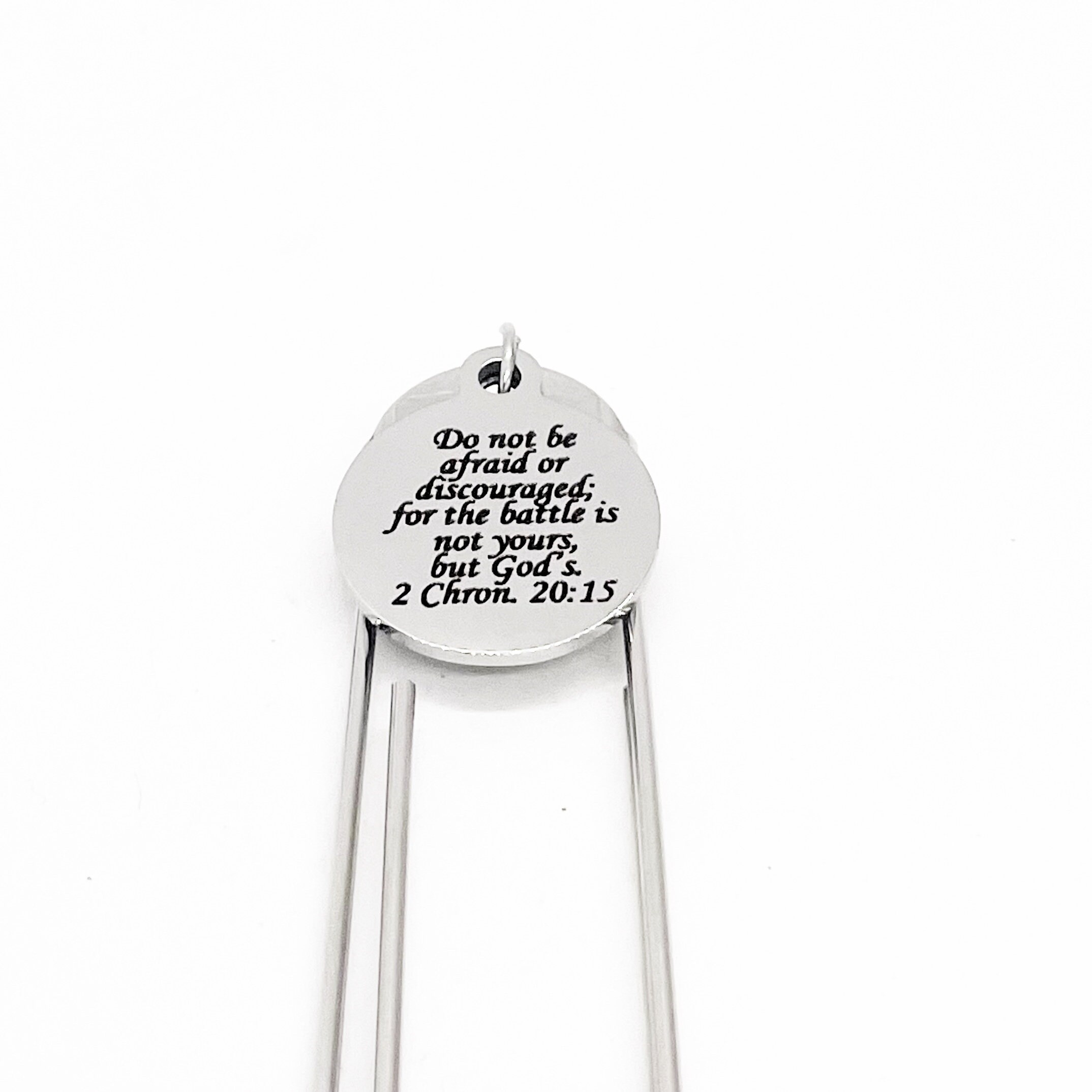 This is a great motivating gift bookmark. This paper clip bookmark has a stainless steel laser engraved charm with "Do not be afraid or discouraged; for the battle is not yours but God’s" from 2 Chronicles 20:15 on it. It can be used as a Bible bookmark, page marker, or planner book mark.