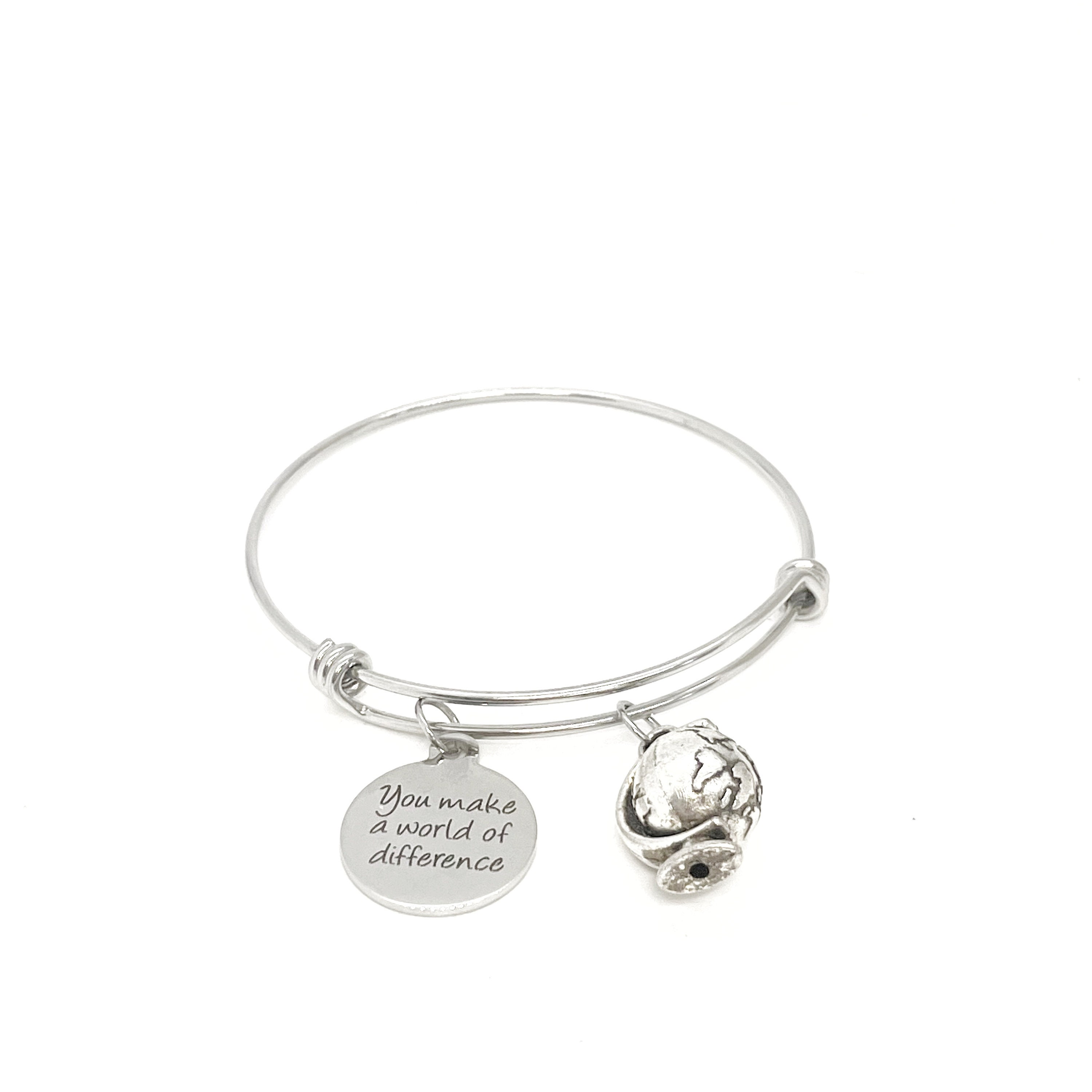 This is a beautiful stainless steel bracelet with stainless steel engraved charm with “You make a world of difference” on it with a silvertone globe charm.