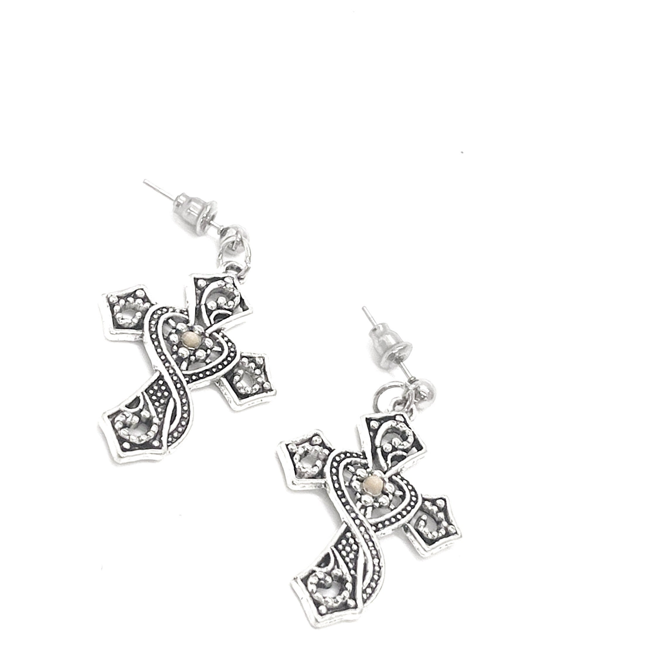 This is a unique and great set of statement earrings. They are made to represent mustard seed faith as described in Matthew 17:20. These would be great earrings to remind yourself or someone that you love that you can move mountains with faith as small as a mustard seed. The drop is a silvertone metal and are placed on stainless steel posts. The cross measures approx. 1.5 inch long.