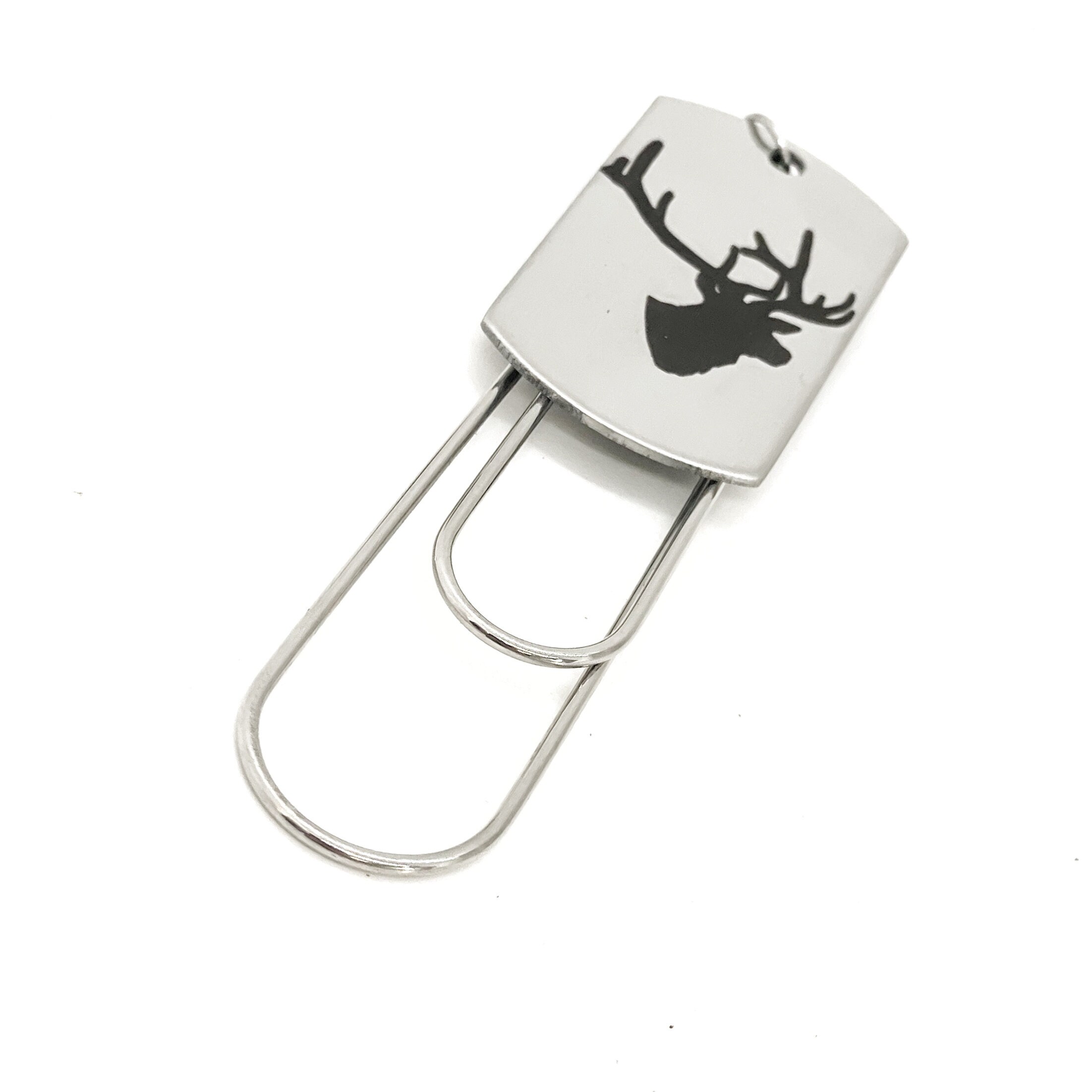 This is a great gift bookmark. This paper clip bookmark has a stainless steel laser engraved charm with deer head and horns on it. It can be used as a bookmark, page marker, or planner book mark.