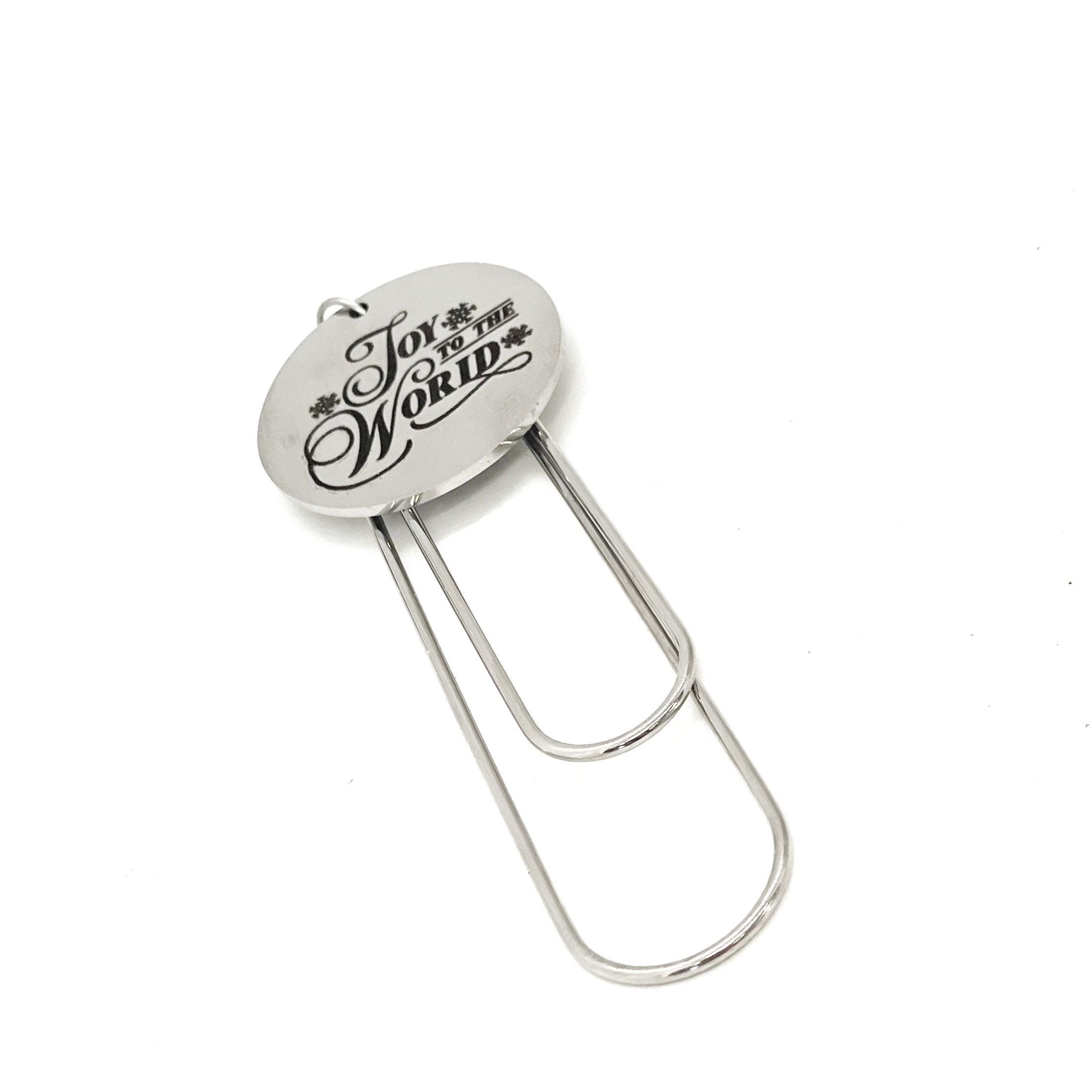 This is a great gift bookmark. This paper clip bookmark has a stainless steel laser engraved charm with “Joy to the world” on it. It can be used as a bookmark, page marker, or planner book mark.
