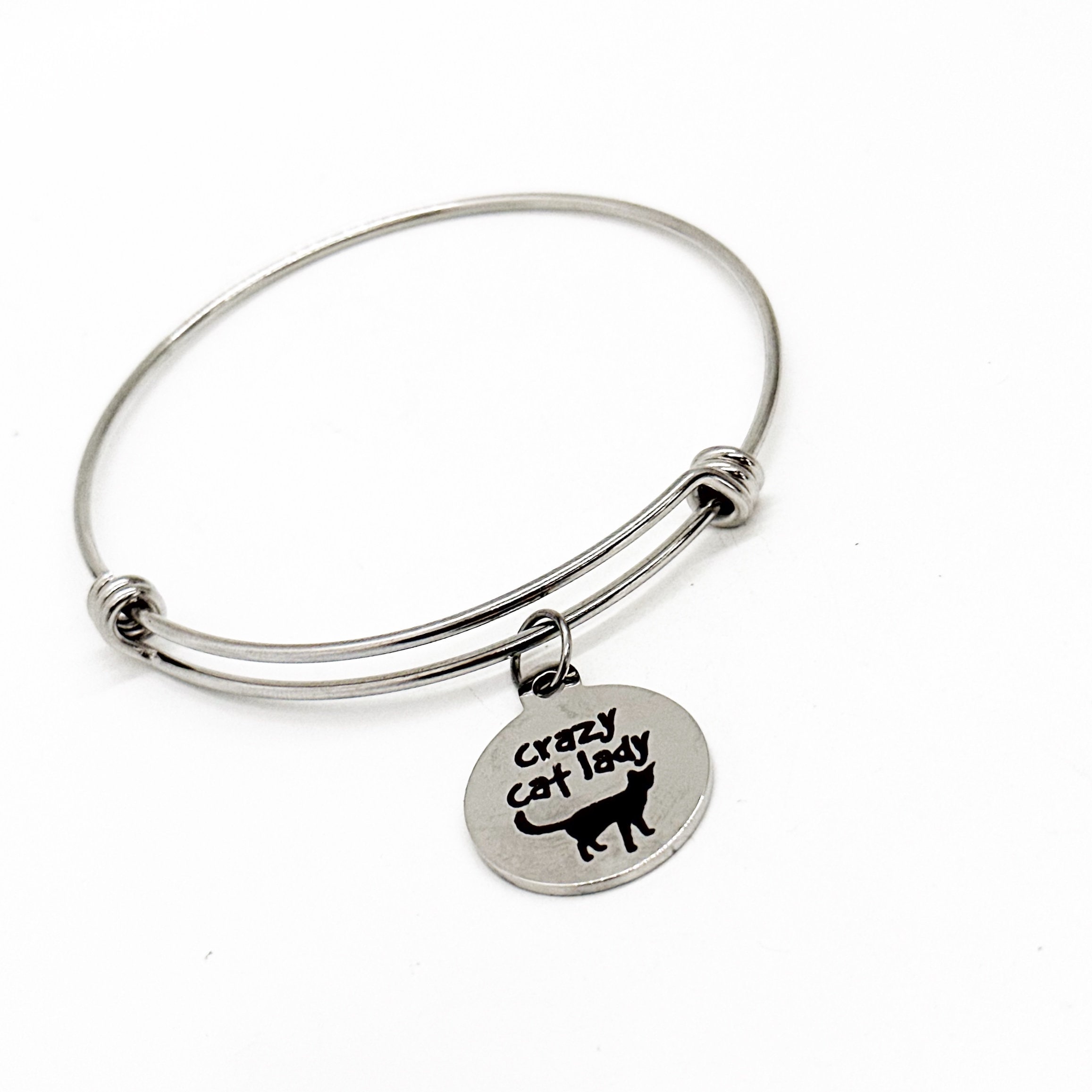 This is a beautiful bangle bracelet with a stainless steel laser engraved charm with “Crazy Cat Lady” on it.