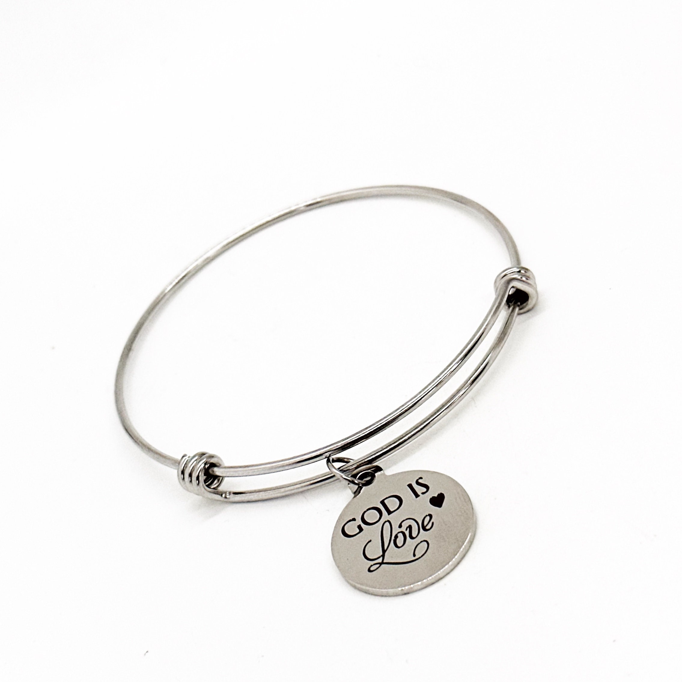 This is a beautiful bangle bracelet with a stainless steel laser engraved charm with “God is Love” on it.
