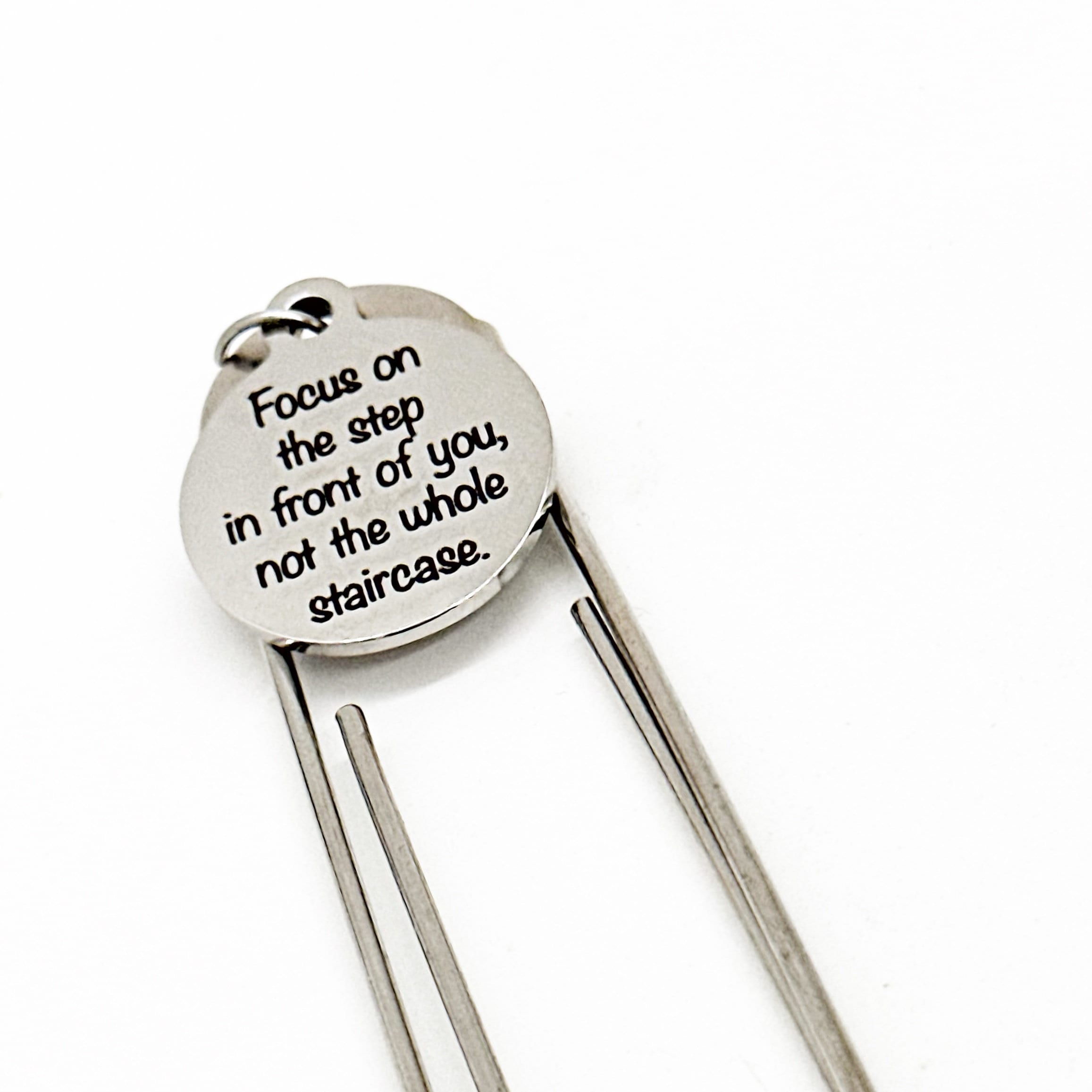 This bookmark has stainless steel laser engraved charm that has “Focus on the step in front of you, not the whole staircase” on it. This would be a great gift.