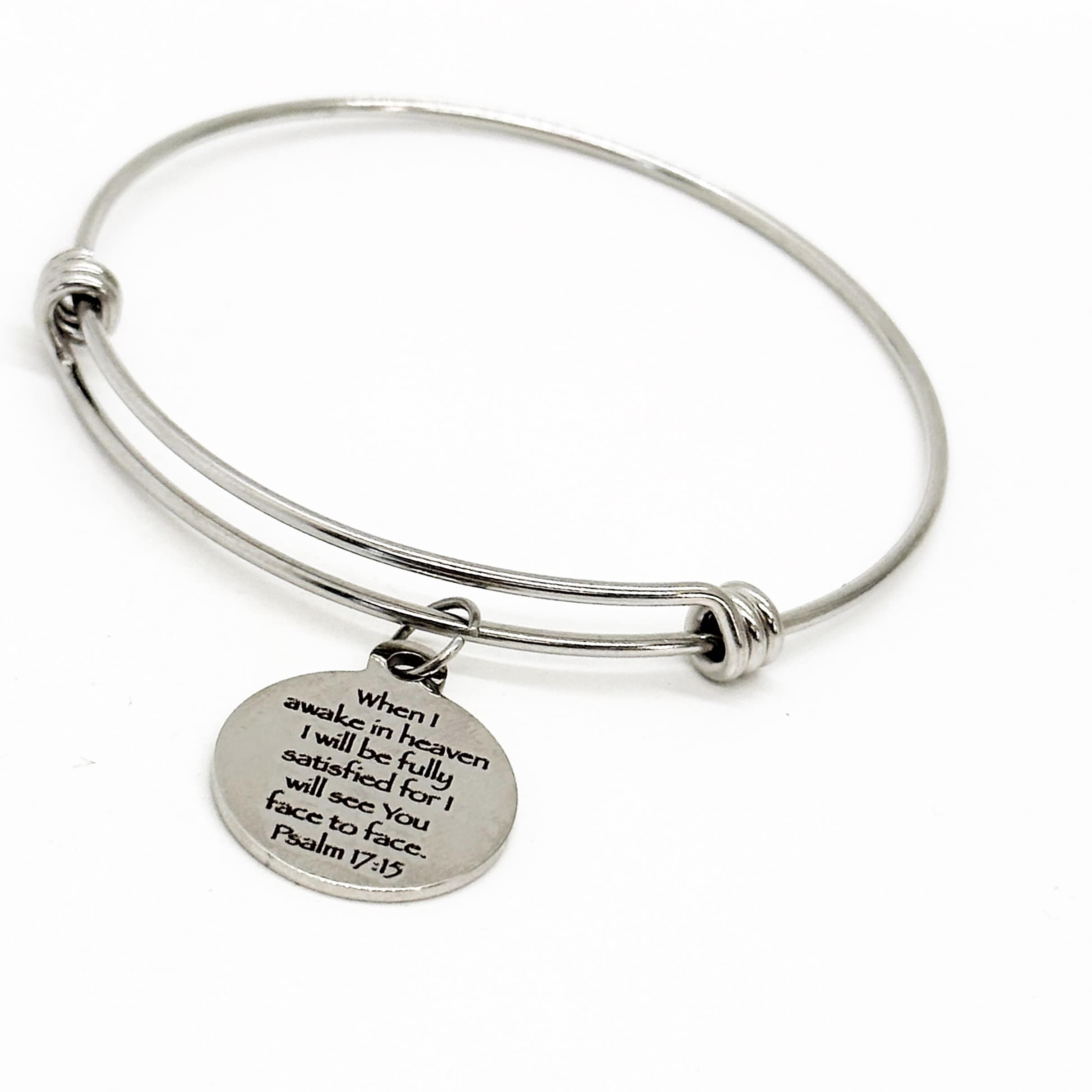 This is a beautiful bangle bracelet with a stainless steel laser engraved charm with “When I awake in heaven, I will be fully satisfied for I will see You face to face” from Psalm 17:15 on it.