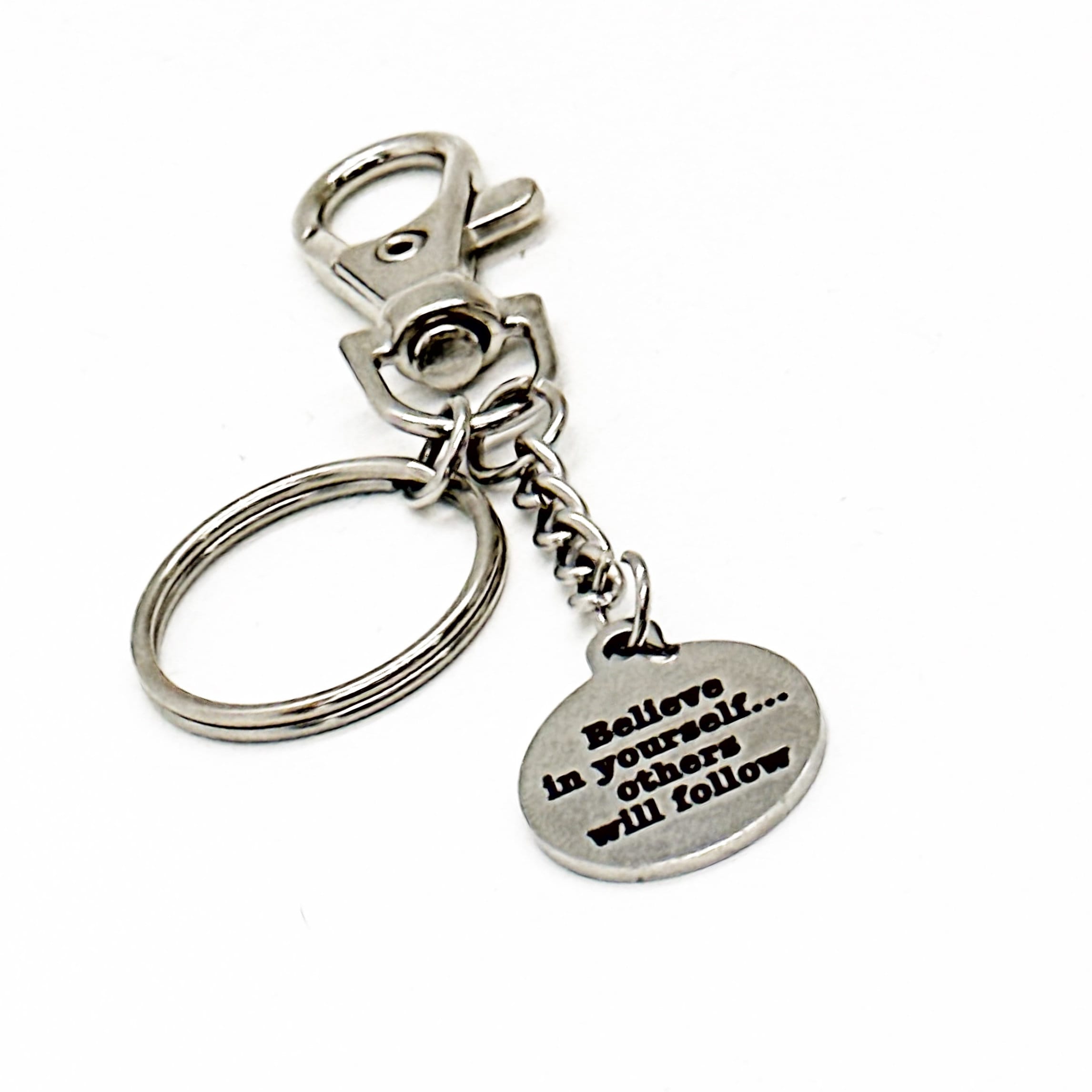 This is a great keychain gift . The keyring can be clipped onto your bag to make it easy to access without digging to the bottom of the bag. It has a stainless steel laser engraved charm with “Believe in yourself… others will follow” on it. The charm measures approx. 3/4 inch across.
