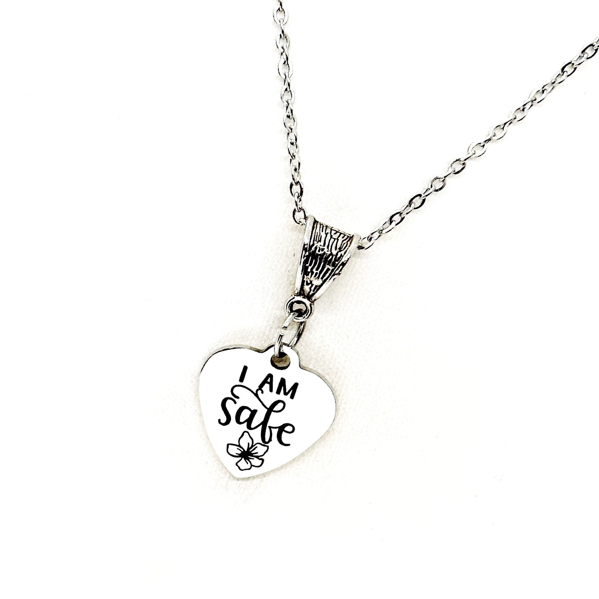 The is a beautiful jewelry piece that has a stainless steel laser engraved charm with “I am safe” on it.