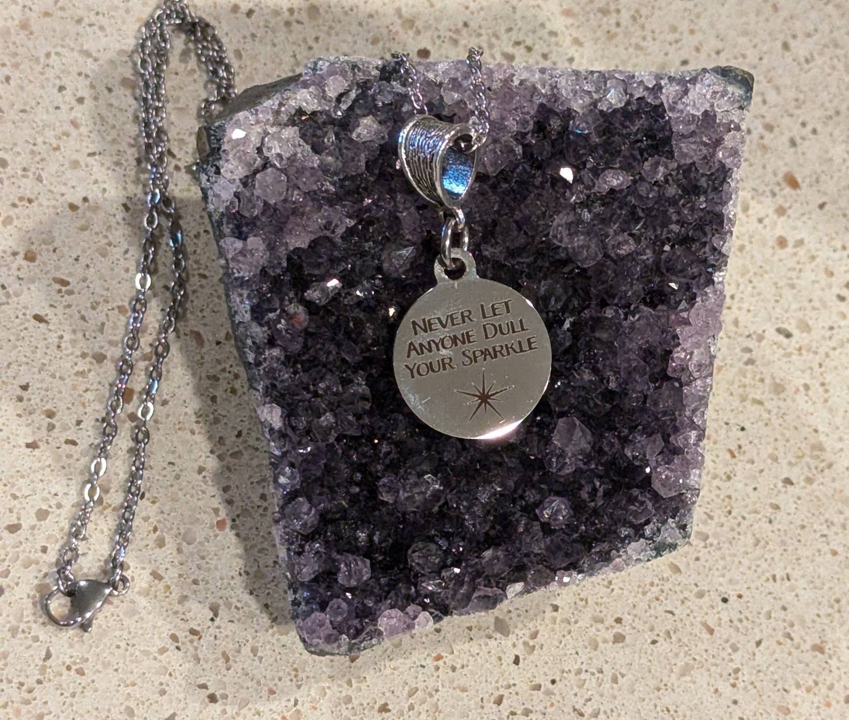 The is a beautiful jewelry piece that has a stainless steel laser engraved charm with “Never let anyone dull your sparkle” on it.