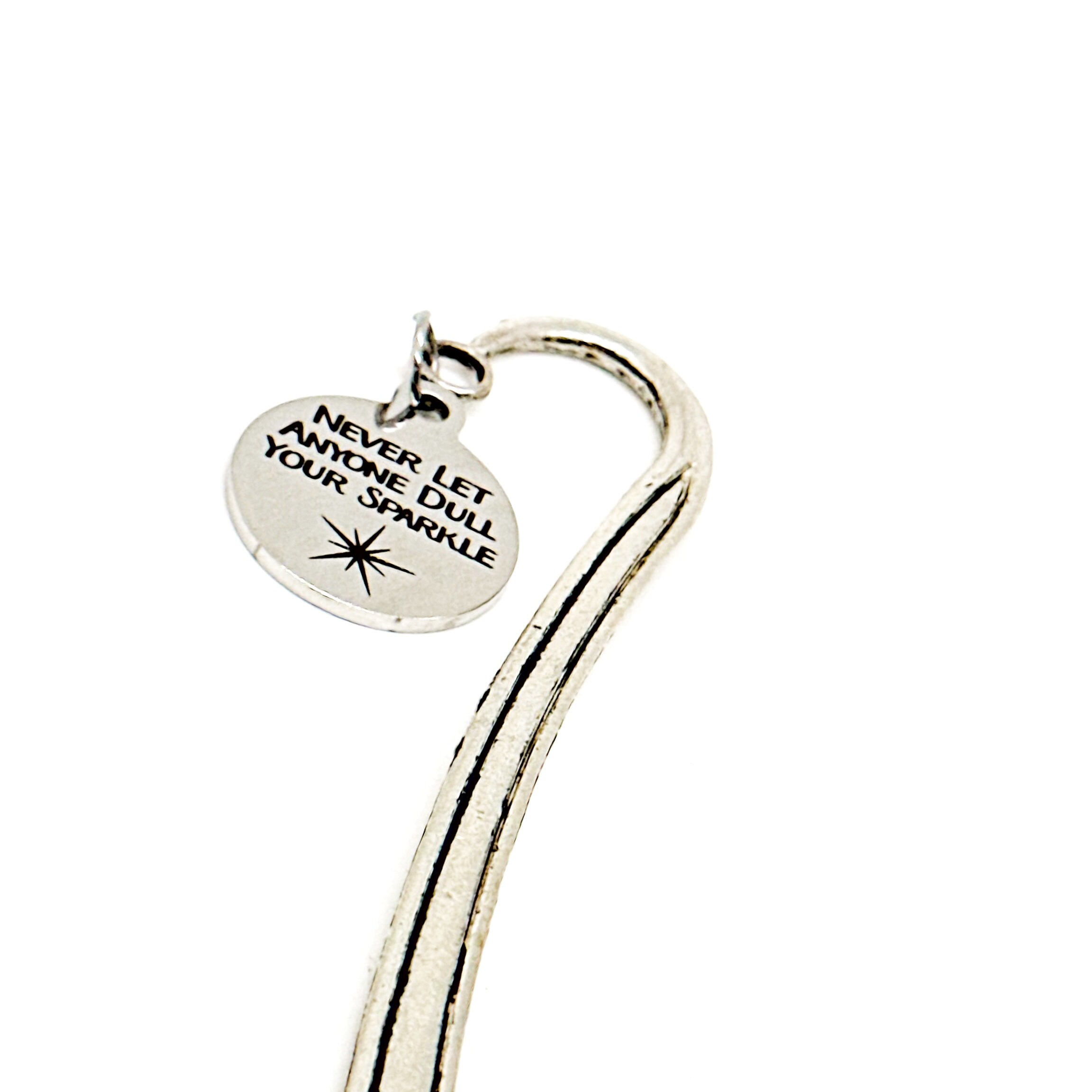This bookmark would be a great encouraging planner gift bookmark or reader gift. It has a stainless steel engraved charm with “Never let anyone dull your sparkle” on it.