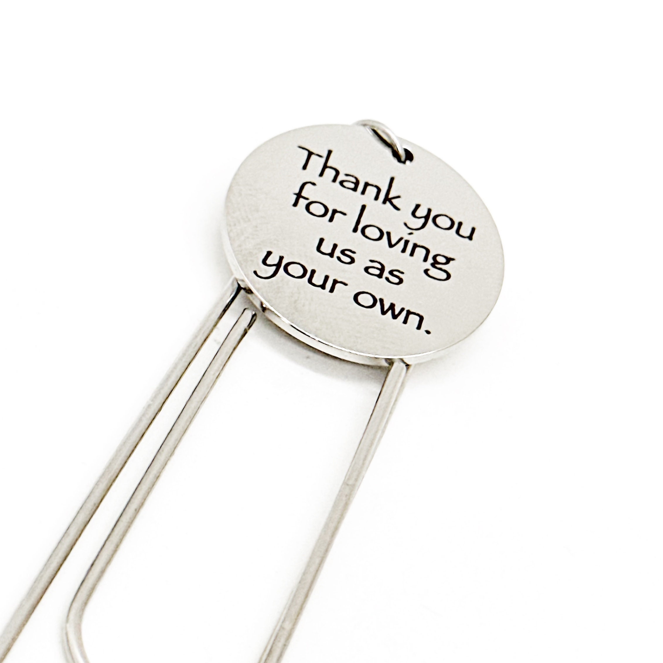 This is a great gift bookmark. This paper clip bookmark has a stainless steel laser engraved charm with “Thank you for loving us as your own" on it. It can be used as a Bible bookmark, page marker, or planner book mark.